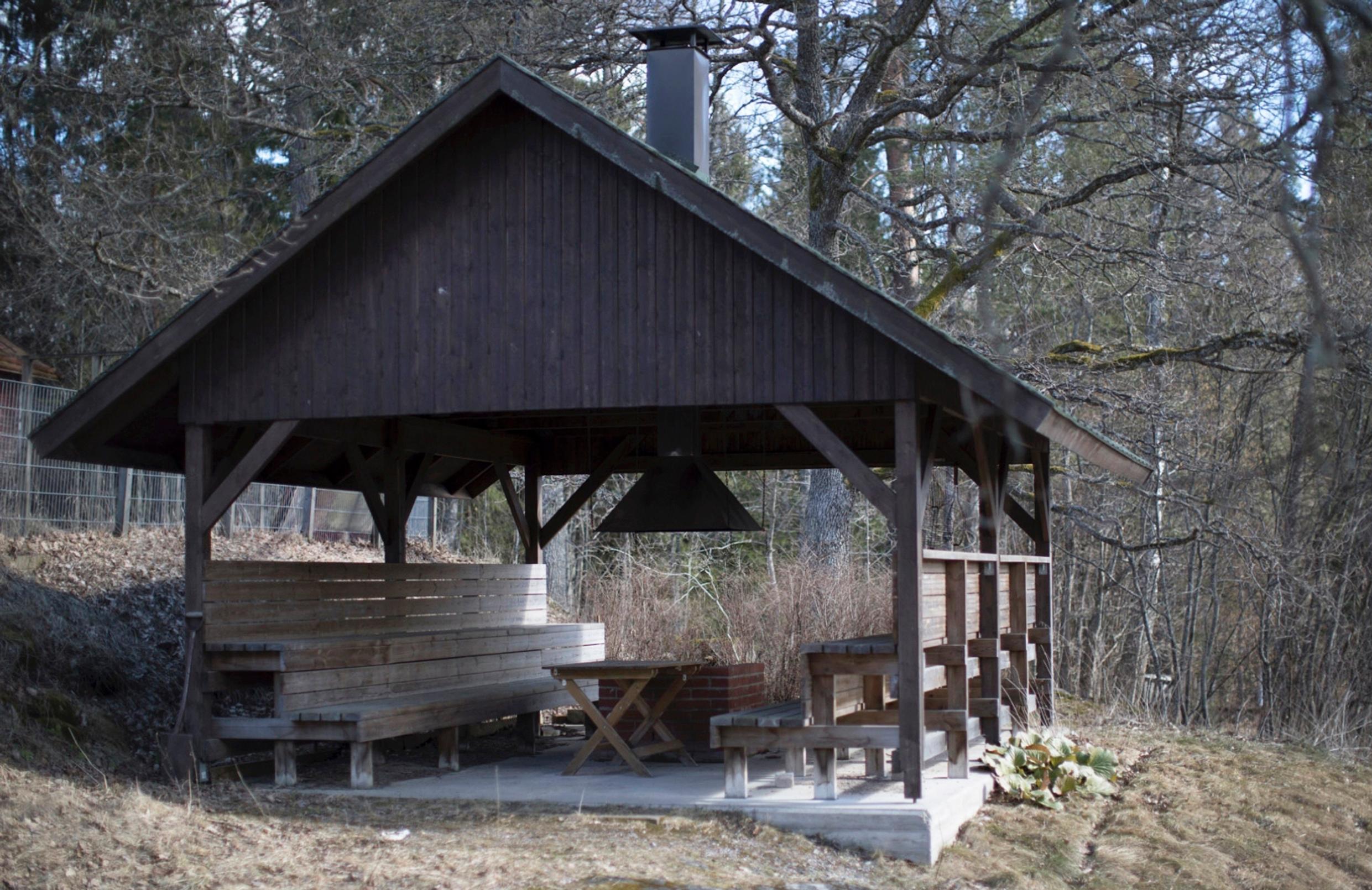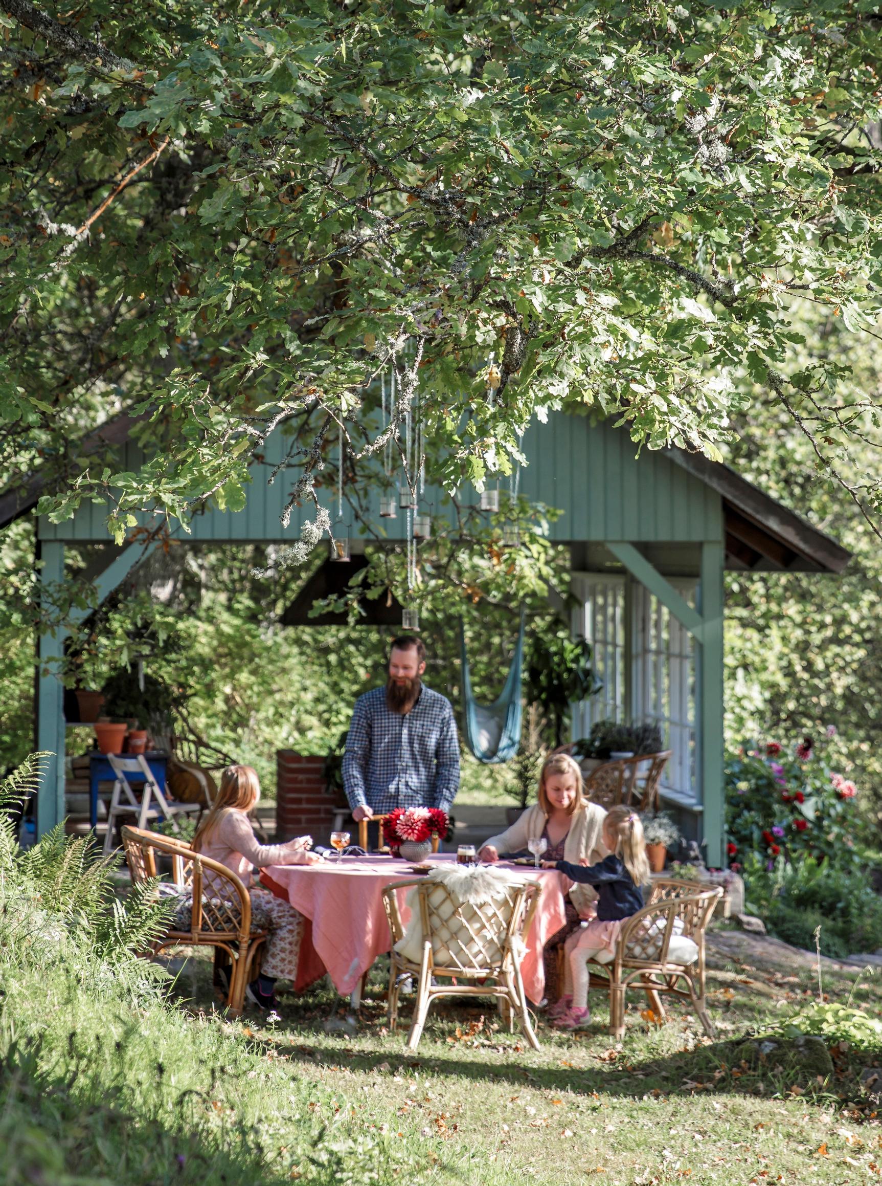 ”Asumme entisessä kyläkoulussa. 1990-luvulla tänne oli rakennettu grillikatos leirikoulun käyttöön. Penkeille mahtui yhtaikaa kymmeniä koululaisia iltanuotiolle. Meidän nelihenkiselle, kokkailusta pitävälle perheellemme katos ei ollut sellaisenaan toimiva, joten aloimme kehittää sitä kesäkeittiöksi.