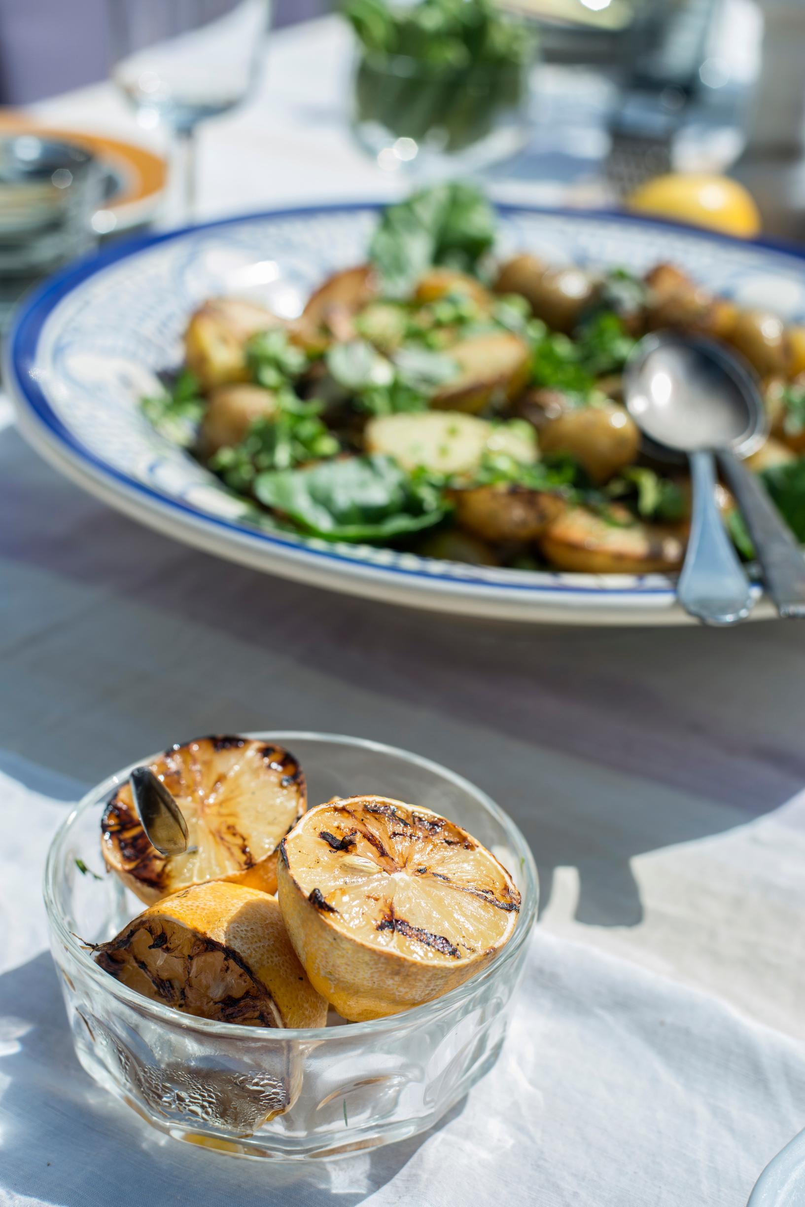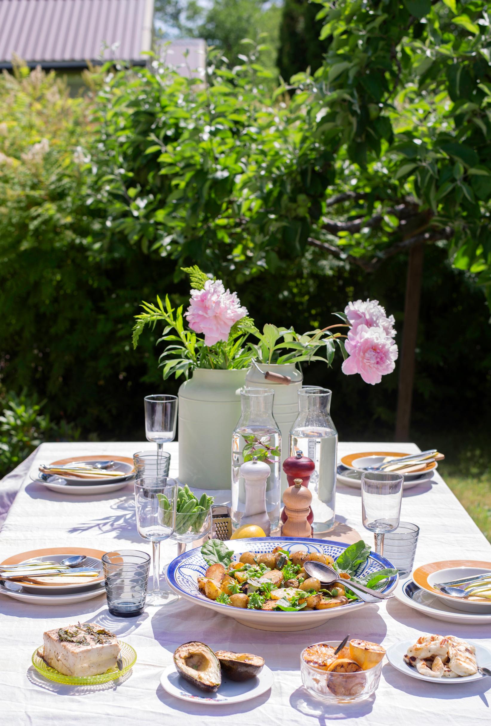 Syömme pääsääntöisesti ulkona, sään salliessa. Ruoka on usein grillattua, salaatteja tai muuten helppoja valmistaa ilman uunia ja erikoisia välineitä. Bravuurini on kesäkeitto. Tiskipaikka on myös ulkona. Juomavesi haetaan mökkialueen yhteisestä vesihanasta. On tässä oma viehätyksensä, mutta kyllä sitä tiskattavaa aina riittää. Olen oppinut arvostamaan kaupunkiasunnon itsestään selviä mukavuuksia.