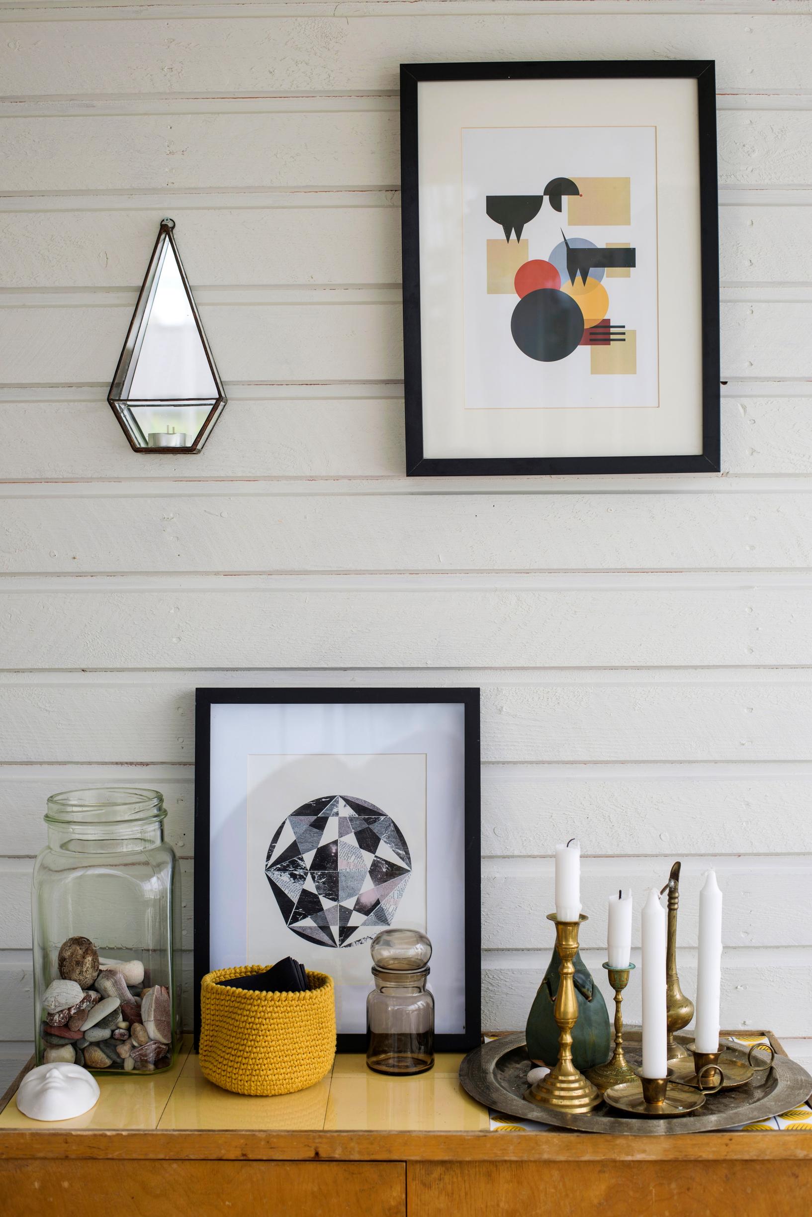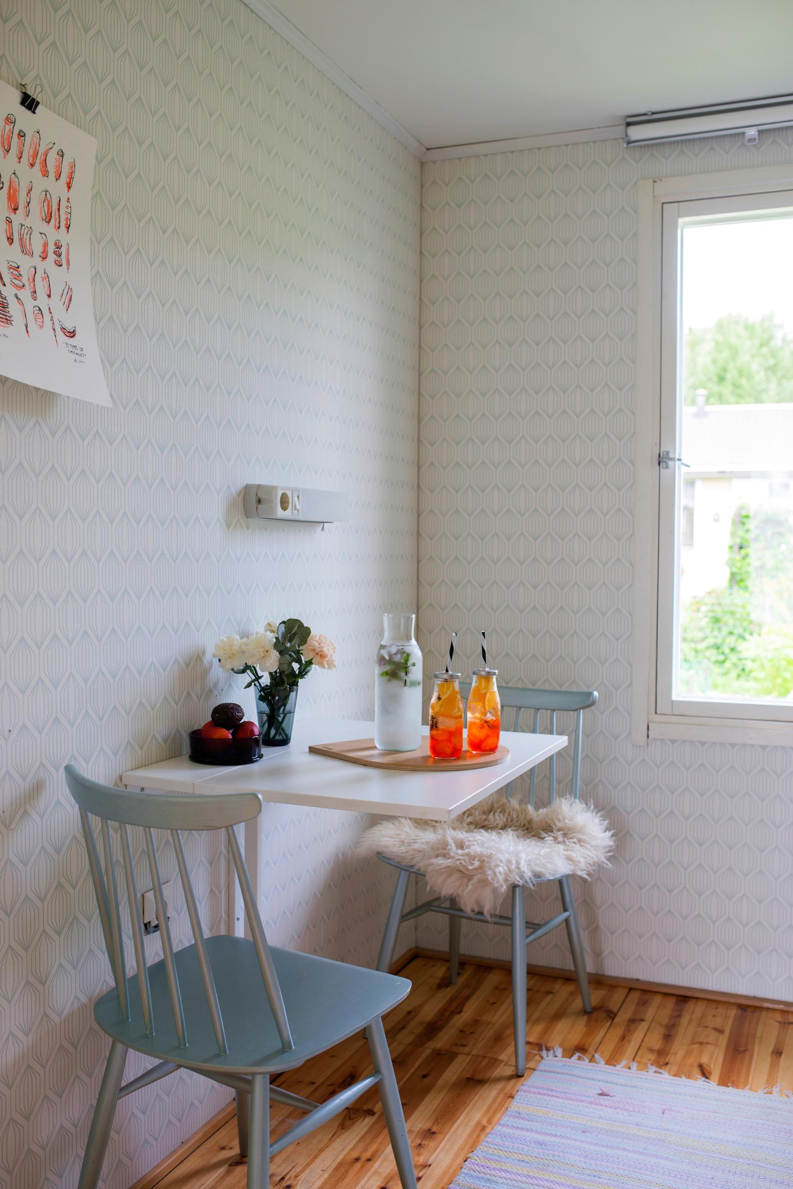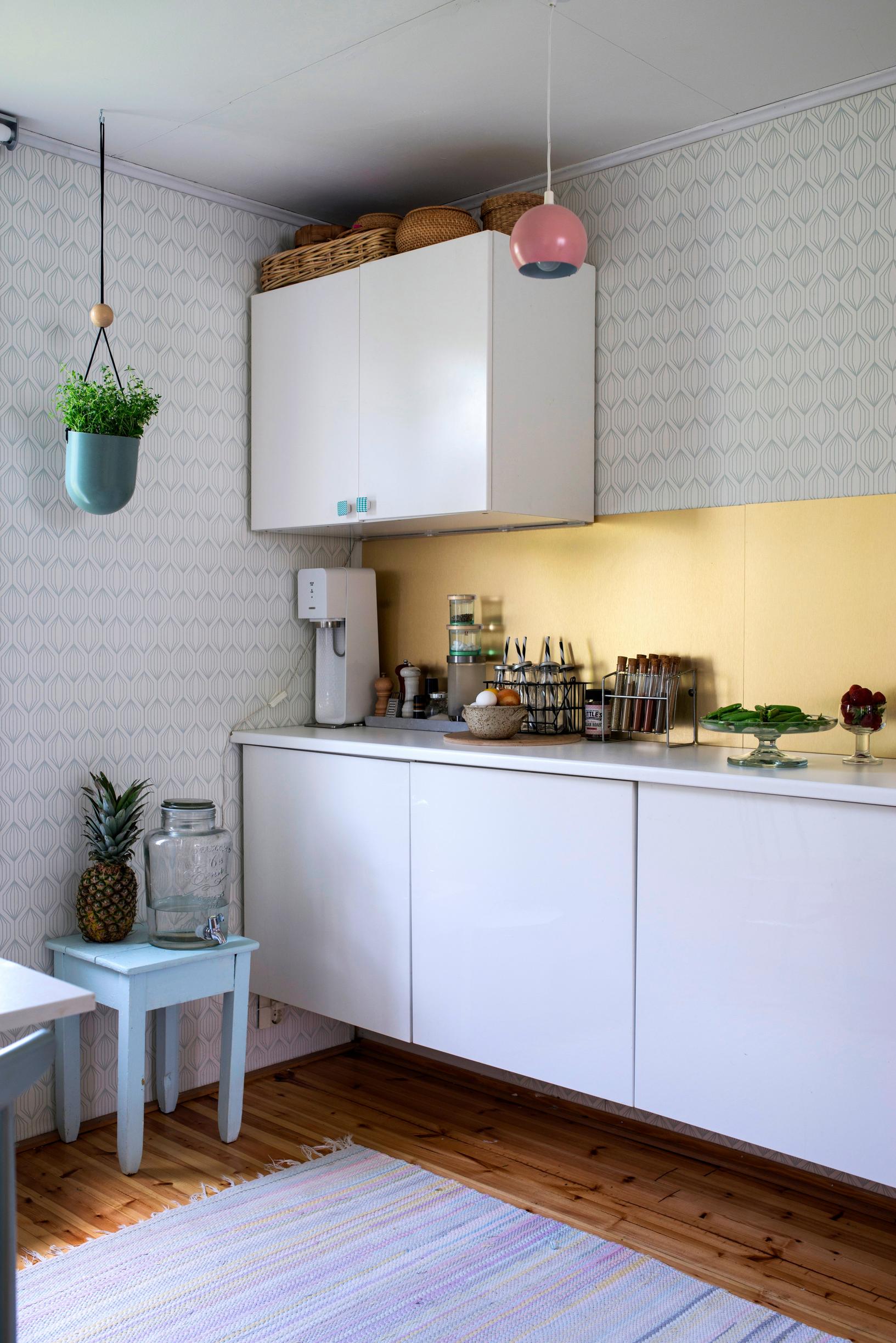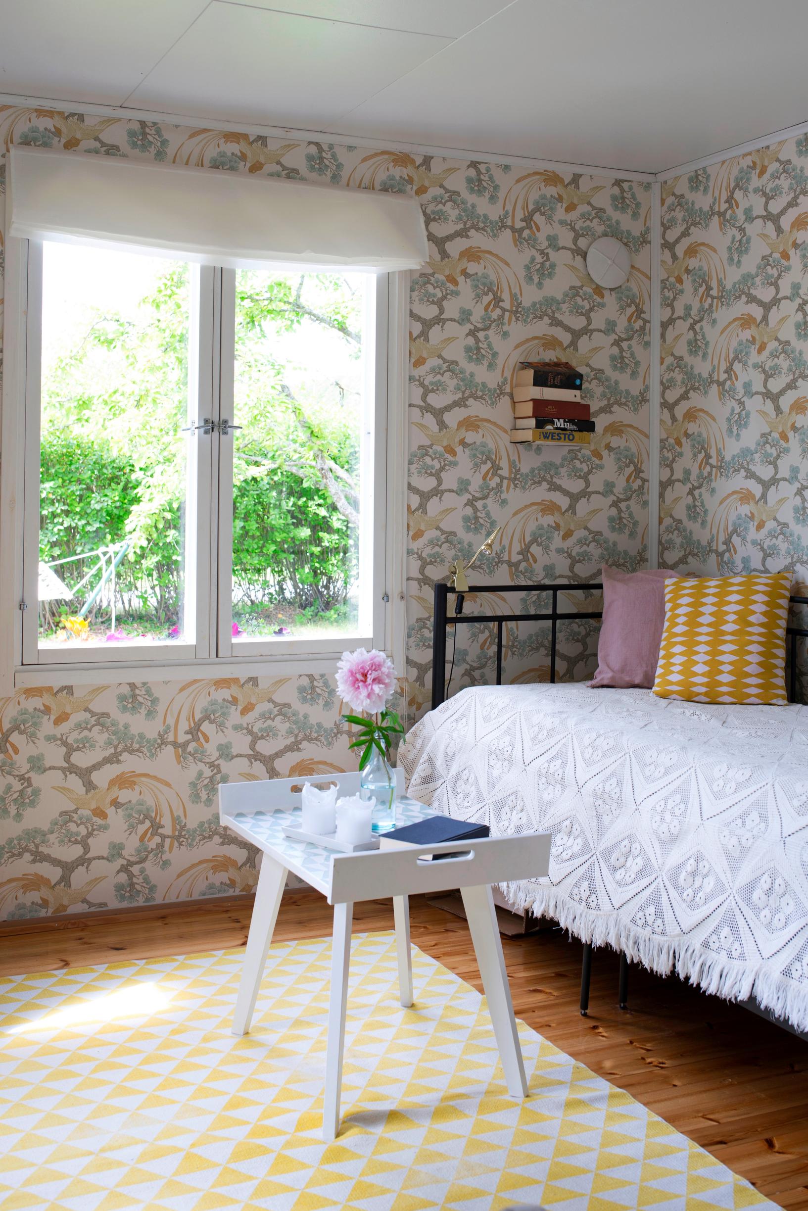Sisällä laitoimme jokaiseen huoneeseen tapettia. Kotona meillä on graafisempia tapetteja, täällä tapetit ovat pehmeämpiä, mökille sopivia. Mökillä pääsen sisustamaan mummolatyylillä. Remontoimme myös keittiön. Rakensimme alakaapit edellisen kaupunkiasuntomme kaapistoista.