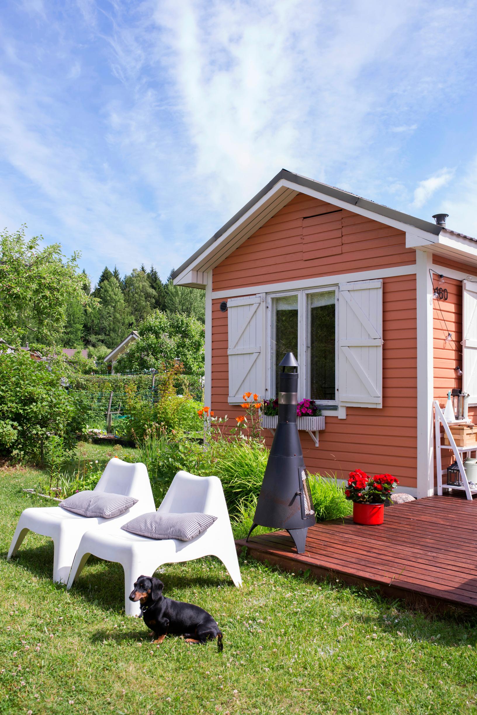 Terassi on tärkeä, sillä siellä olemme alusta alkaen viettäneet eniten aikaa. Seuraavana keväänä alkoi mökin pintojen kunnostaminen. Maalasimme talon ulkoa ja sisältä. Ulkomaalin sävy on mökkialueella määrätyn värinen, persikkaan vivahtava. Samanvärisiä mökkejä on alueella useita, eikä sävyä saa muuttaa.