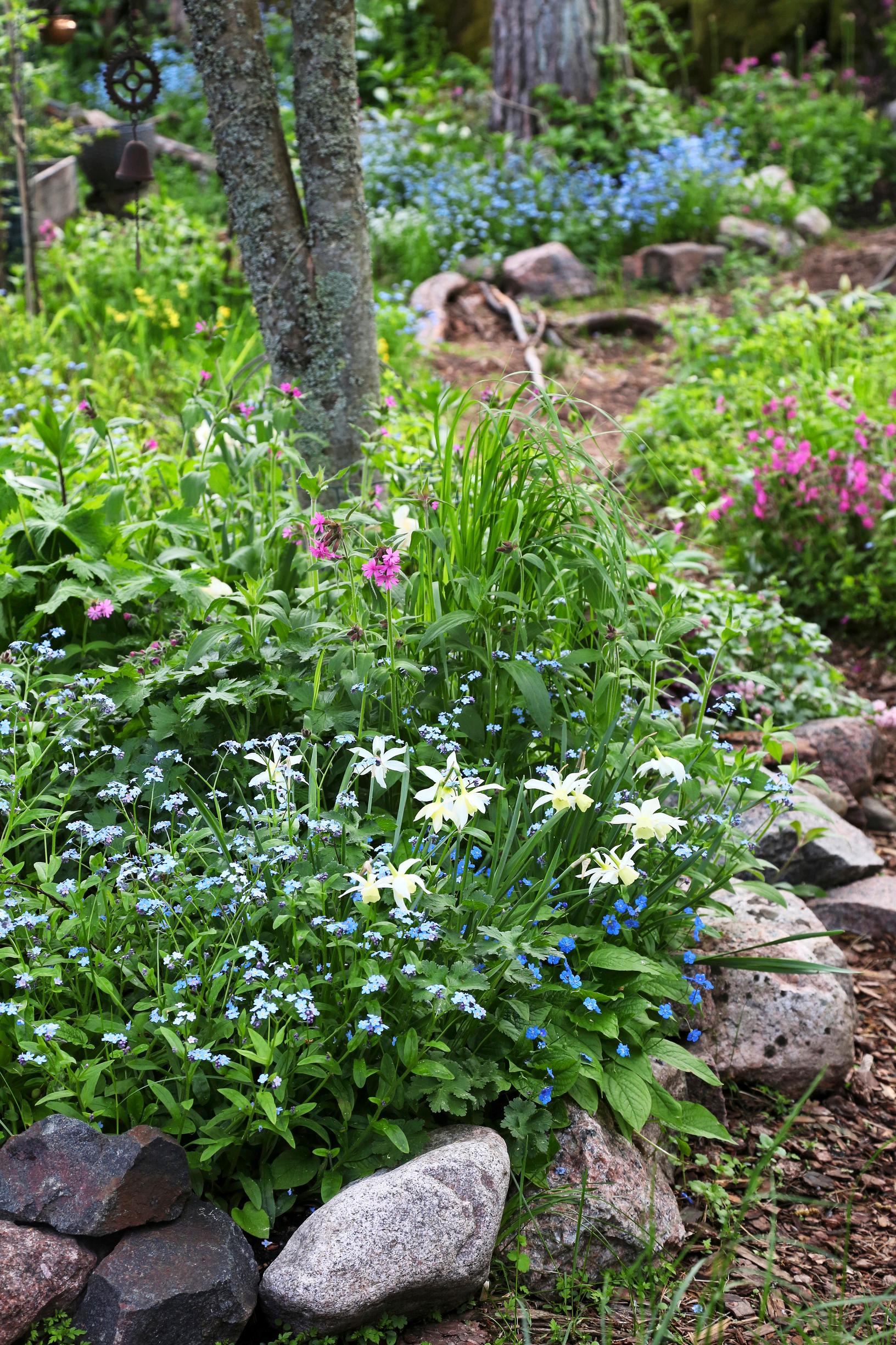 Mustikanvarpujen joukkoon Sanna on kylvänyt lemmikkiä ja puna-ailakkia, sillä hän rakastaa niiden herkkää ja siroa kukintaa. Vähitellen myös puutarhakasvit ovat löytäneet sijansa luonnonlajien rinnalta.