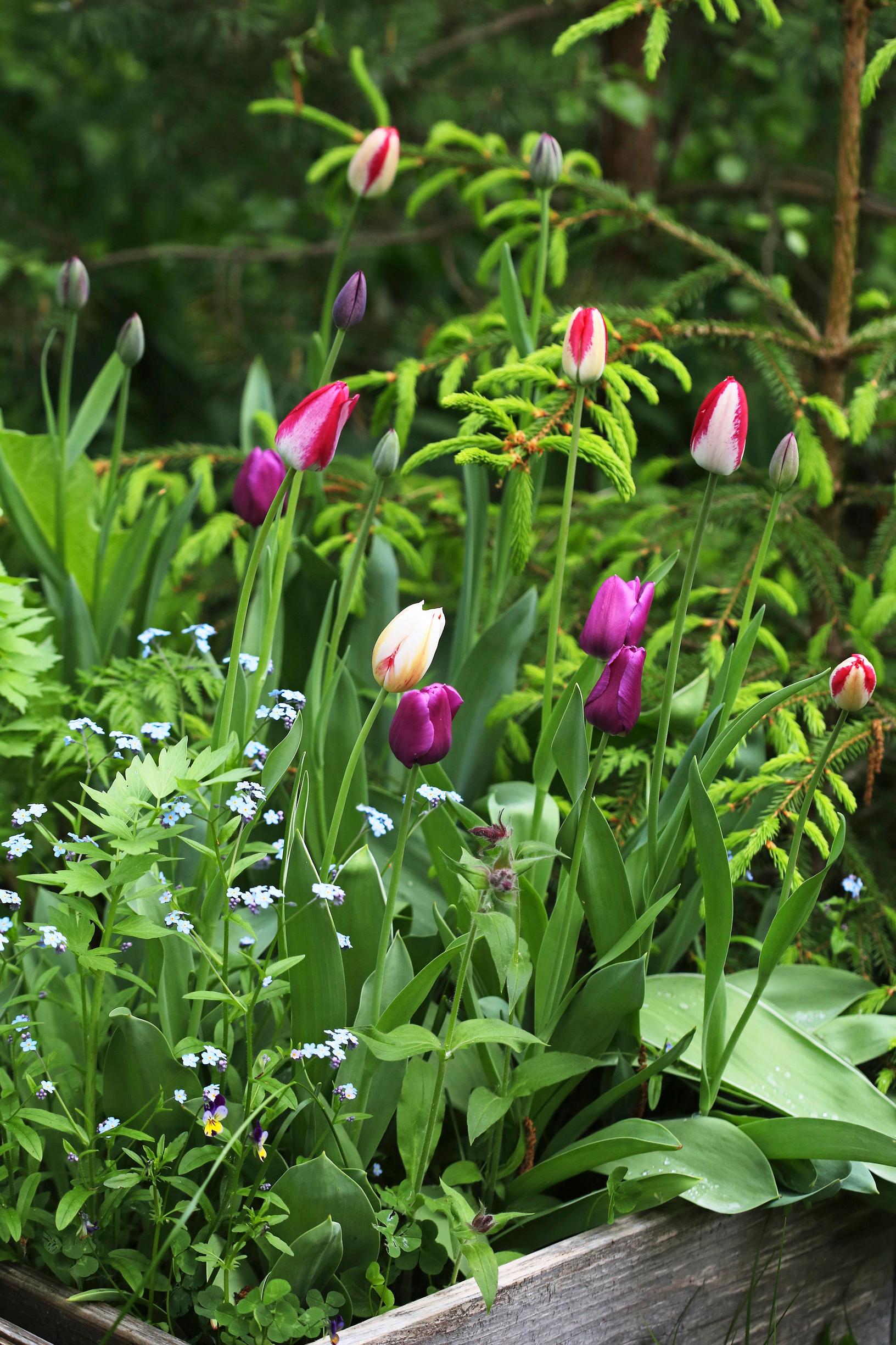 Kevät on metsäpuutarhassa herkkää aikaa, ja sitä juhlistaakseen Sanna on istuttanut runsaasti sipulikukkia ja muita kevätkukkijoita. Määrät lisääntyvät vuosi vuodelta, sillä joka syksy hän sujauttaa maahan uusia pikkusipulikukkien ja narsissien sipuleita. Varhain keväällä ilahduttavat kevätkurjenmiekat ovat osoittautuneet Sannasta yllättävän helpoiksi. Tulppaanit sen sijaan eivät ole menestyneet, satojen sipulien yrityksistä huolimatta.