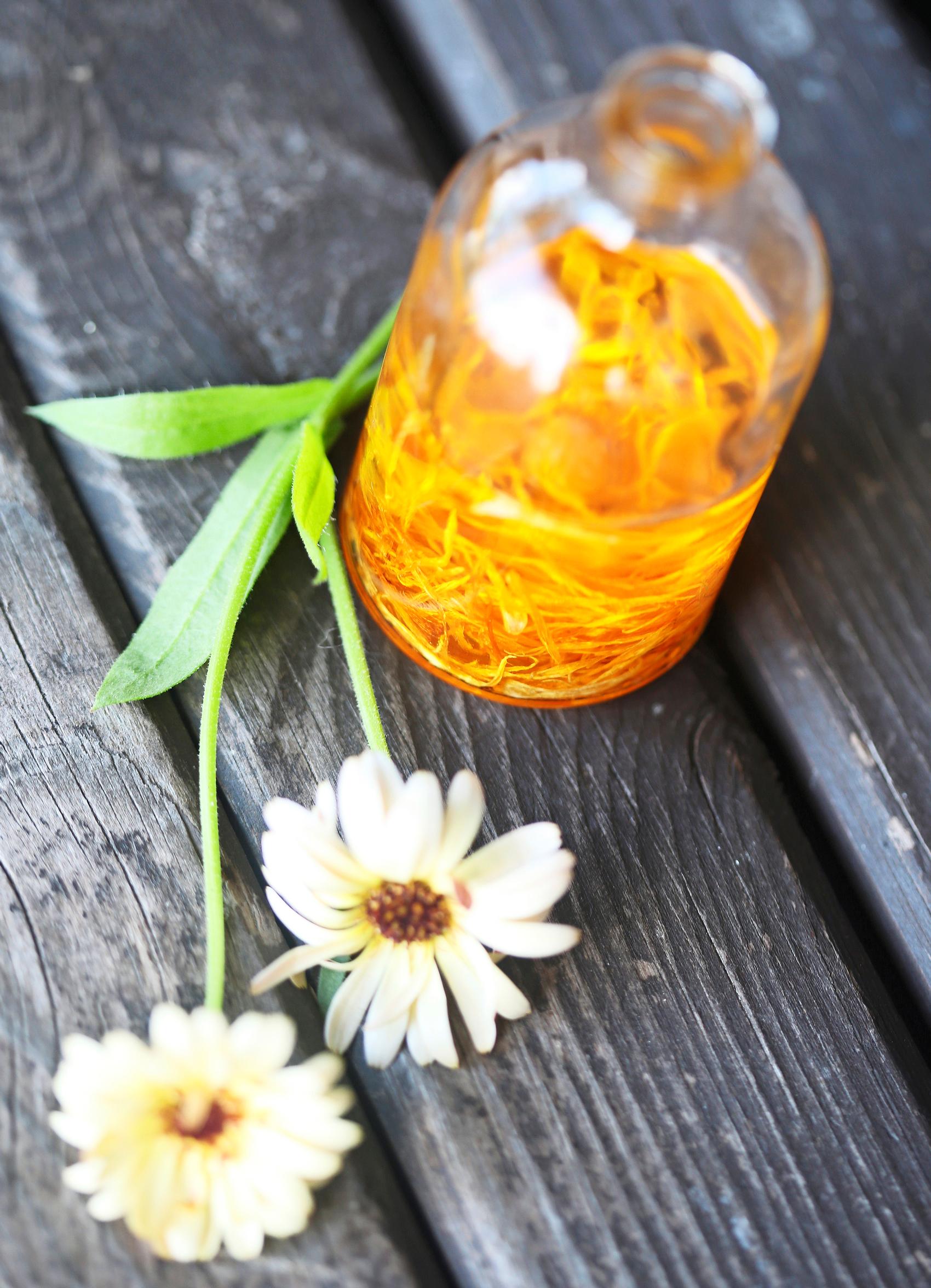 - Kerää kehäkukan terälehtiä ja lisää niitä neitsytoliiviöljyllä täytettyyn pulloon. Käytä puhdasta, keittäen tai uunissa desinfioitua lasipurkkia tai -pulloa.