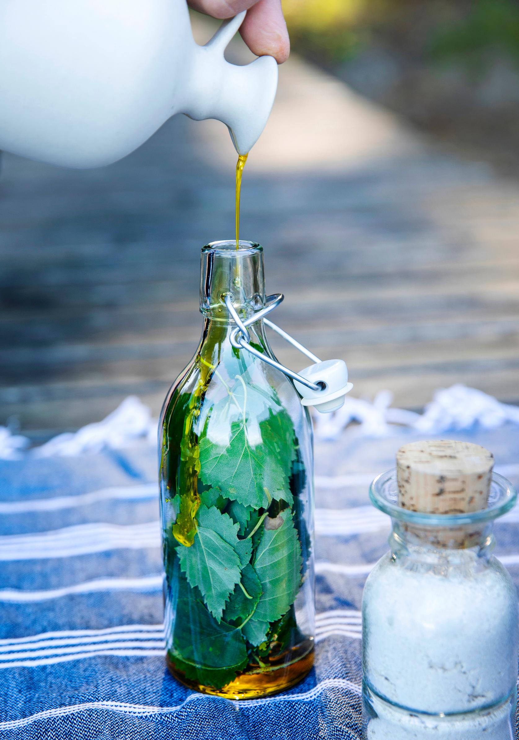 - Täytä puhdas, keittäen tai uunissa desinfioitu lasipurkki tai -pullo kevään tai alkukesän puhtaaksi pestyillä koivunlehdillä ja kaada lehtien päälle niin paljon öljyä, kuin astiaan mahtuu.