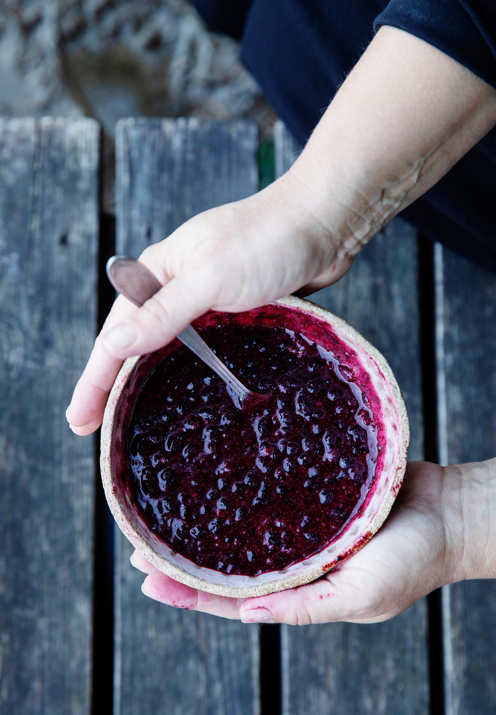- Muussaa mustikat haarukalla. Sekoita joukkoon muutama ruokalusikallinen kiteistä hunajaa.