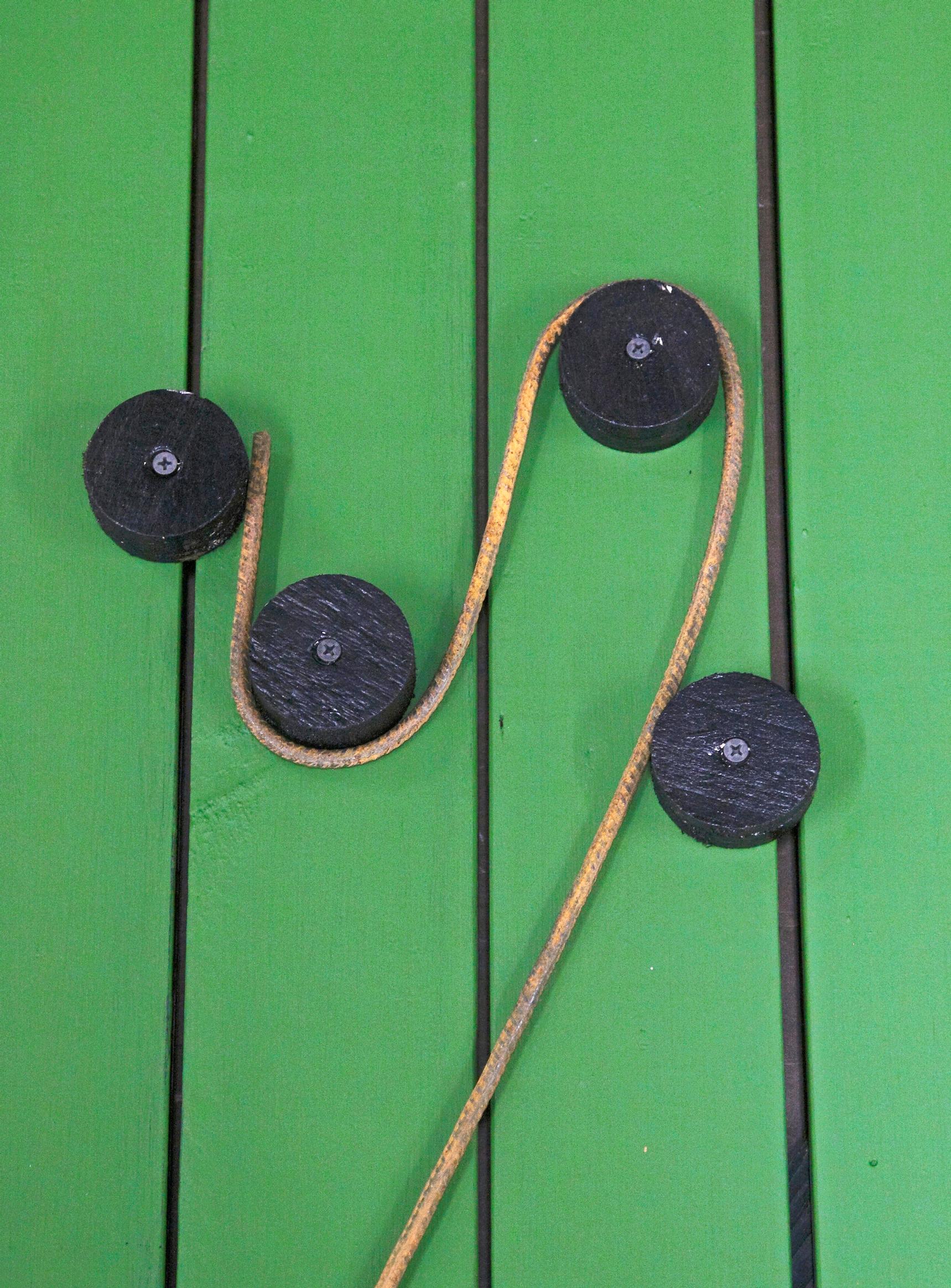 3. Taivuta tangon pää koukuksi esimerkiksi levyyn ruuvattujen puutappien ympäri vääntäen. Pidä tankoa paikoillaan ja pyydä apuria vääntöavuksi. Katkaise valmiista lyhdynvarresta 20 senttiä.