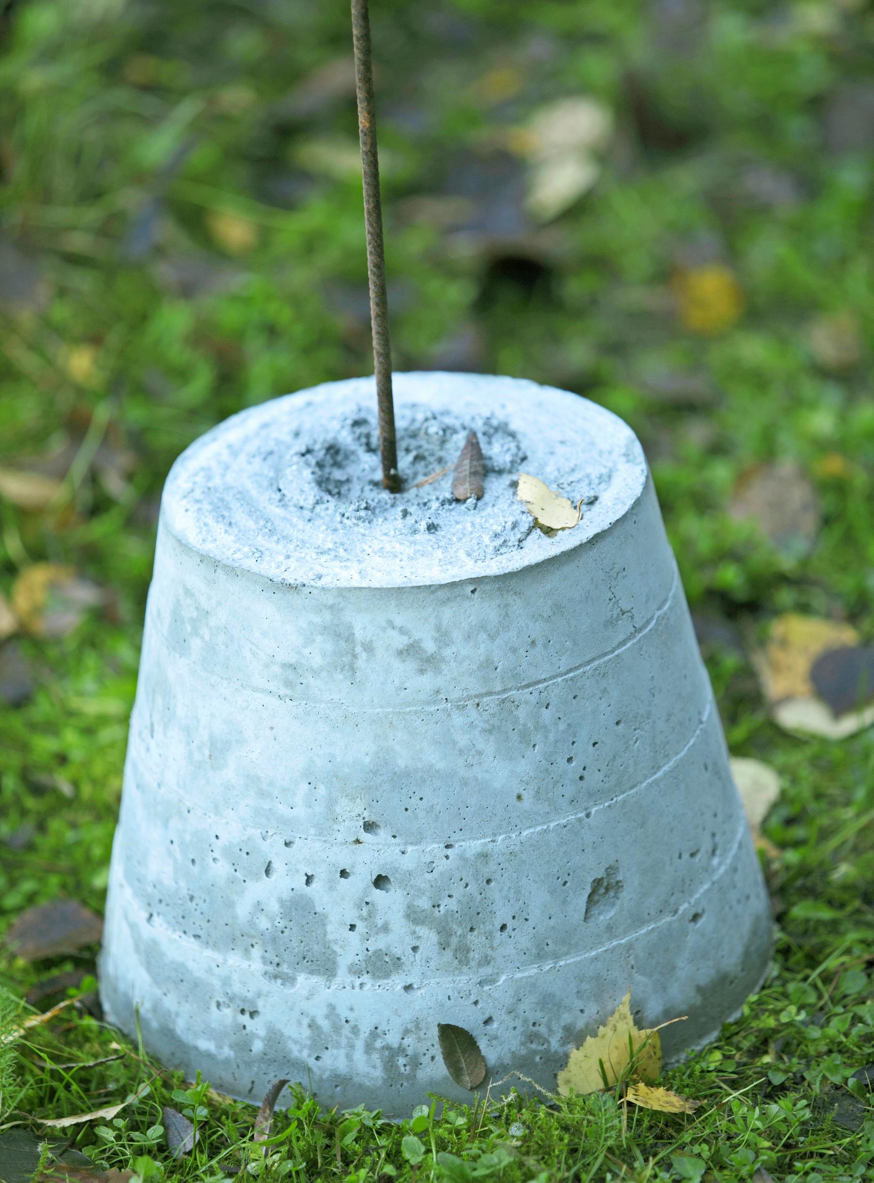 6. Betonista ja harjateräksestä tehdyt lyhdynjalat kestävät ulkona kesät talvet. Betonijalkojen muoteiksi käyvät kaikki ylimääräiset muoviset ämpärit, kulhot ja kartiot.