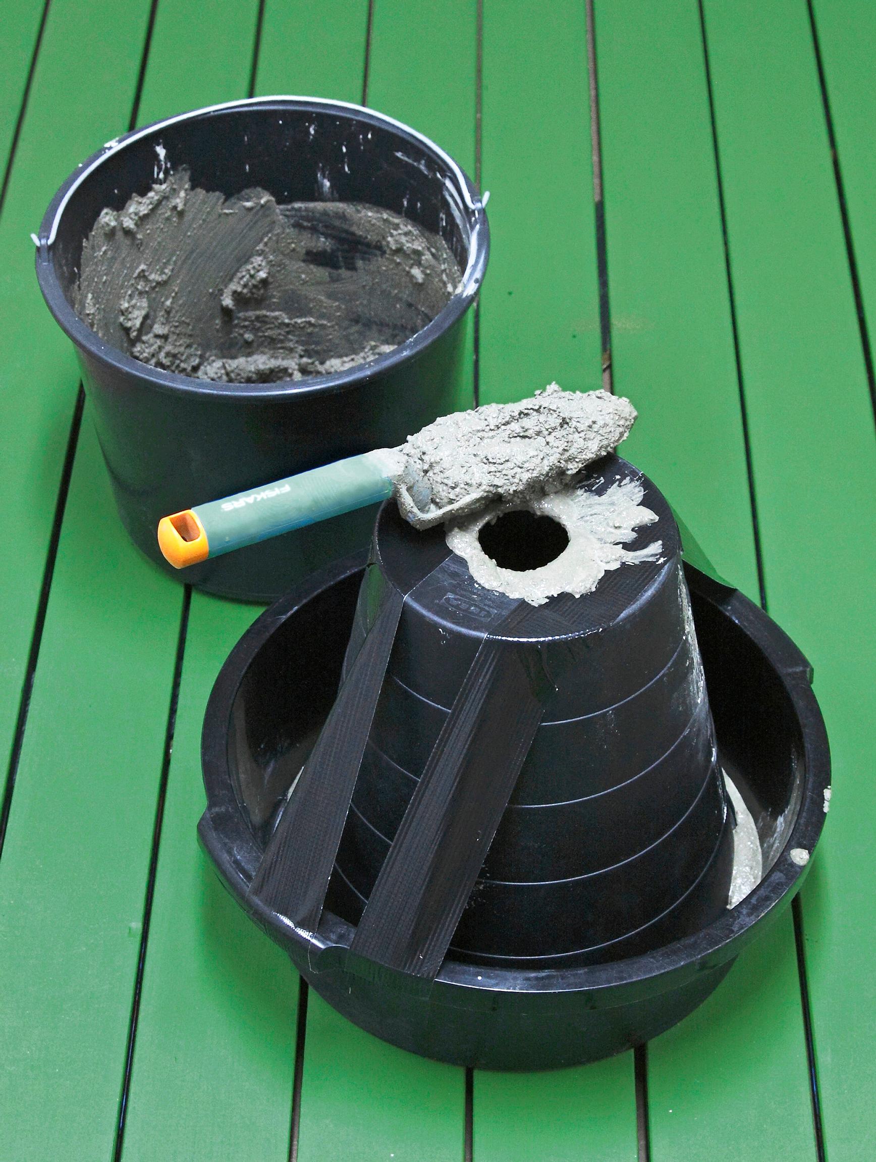 2. Teippaa kumottu ämpäri vadin reunoihin. Täytä ämpäriä isosta reiästä betonimassalla. Riittää, kun täytät massalla ⅔ muotista. Koputa reunoja, jotta massa asettuu tasaisesti ja ilmakuplat poistuvat.