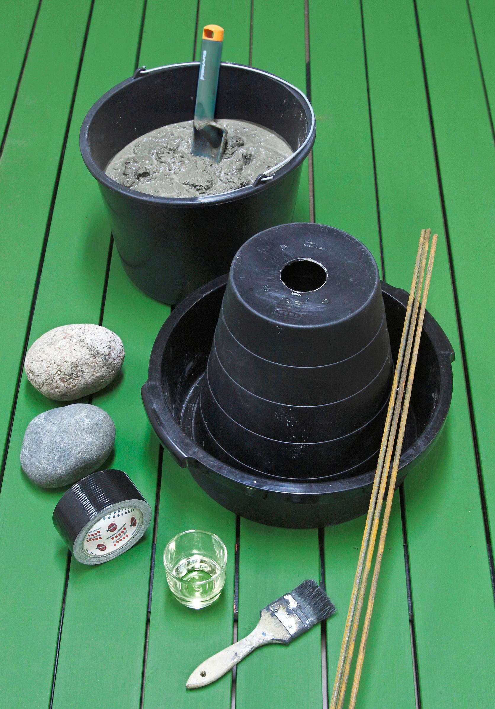 1. Käytä valuämpäreitä pystypäin tai tee vakaa, alaspäin levenevä jalka kumotulla ämpärillä. Sipaise muotin sisäpinnalle ruokaöljyä. Korvaa osa betonista muutamalla kivellä, jos haluat säästää betonia.