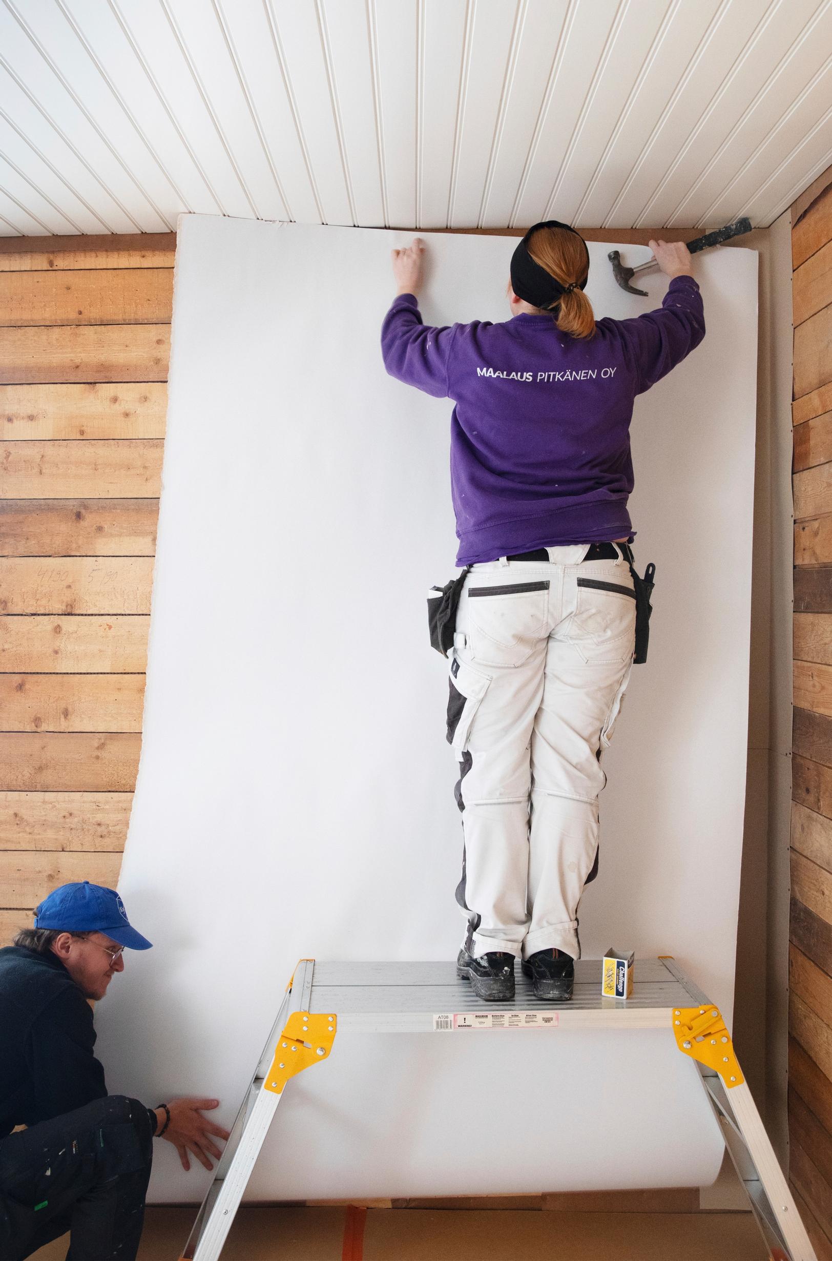 Teen eniten tapetointeja sekä sisä- ja ulkomaalauksia. Muutama vuosi sitten päätin opetella pinkopahvituksen, koska siitä tuli säännöllisesti kyselyjä. Koulussa sitä oli ollut vain päivän verran. Opettelin lisää itse, luin ohjeet ja rupesin tekemään, ja siitä se muutaman yrityksen ja erehdyksen jälkeen alkoi sujua.