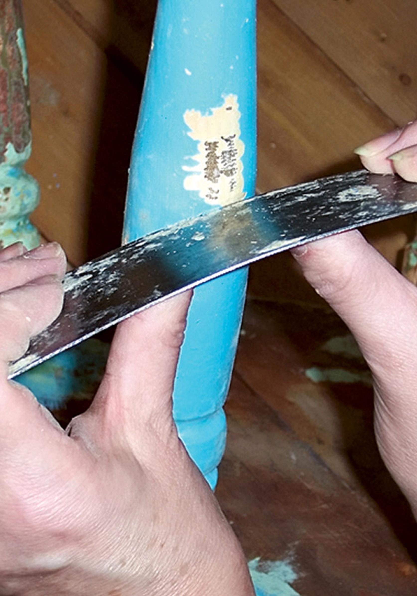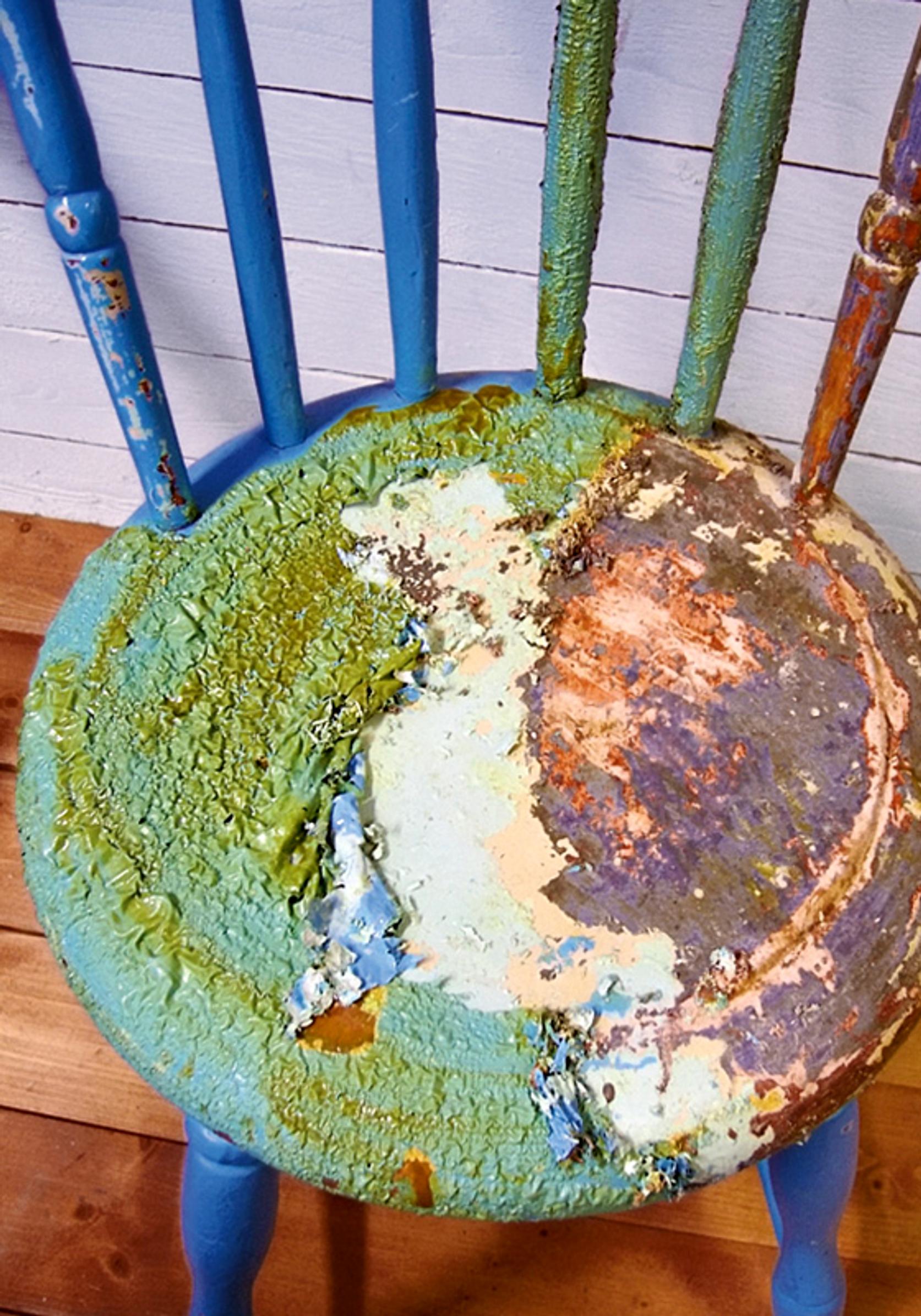 Pinnatuolissa oli niin monta maalikerrosta, että pelkkä maalaminen ei olisi tuottanut kaunista lopputulosta. Viisi vanhaa maalikerrosta piti siis irrottaa. Se oli työlästä: vanhan maalin poisto ja tuolin huolellinen hiominen vei yli kymmenen tuntia.