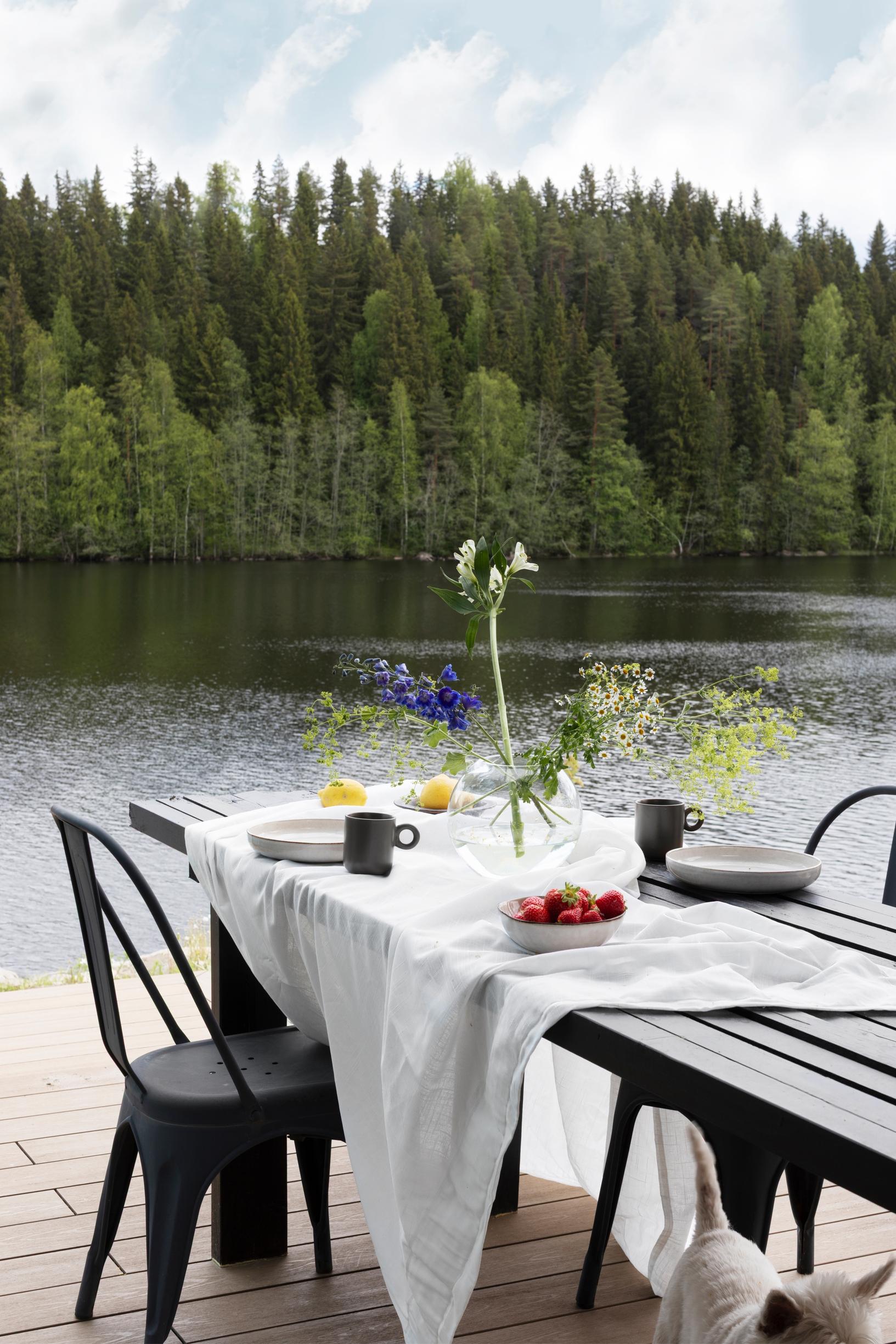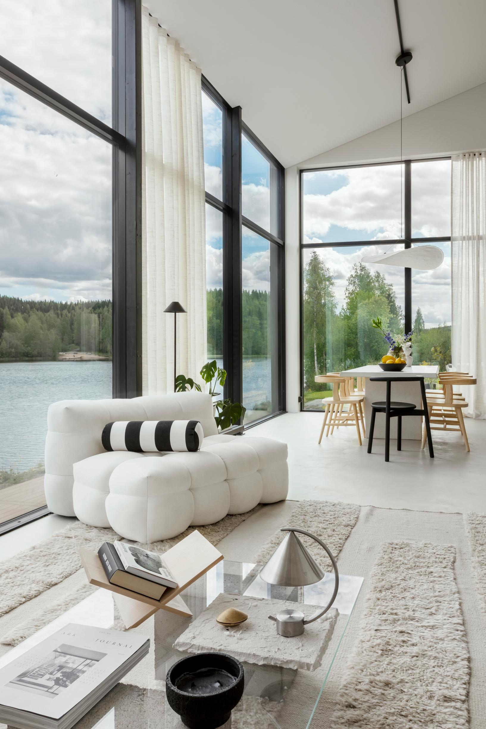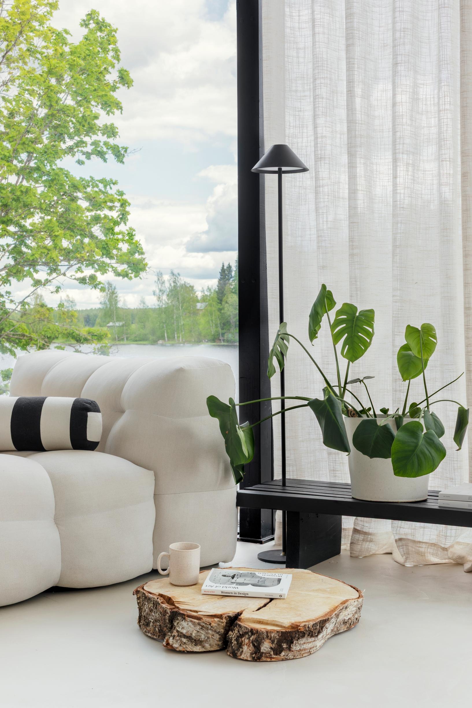 rauhallinen. Sisustan kotiani hyvin maltillisesti ja pikkuhiljaa. Omassa kodissani en harrasta ollenkaan suunnittelua vaan sisustan intuitiivisesti. Täällä haluan sisustuksen antavan tilaa järvimaisemalle ja sen vaihtuville sävyille.