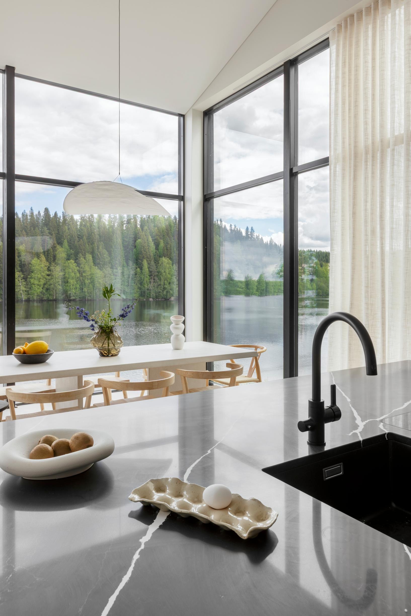 Maikin lempiasioita talossa on saareke, joka on asemoitu maiseman mukaan. ”On mahtavaa arjessa touhuta keittiössä niin, että voi samalla katsella järvelle.”