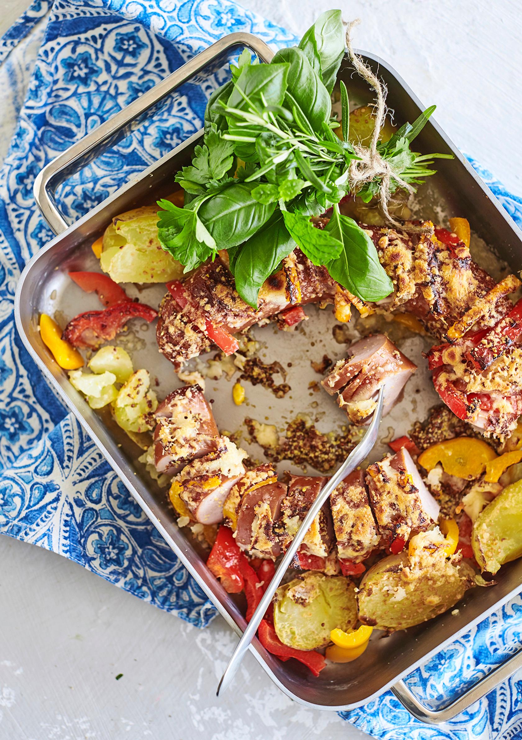 Kun makkara ei maistu enää sellaisenaan, voi lenkin kiepauttaa uunivuokaan ja valmistaa sen Hasselbackan tyyliin. Hasselbackan makkaraan tehdyt viillot sivellään sinapilla ja täytetään paprikasuikaleilla. Sitten vain juusto päälle ja lenkki uuniin! Samassa vuoassa paahtuvat uuteen uskoon myös edelliseltä aterialta jäljelle jääneet potut.