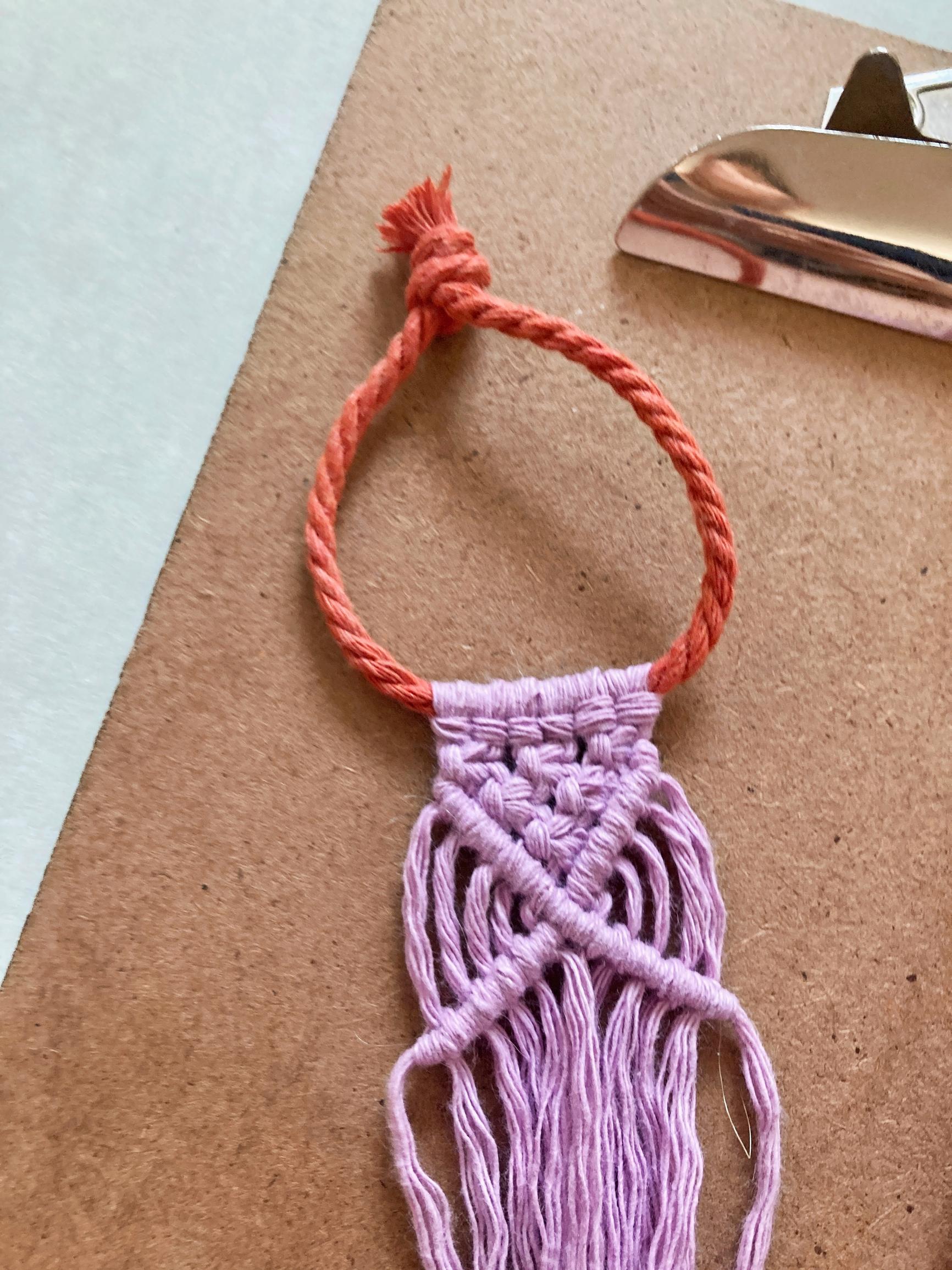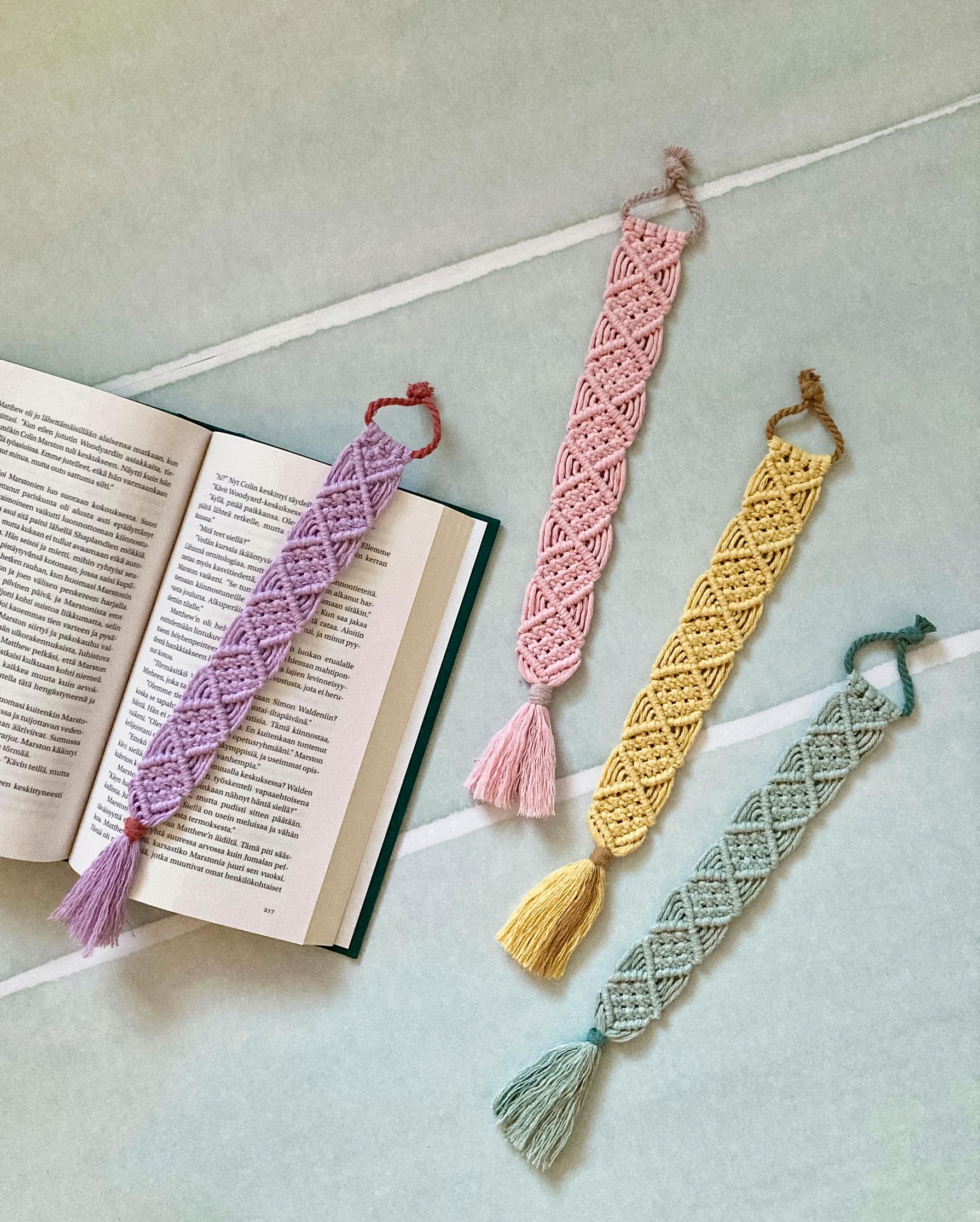 Makramee-kirjanmerkki syntyy niin helposti, että näitä tekee mieli solmia monta! Katso ohje vaihekuvineen