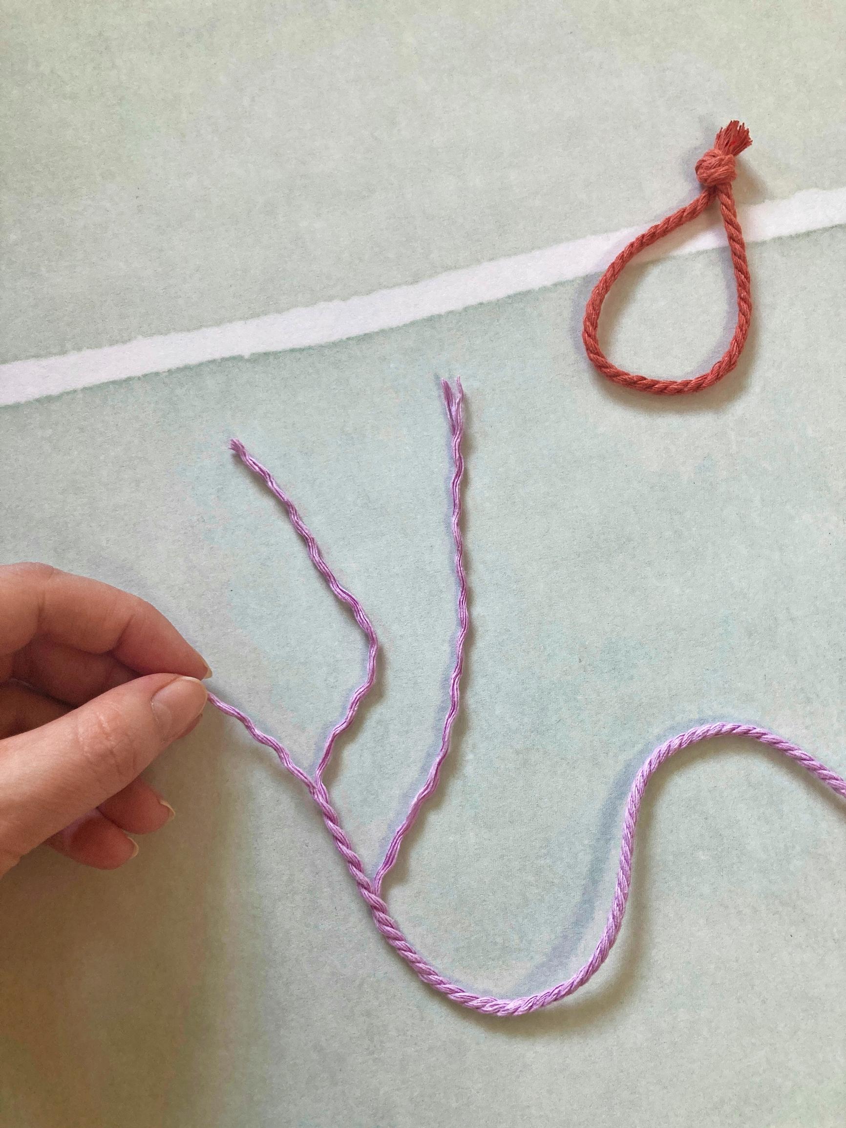 9. Pura 40 cm mittaisen korallinvärisen langan kolme kierrettä erillisiksi langoiksi. Tulet tarvitsemaan näistä ainoastaan yhtä lankaa kääresolmun tekemiseen.