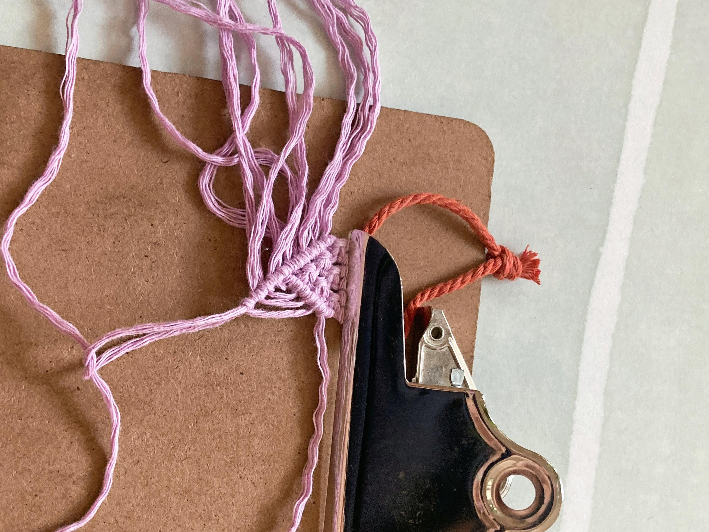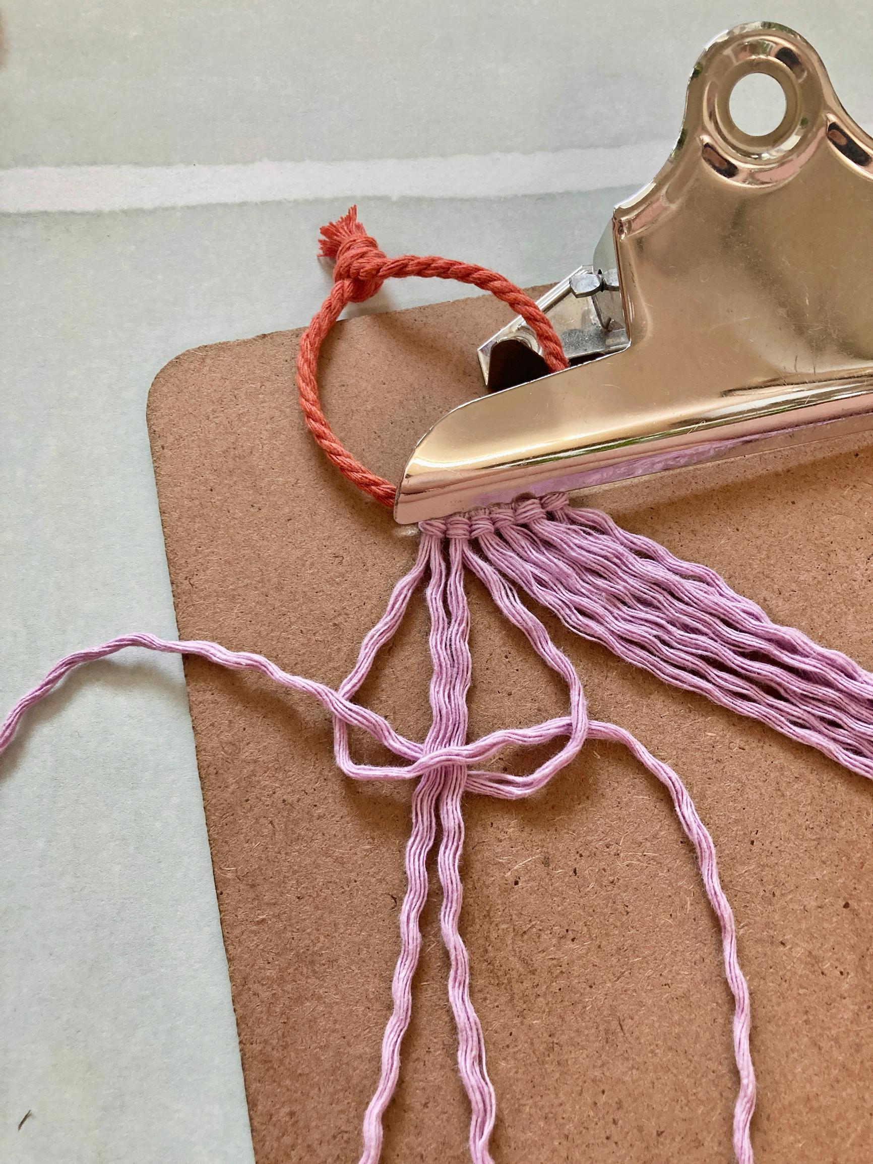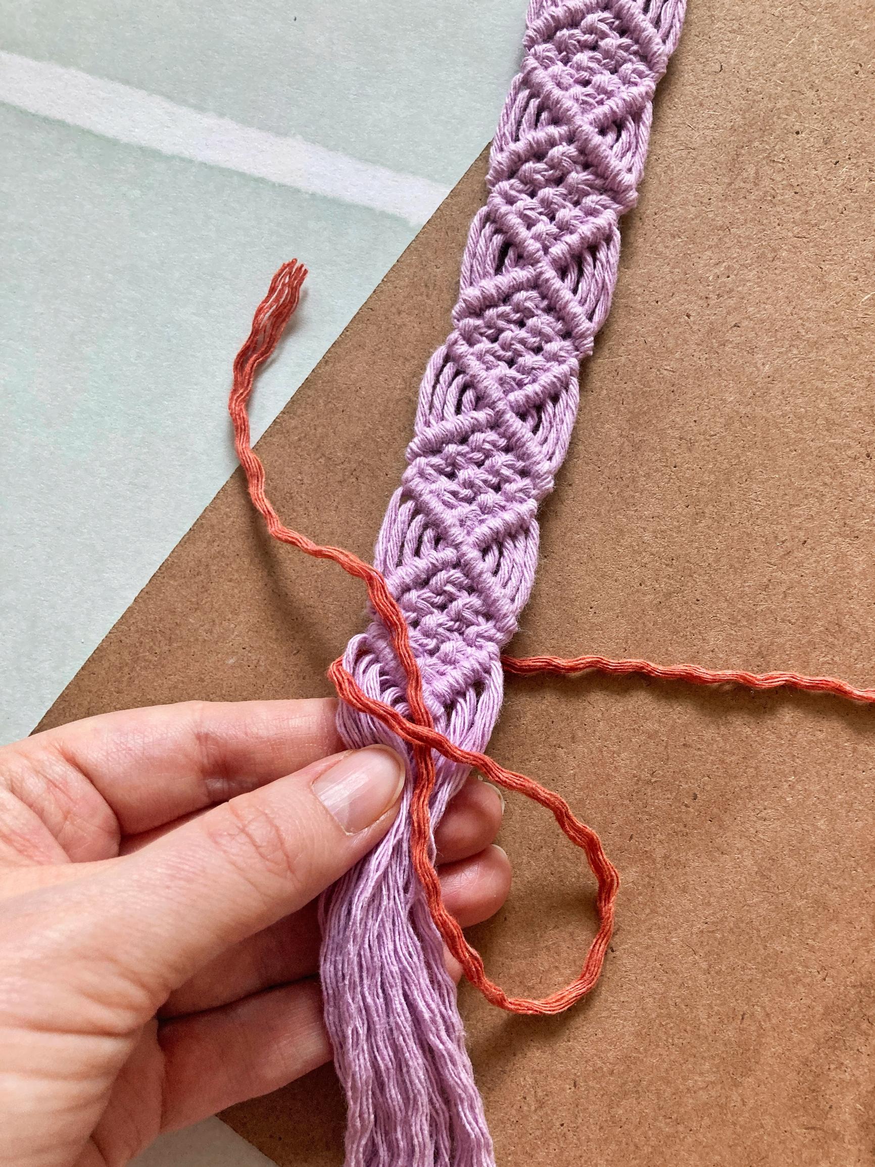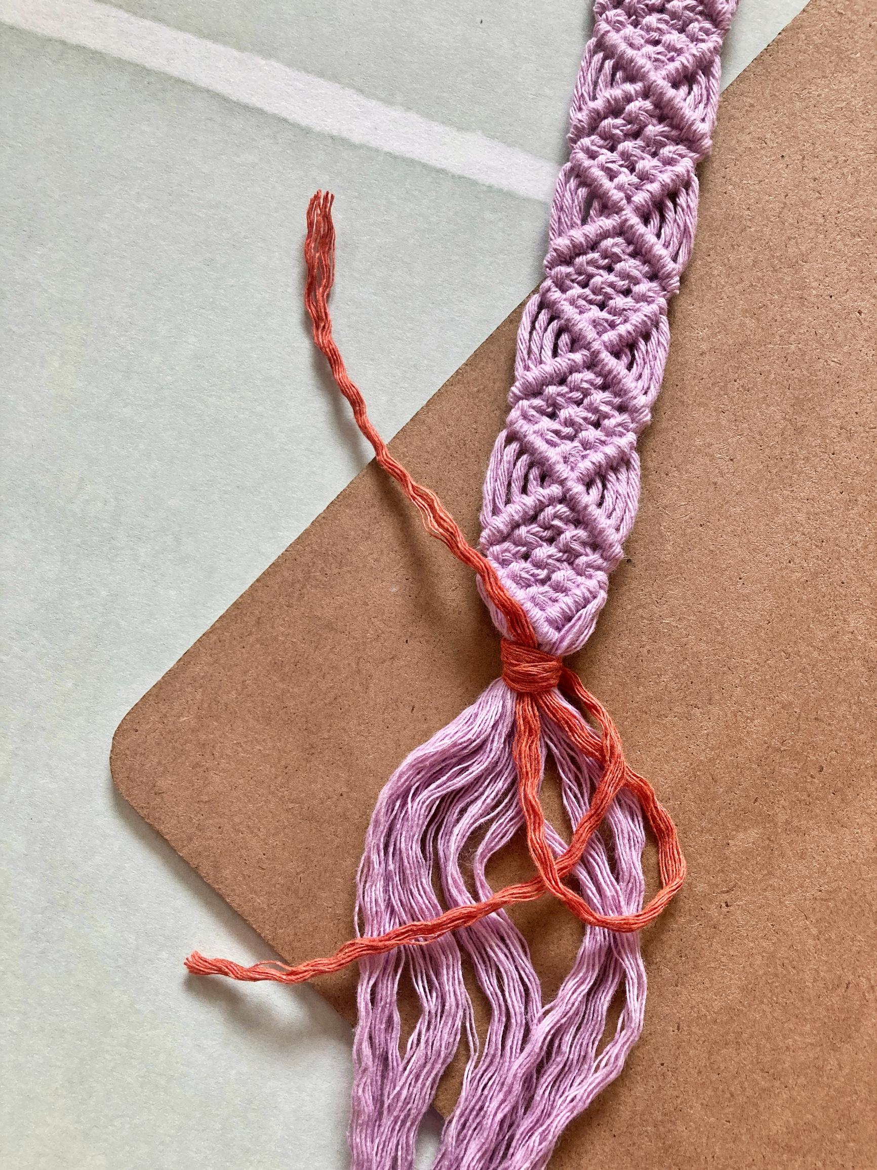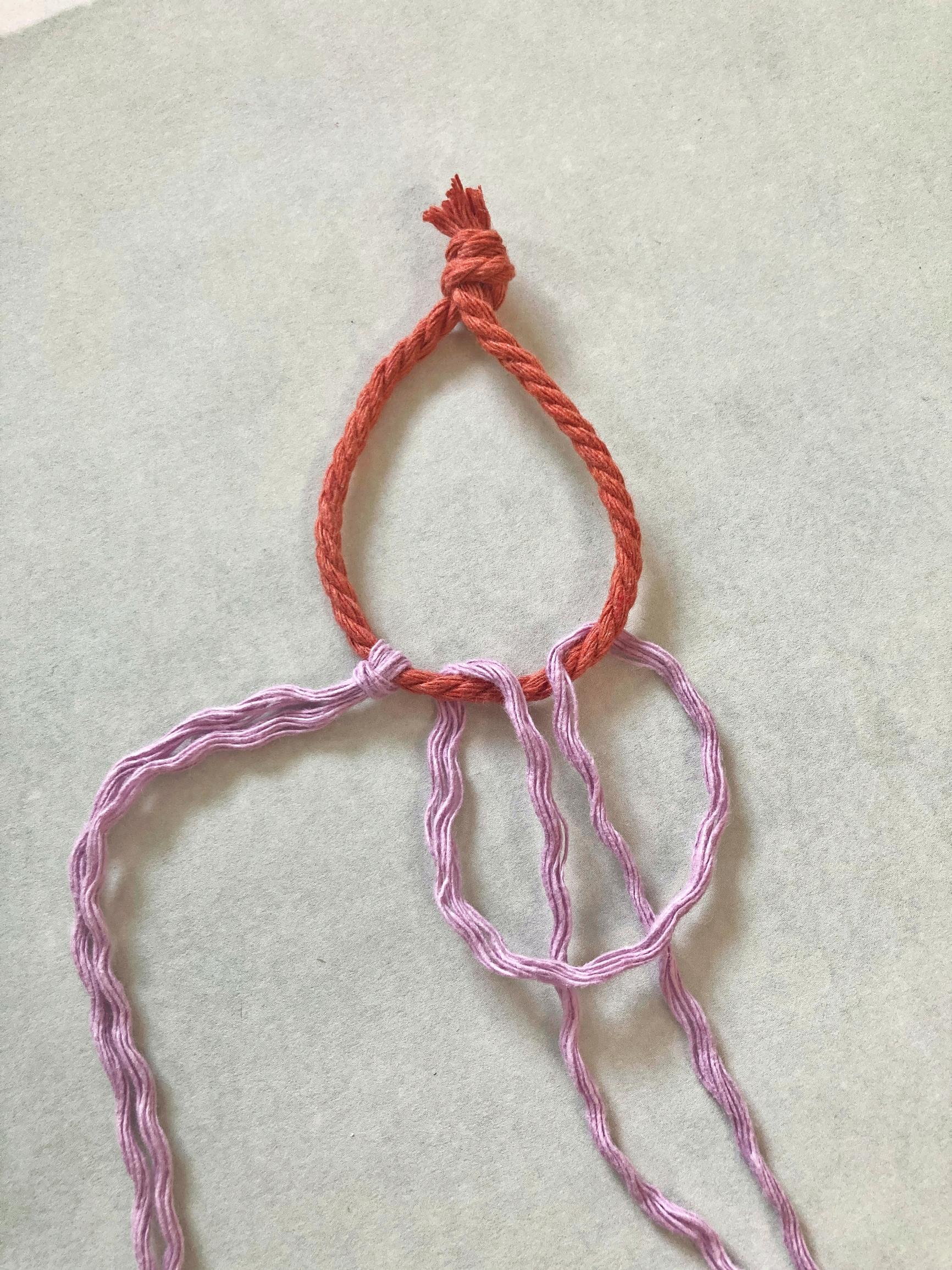 2. Solmi laventelinväriset langat vierekkäin leivonpääsolmuilla korallinväriseen lenkkiin.