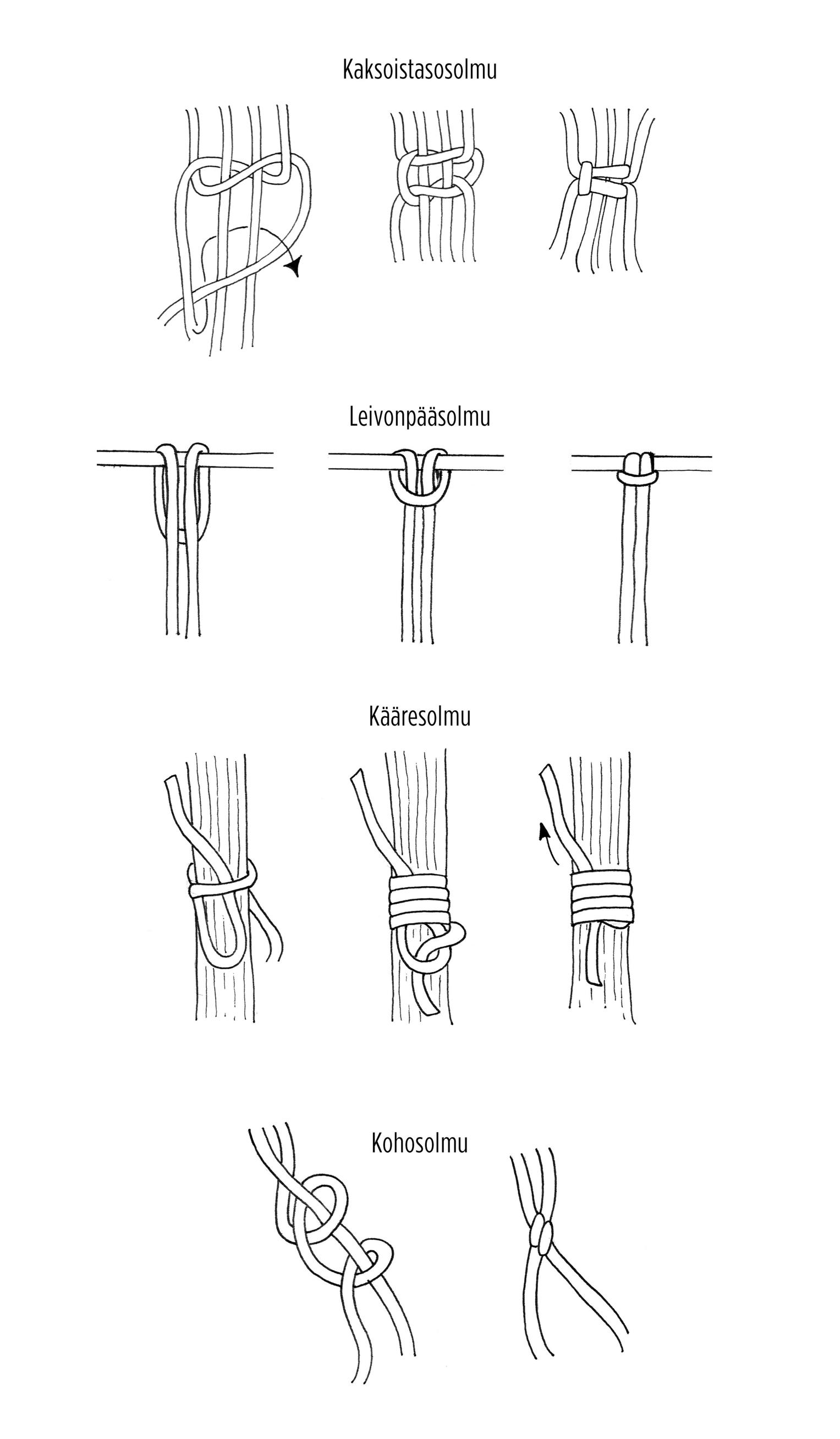 4. Tee seuraavaksi kaksoistasosolmujen alapuolelle kaksi vierekkäistä kaksoistasosolmua: ensimmäinen solmu vasemmalta puolelta katsoen 3., 4., 5. ja 6. langasta ja toinen 7., 8., 9. ja 10. langasta. Tee lopuksi näiden solmujen alle vielä yksi kaksoistasosolmu vasemmalta katsoen 5., 6., 7. ja 8. langasta.