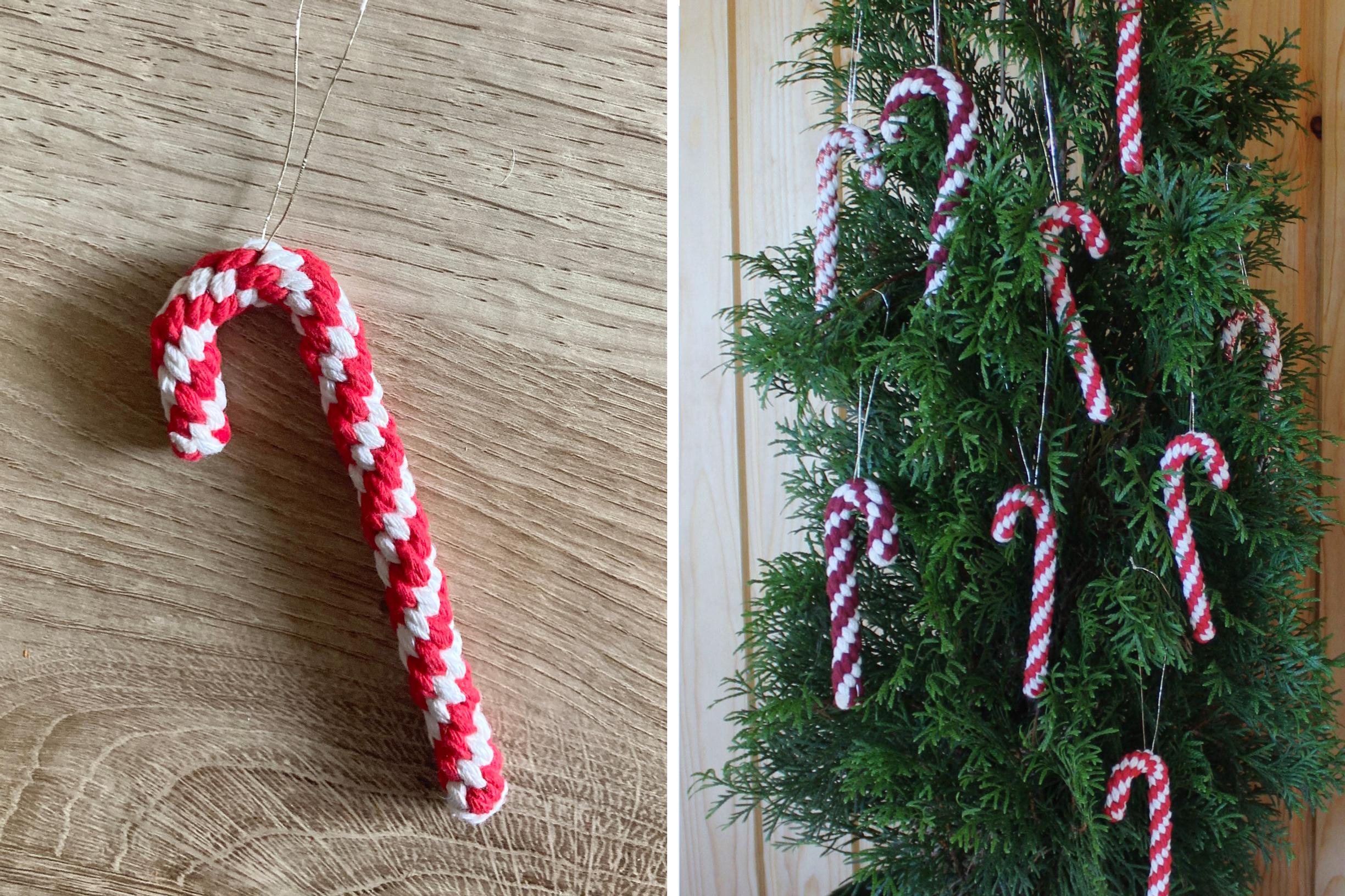 Melkein kuin piparminttua! Solmi makrameekarkkikepit kuusen tai lahjapaketin koristeeksi