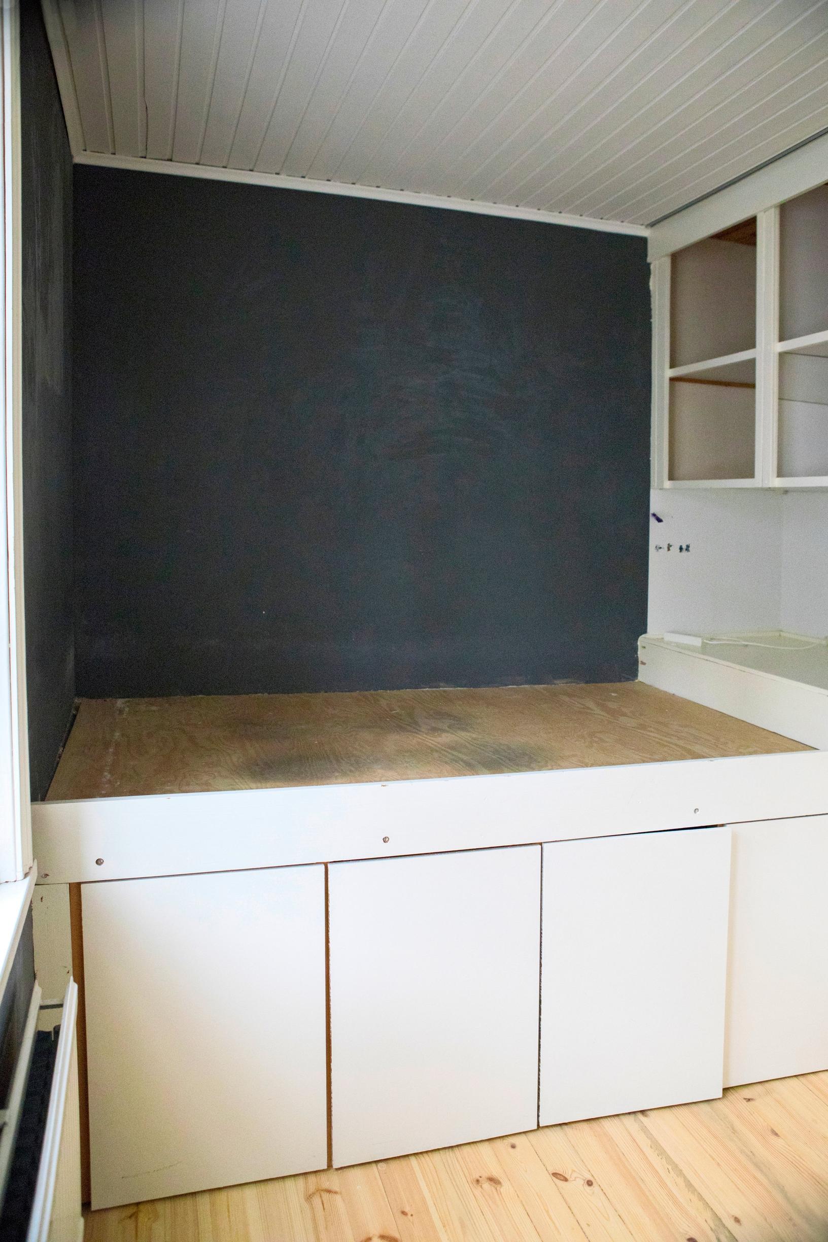 Remontin aluksi otettiin tukeva ote sorkkaraudasta. Repsottavat kaapistot ja lattialistat irrotettiin. Uutta pintaa lähdettiin tekemään seinien ja katon naulanreikien pakkeloinnilla. Seinät pohjamaalattiin. Kokopuinen sängynrunko, kaapinovet ja seinät maalattiin kaikki samalla sinivihreään vivahtavalla antrasiitilla. Kattoon riitti paikkamaalaus puretun kaapiston kohdalta. Asukkaan tarpeiden mukaan suunnitellut mittatilauskaapit tilattiin asennettuina.