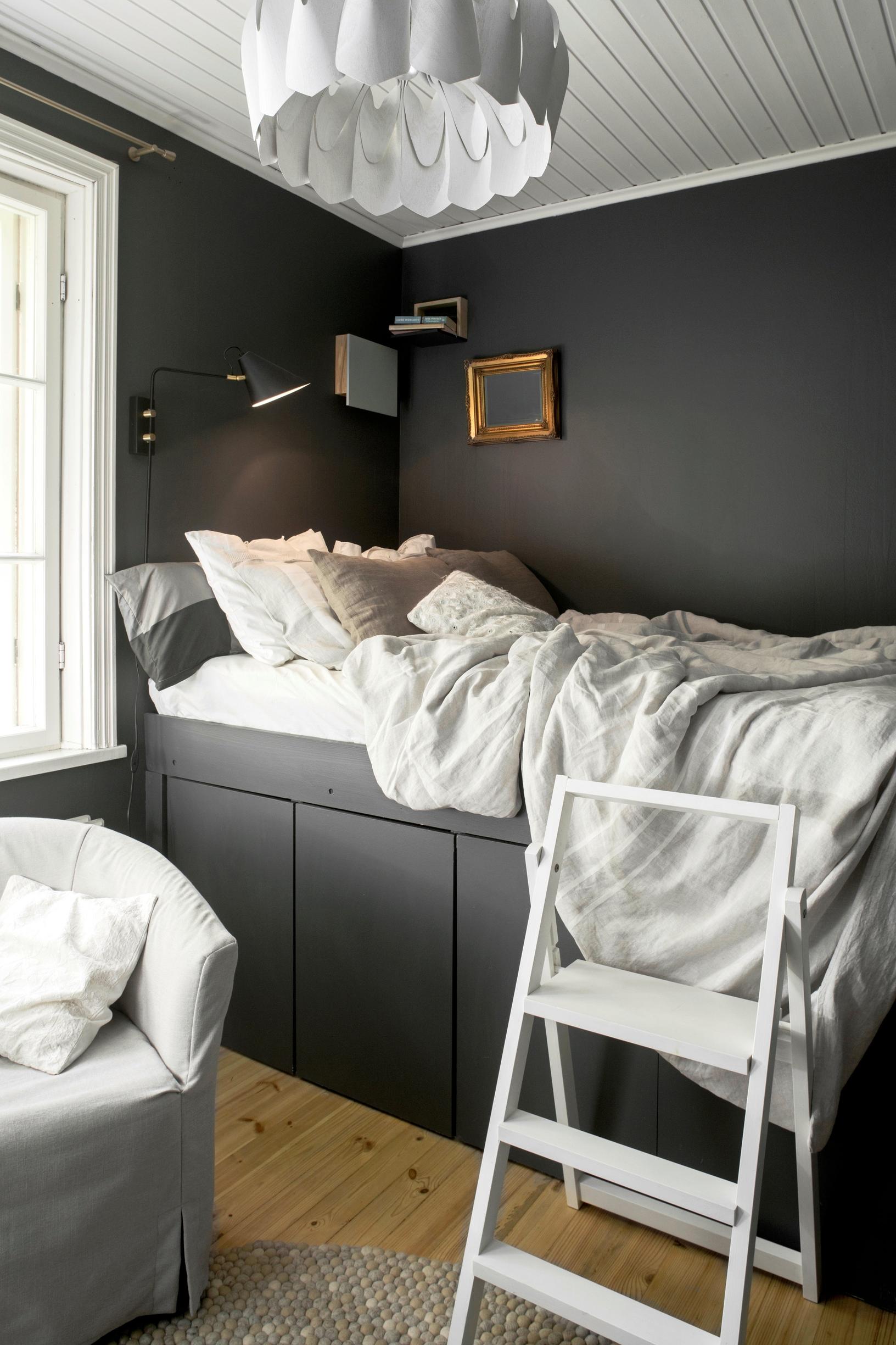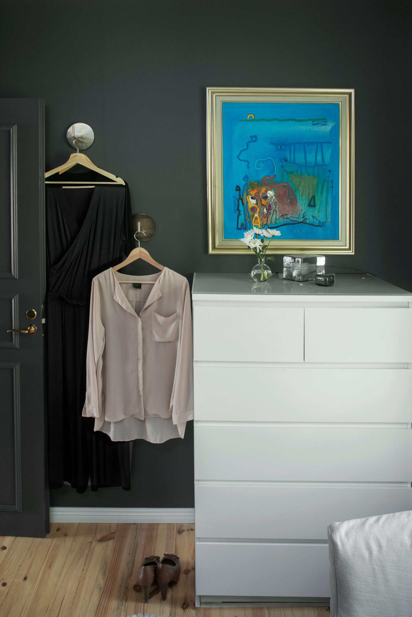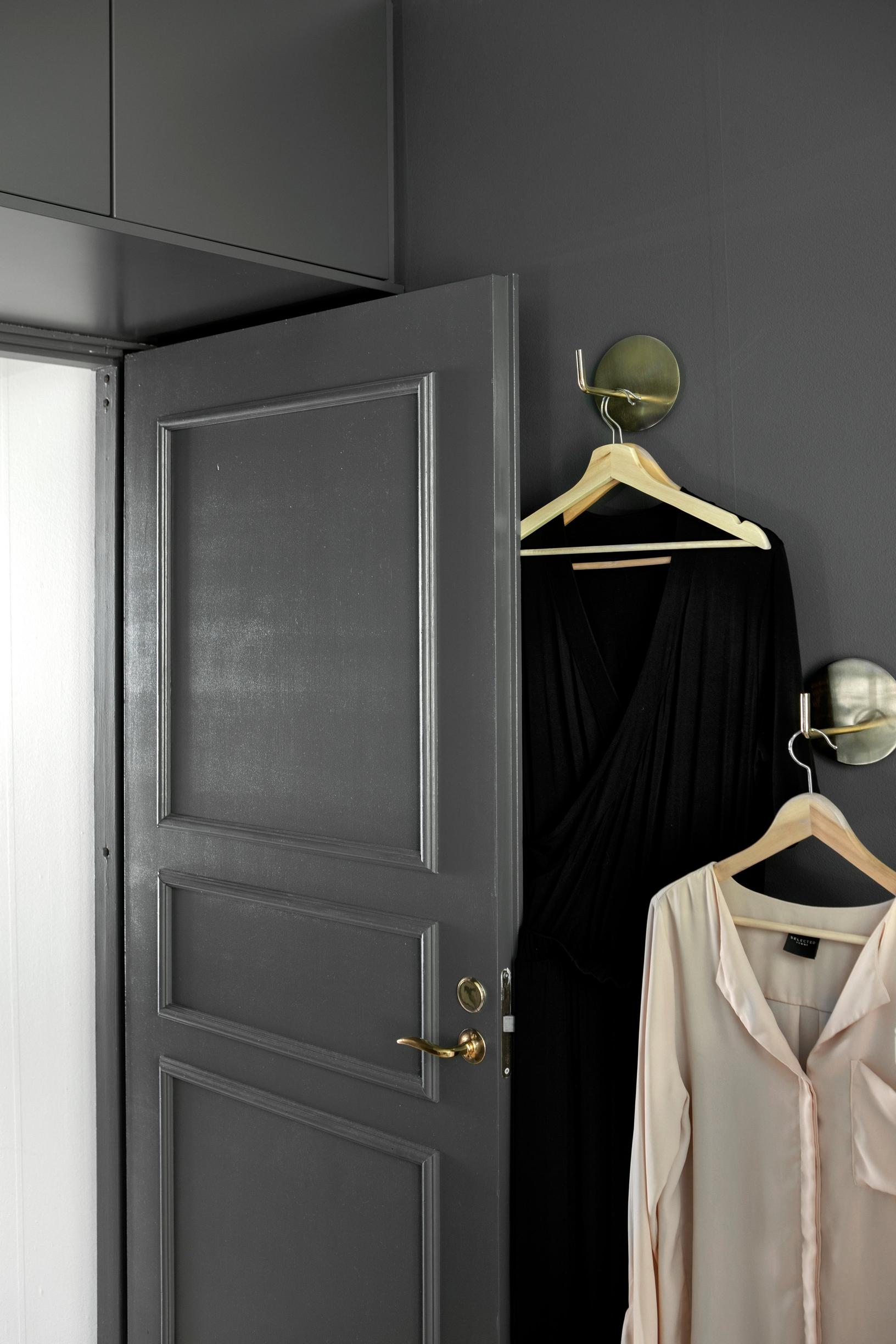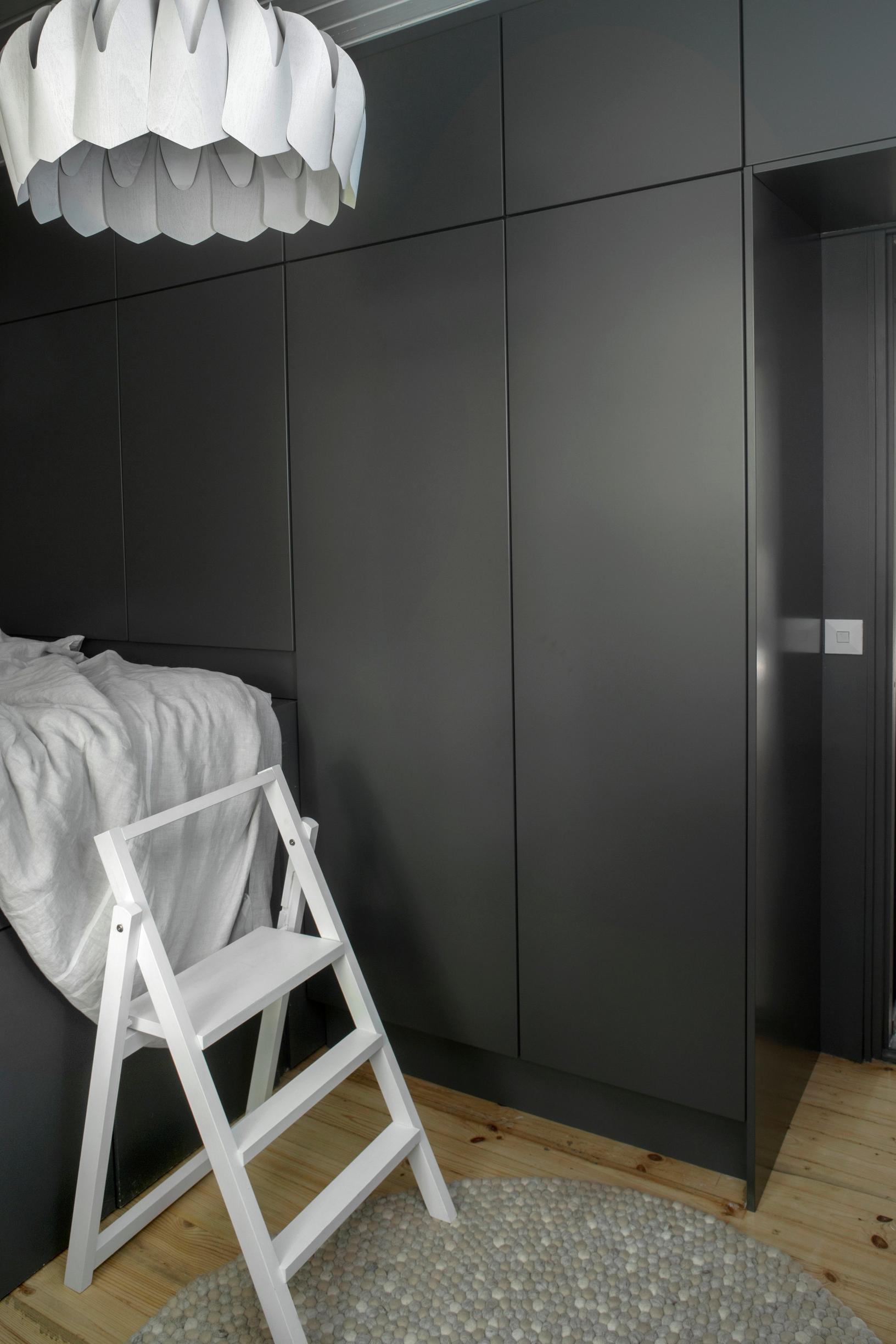 Makuuhuoneen uuden tumman ilmeen suunnitteli Invisionin Marianna Hietikko. 100-vuotiaan puutalokodin charmi palautettiin tilaan pienillä ratkaisuilla. Huoneen tunnelma on nyt levollinen yhtenäisen värityksen ansiosta. Uusien kaappien mitoitus palvelee asukkaan tarpeita, ja lisää säilytystilaa saatiin oven päälle asennettuihin yläkaappeihin. Pienessä tilassa oleva kaappirivistö sulautuu tyylikkäästi tummien seinien sävyyn. Huoneen ilmeen viimeistelivät uudet lattialistat sekä välioven maalaus ja listoitus.