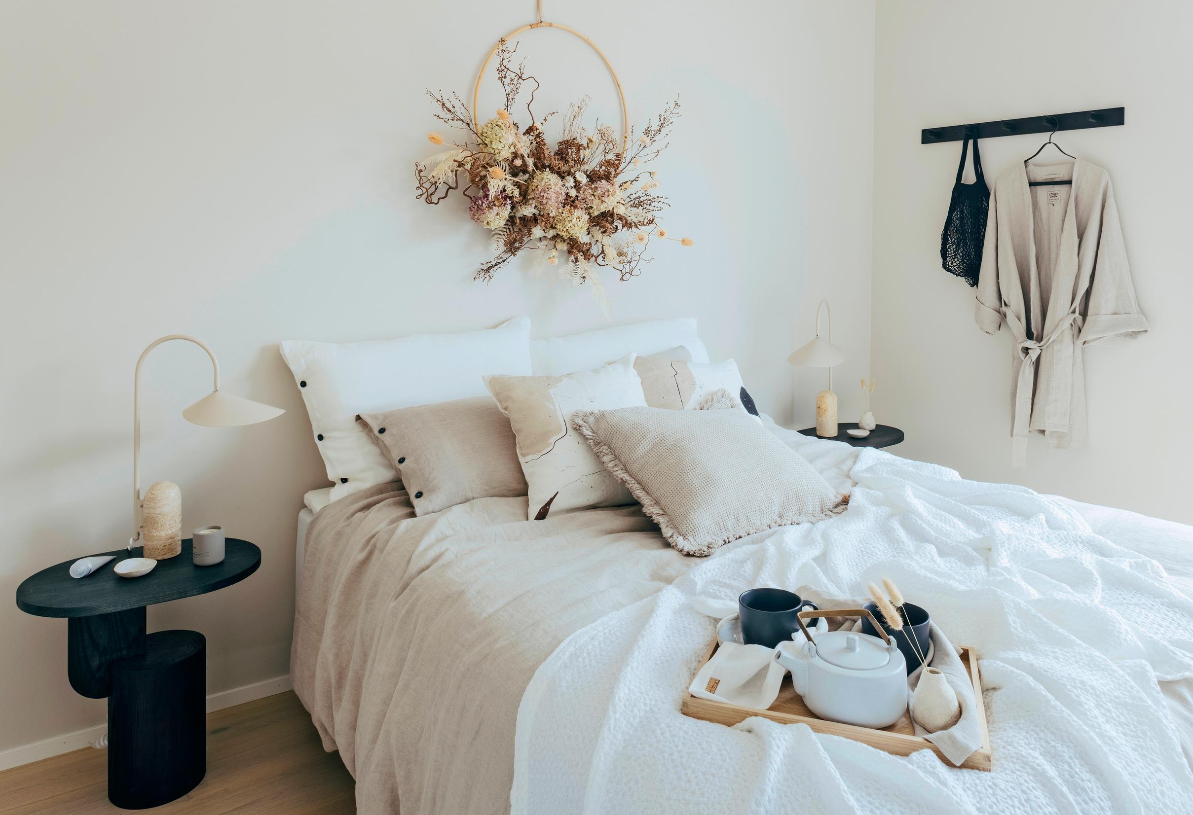 Messinkiseen kranssipohjaan tehty kuivakukka-asetelma on hauska idea ja sopii luontevasti bohotyyliseen, luonnonväriseen makuutilaan. Kuivakukkakranssin on valmistanut Johanna Tuominen. Xera Livingin pellavaiset petivaatteet ja Insert-sivupöytä ovat Cobellosta. Sisustussuunnittelu Kia Design. Kohde 13, Jukkatalo Jalava.