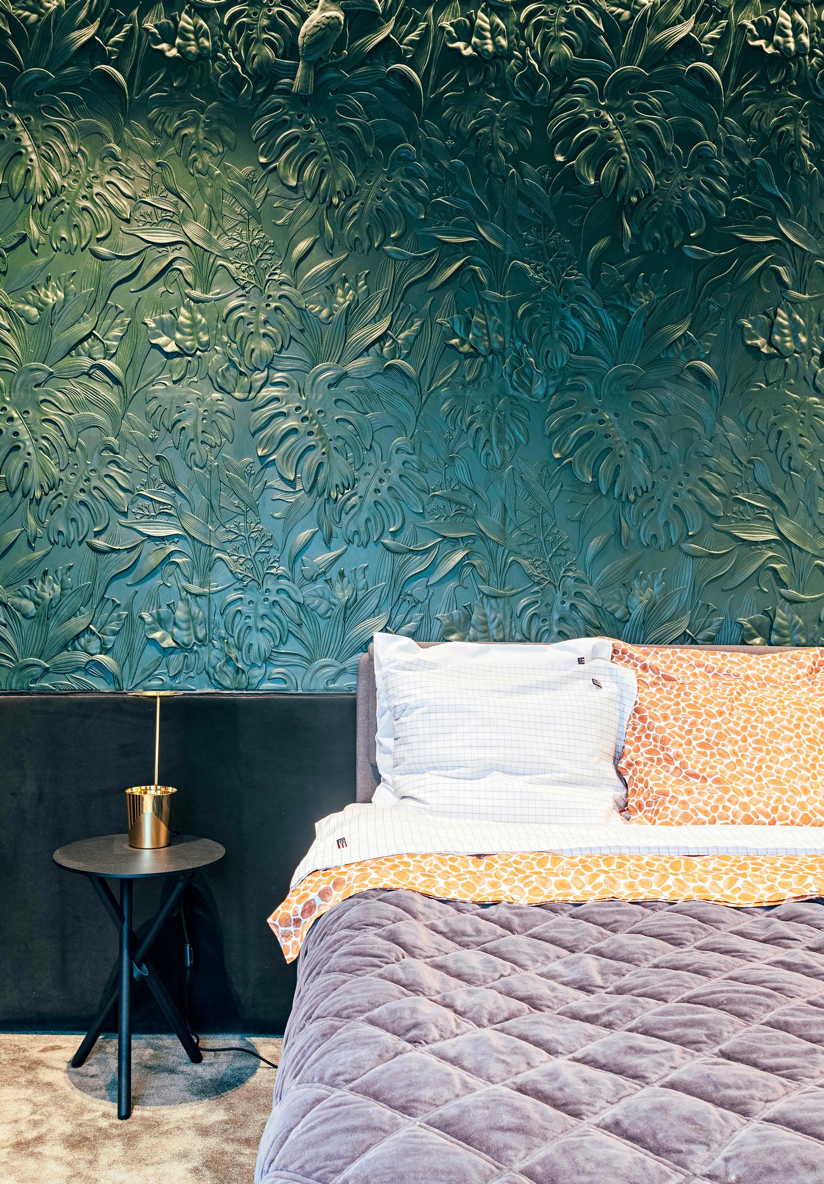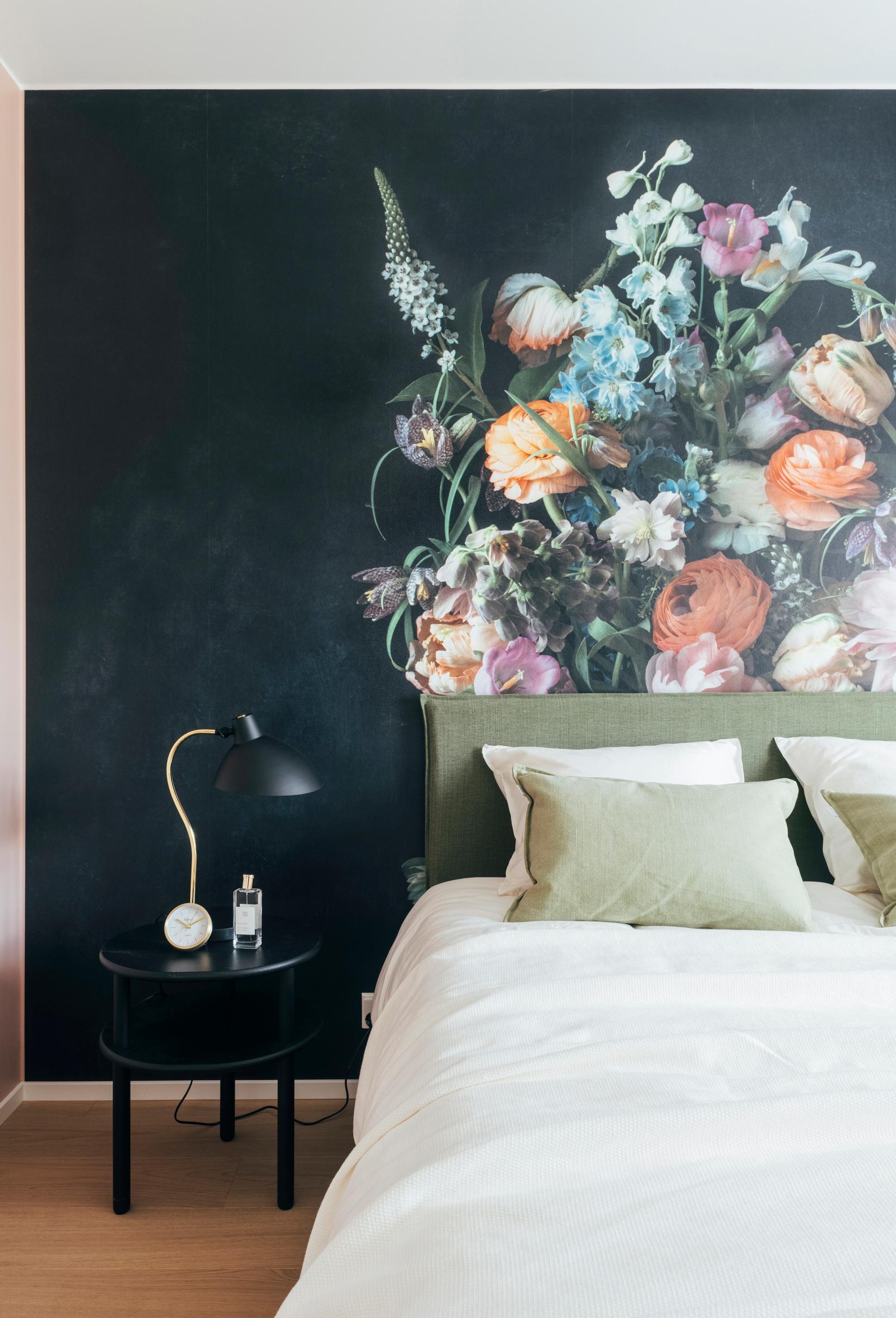 Taiteilija Kreetta Järvenpään rehevä kukkatapetti tekee makuutilasta maalauksellisen paratiisin. Whispering-kuvatapetti ja vuodevaatteet ovat Cellon. Sisustussuunnittelu Anna Biström. Kohde 15, Ainoa Fiksu.