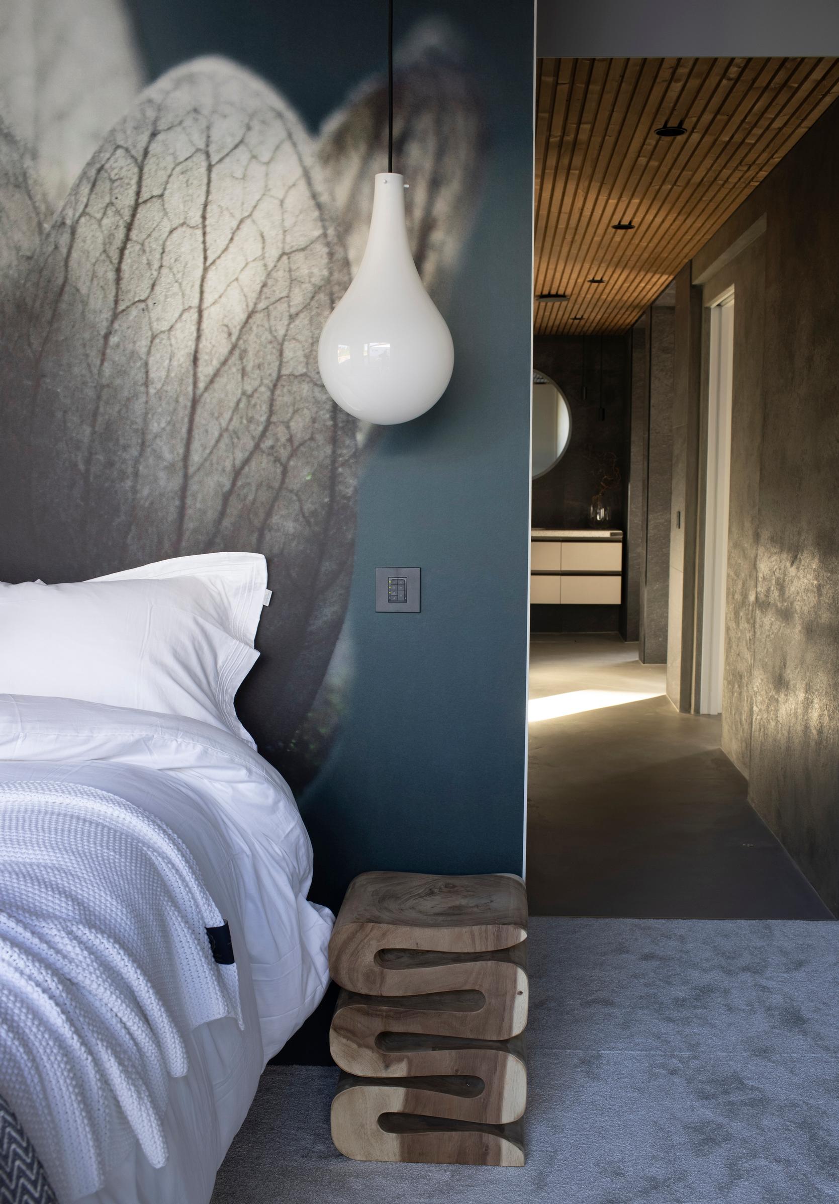 Asukkaan valokuvasta teetetty luontoaiheinen kuvatapetti on Dekotelista. Puupölkystä työstetty yöpöytä on B. Livingin. Sisustussuunnittelu Dima Latvalahti. Kohde 8 Talo Sensu.