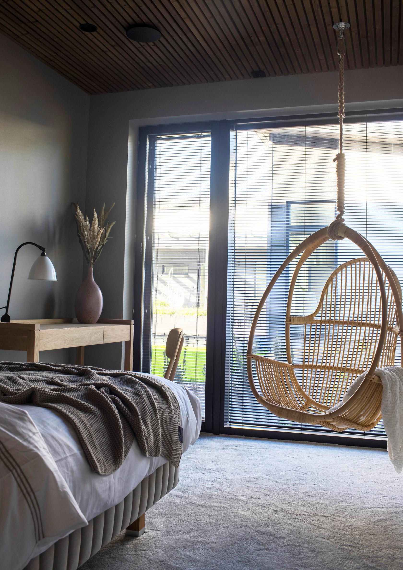 Tässä makuuhuoneessa nukutaan, rentoudutaan keinussa ja työskennellään. Pehmeä kokolattiamatto tekee paluun ja sopii erityisen hyvin tilaan, jossa on betoniseinät. Golvabian akustinen Akvarell-kokolattiamatto on Flooriasta. Riippukeinu on Parolan rottingin. Muhkea runkopatja ja kalusteet ovat Boknäsista. Kohde 8 Talo Sensu.