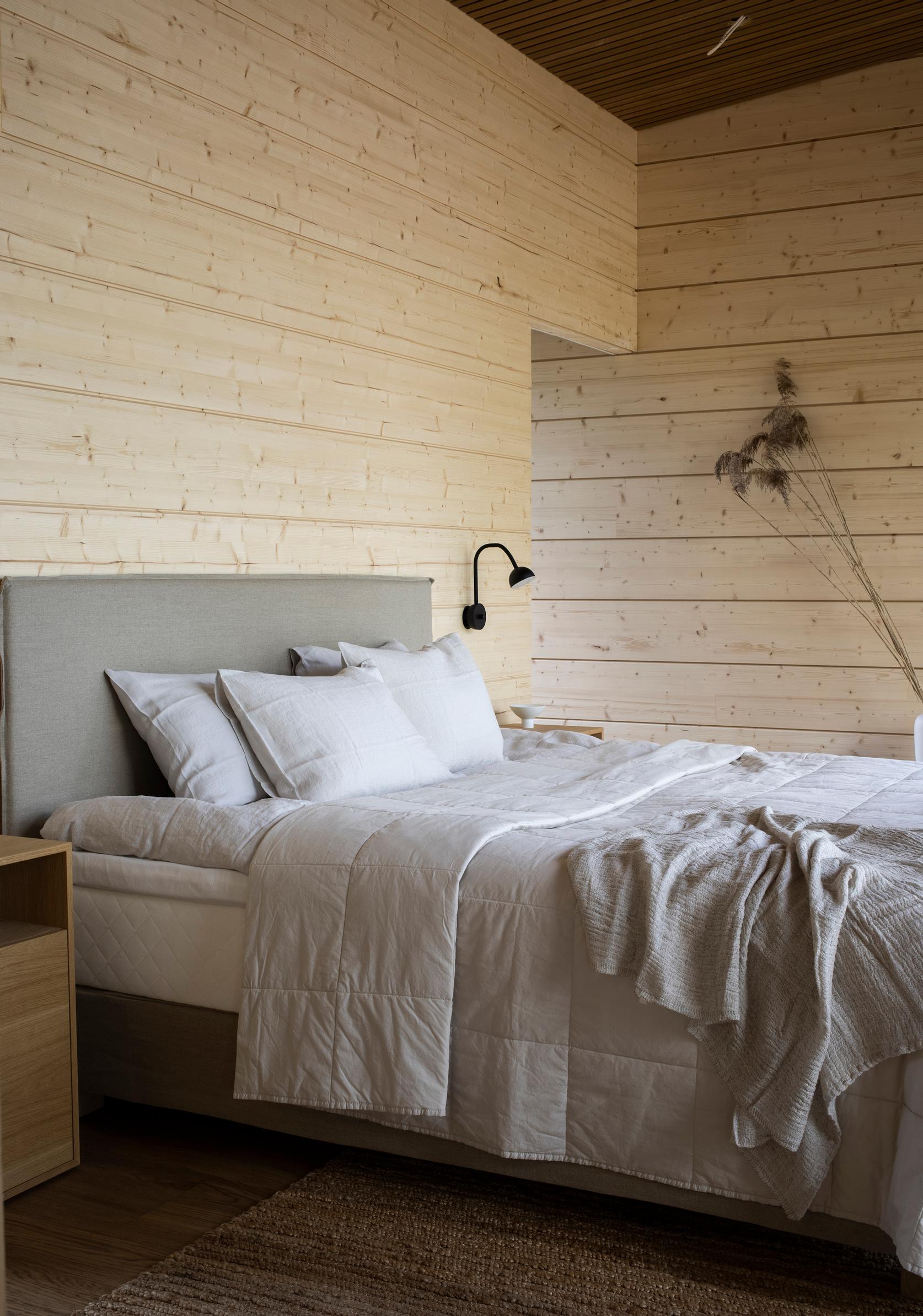 Hirsitalon makuuhuoneesta on kulku kylpytiloihin. Pellavakankaalla verhoiltu sänky ja pääty sekä vuodevaatteet ovat Matrin. Rouhea hamppumatto on Roots Livingin. Yöpöytä ja valaisin ovat Nordic Storiesista. Sisustussuunnittelu Johanna Hernesniemi. Kohde 9, Villa Nordic Stories.