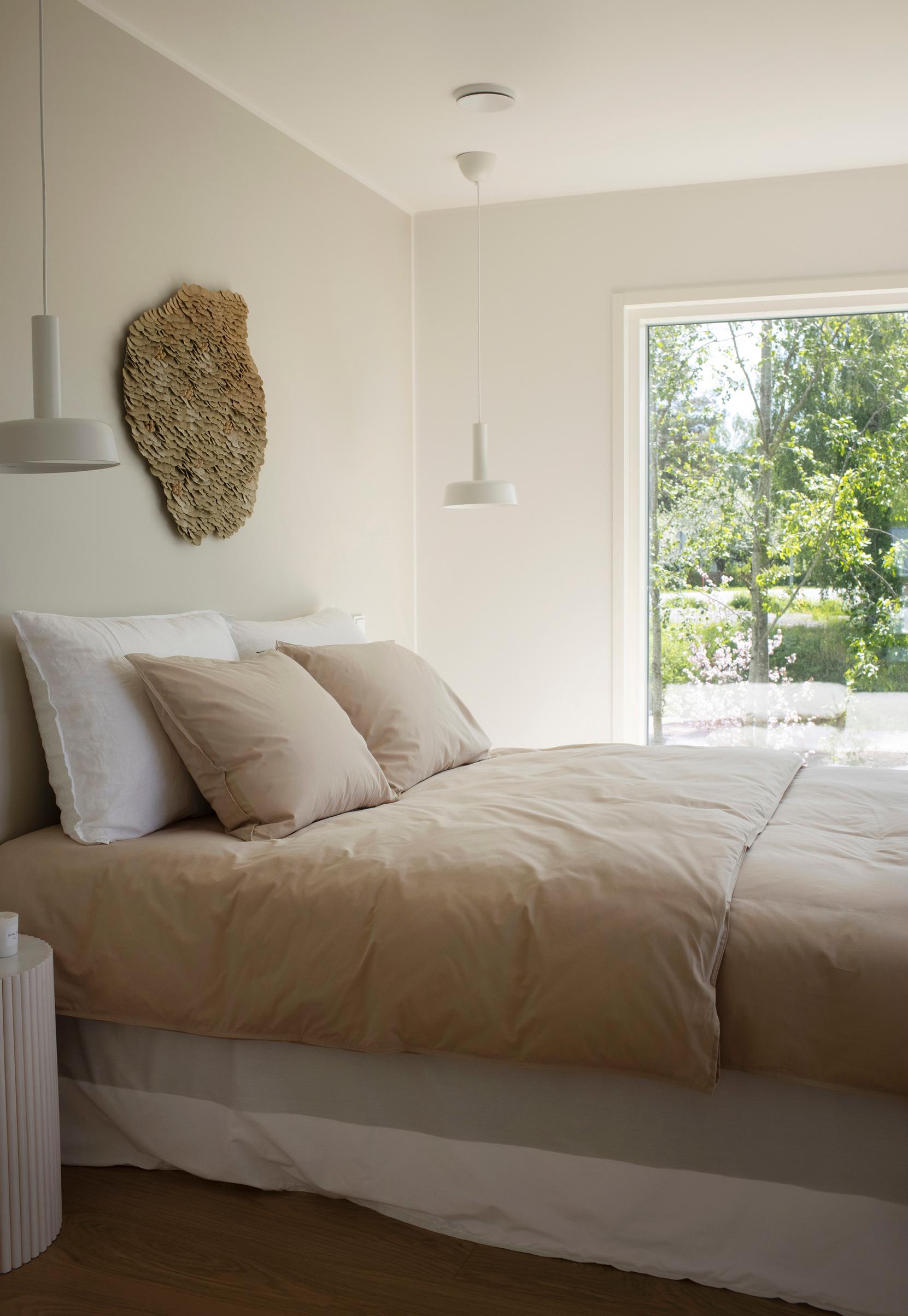 Makuuhuoneen ikkunasta voi ihailla lohjalaista maisemaa. Seinällä on Marianne Huotarin upea keraaminen veistos. Cafe-riippuvalaisimet ovat Innoluxin. Puuvillaiset petivaatteet ja runkopatja ovat Familonin. Stroy 188 -tammiparketti on Upofloorin. Sisustussuunnittelu Sanna Siik-Keskisarja. Kohde 4, Kastelli Veistos.