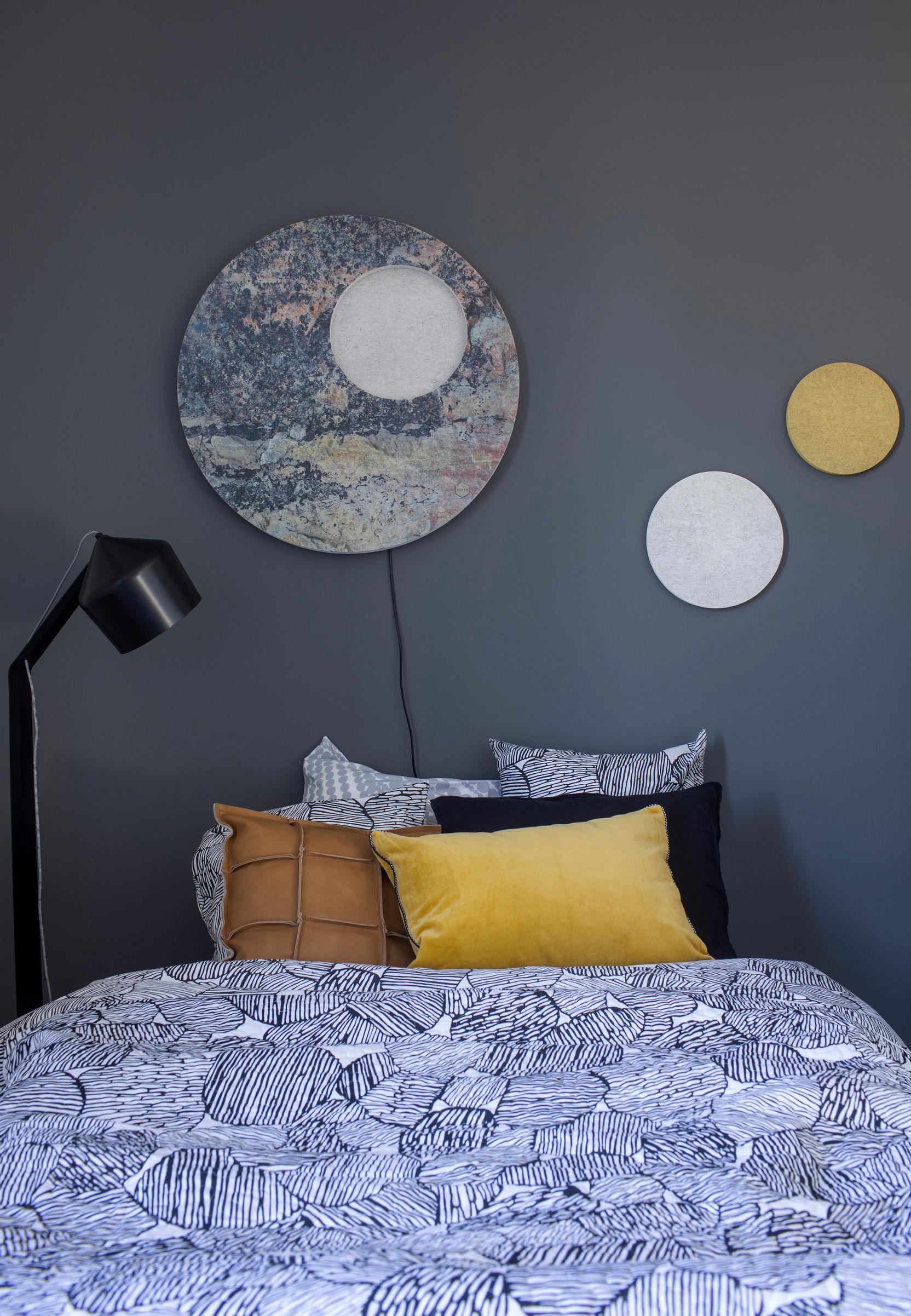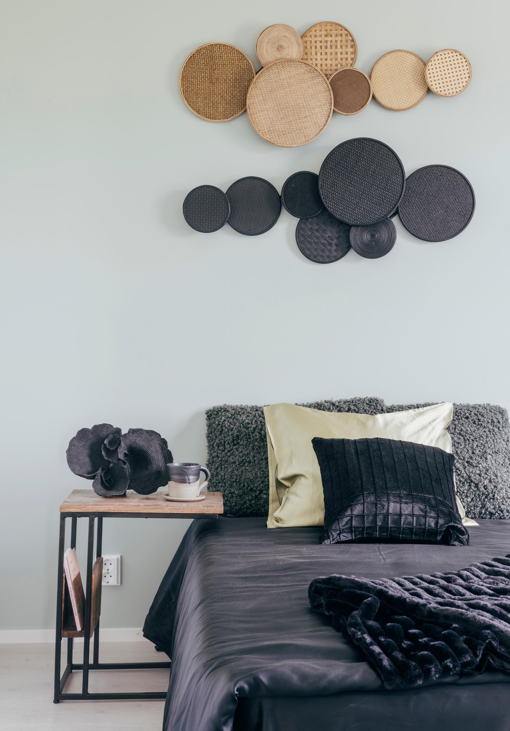 Sängyn päätyseinä on oivallinen paikka taiteelle ja erilaisille seinäasetelmille. Esimerkiksi pyöreistä koreista tehty kollaasi, kuvatapetti tai keraaminen veistos kerää katseet makuutilassa.