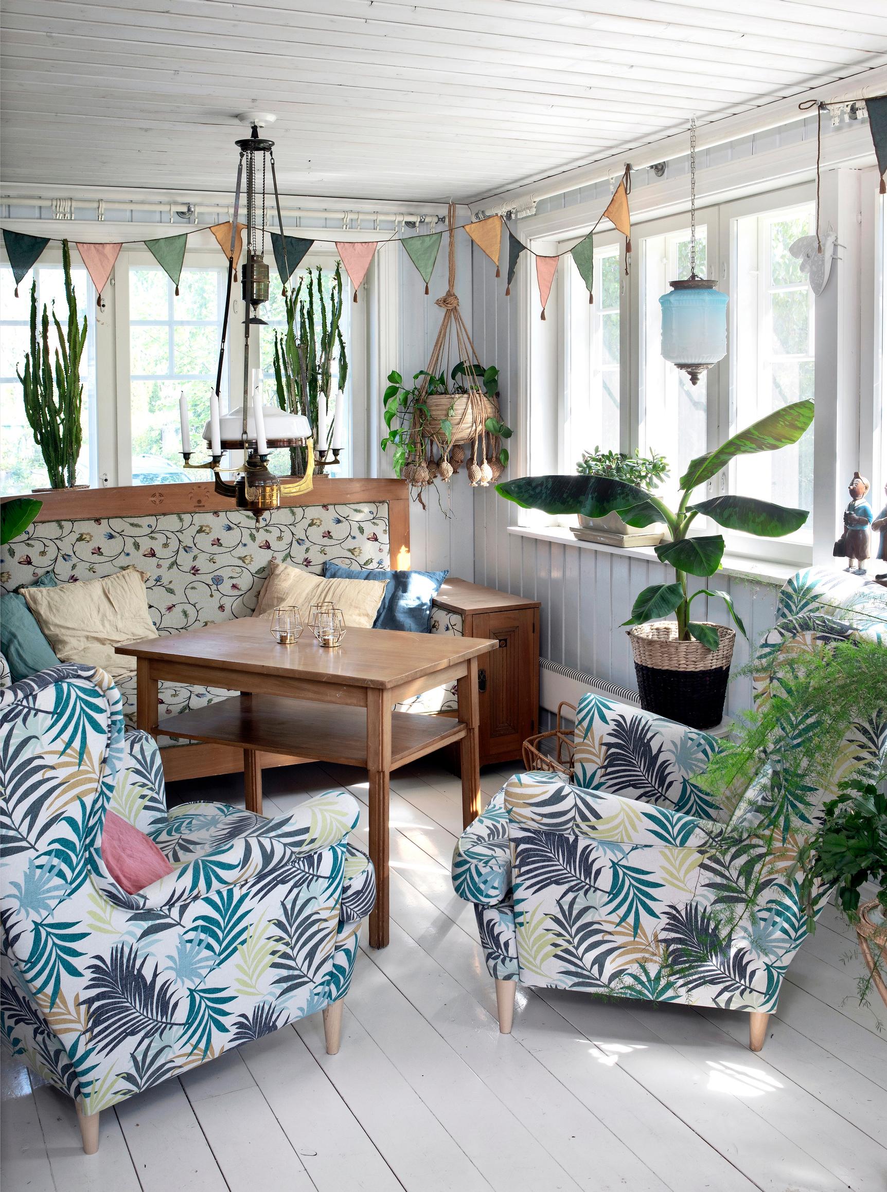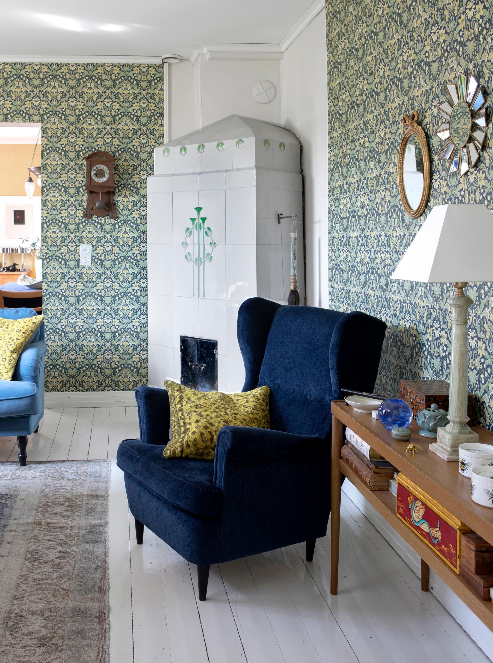 Ennen kuin talon omistus oli edes siirtynyt meille, lähdimme jo mitat taskussa huutokauppa- ja kirpputorikierrokselle. Olemme ostaneet kalusteita sekä harkiten että impulsiivisesti. Olohuoneen kalustus meni uusiksi, kun kierrätyskeskuksessa tuli vastaan kaunis sohvapöytä. Vanhat sohvat muuttivat kellariin, ja tilalle hankimme nojatuolin jalkaraheineen. Samalla vaihdoimme tapetit. Nykyisin ideoita tulee myös Vesan työn kautta, ajatuksella ”meille Ikeaan on tulossa tämmöinen kiva juttu, sopisikos se kotiin?”.
