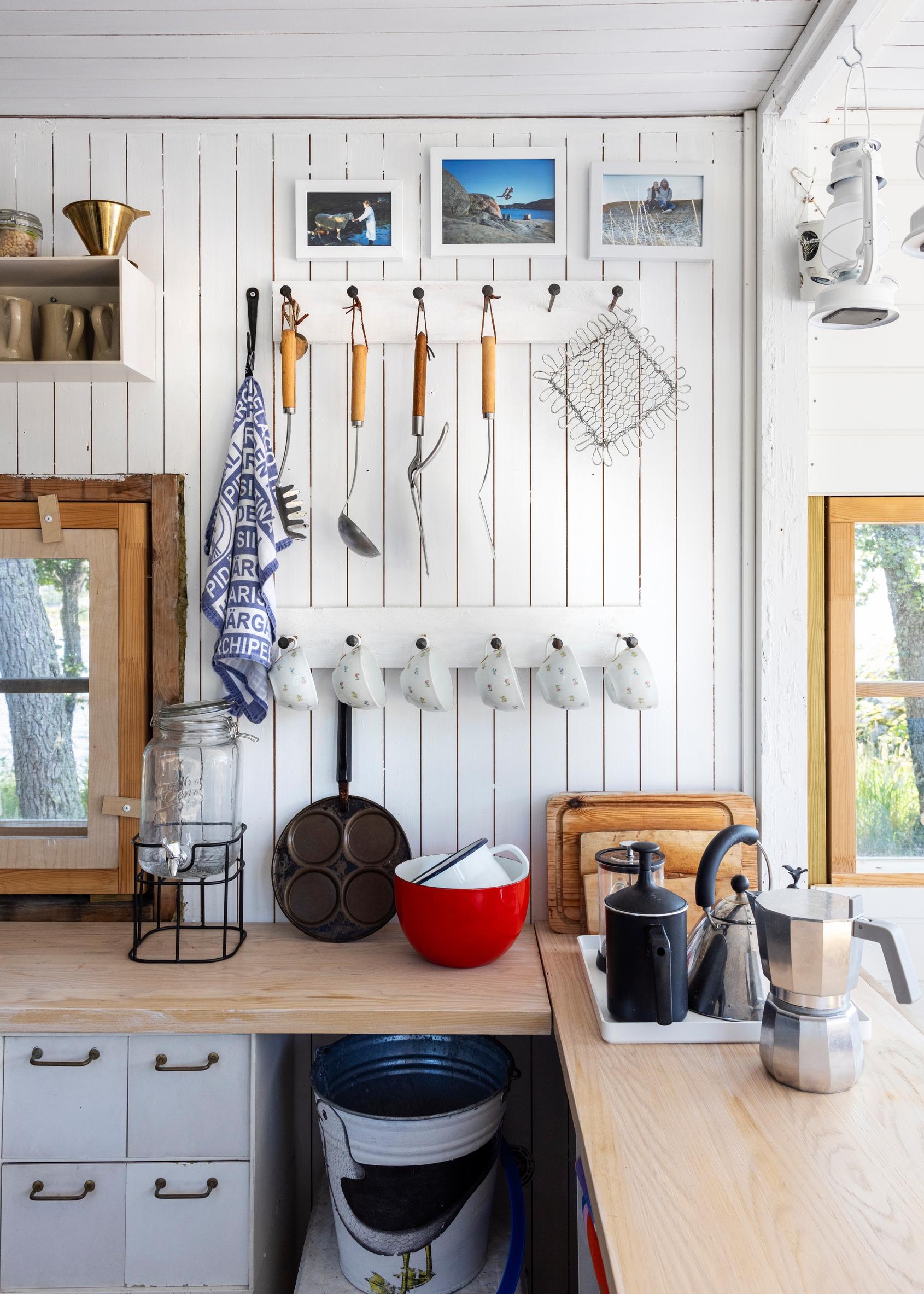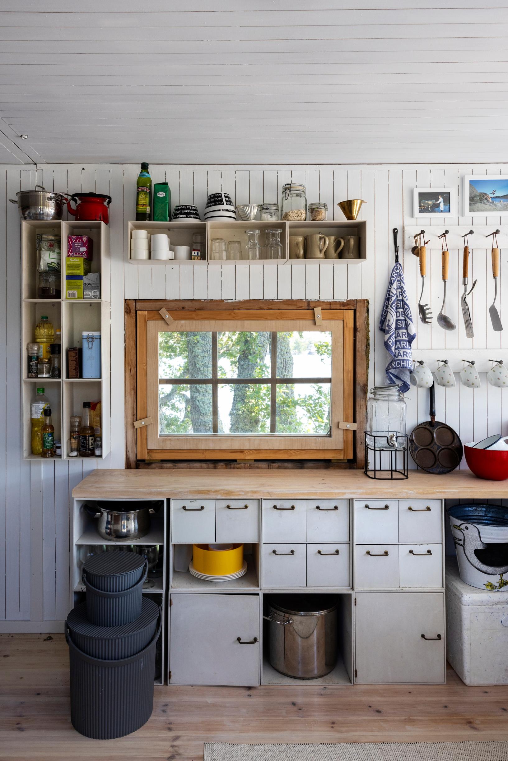 Pienen rakennuksen sydämessä on Ristomatti Ratian suunnittelemasta Palaset-sarjasta koottu keittiö, jota ei ole tarvinnut muokata uusiksi missään vaiheessa. Niin Kerstinille, hänen aikuisille lapsilleen kuin uusille omistajille juuri Palaset-keittiö on yksi mökin kulmakivistä. Vuonna 1972 julkaistu modulaarinen Palaset-sarja jos mikä on osoitus ajattomasta muotoilusta.