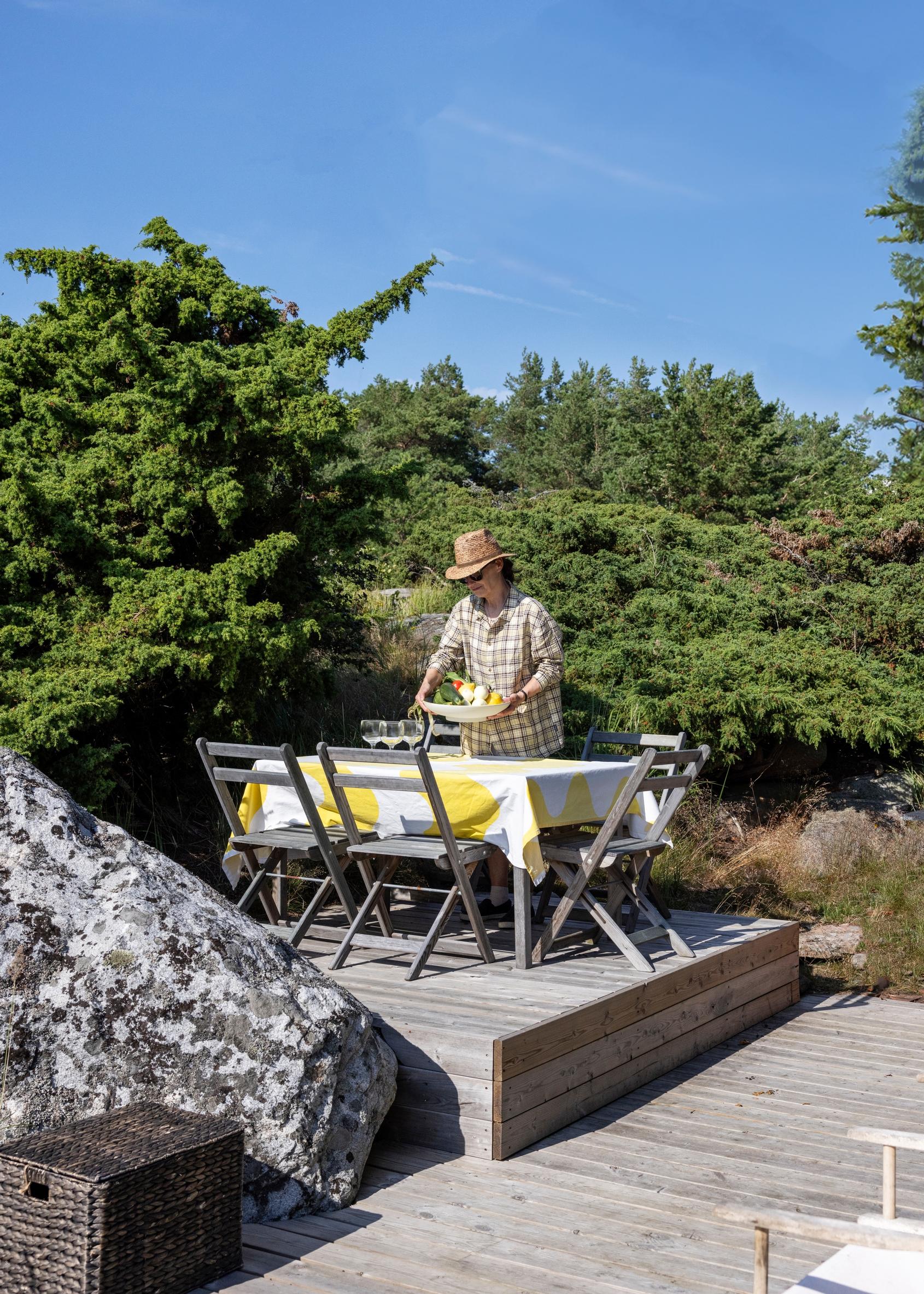 – Eräänä kesänä vedin lankapuhelimen jatkojohdon mökin ikkunasta ulos, että saatoin jutella ystävän kanssa auringossa loikoillen. Siinä minä istuin kallion reunalla, siemailin punaviiniä ja kerroin, että odottelimme veneellä toimitettavia sisäfileitä kyläkaupasta. Nauroin, kuinka ihminen osaa todella maksimoida yksinkertaisuudesta syntyvät nautinnot, kun sille päälle sattuu, Kerstin muistelee saarivuosien taikaa.