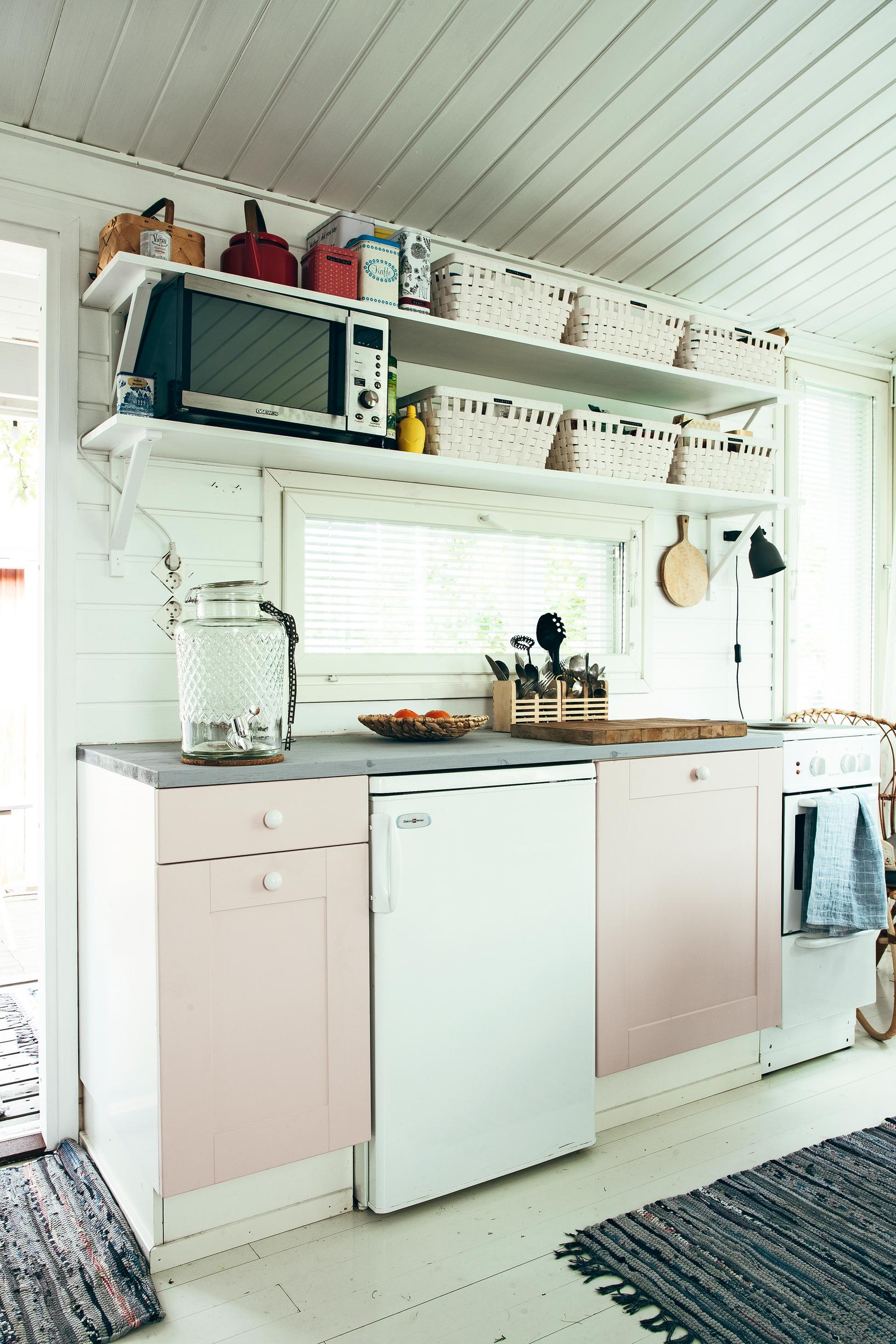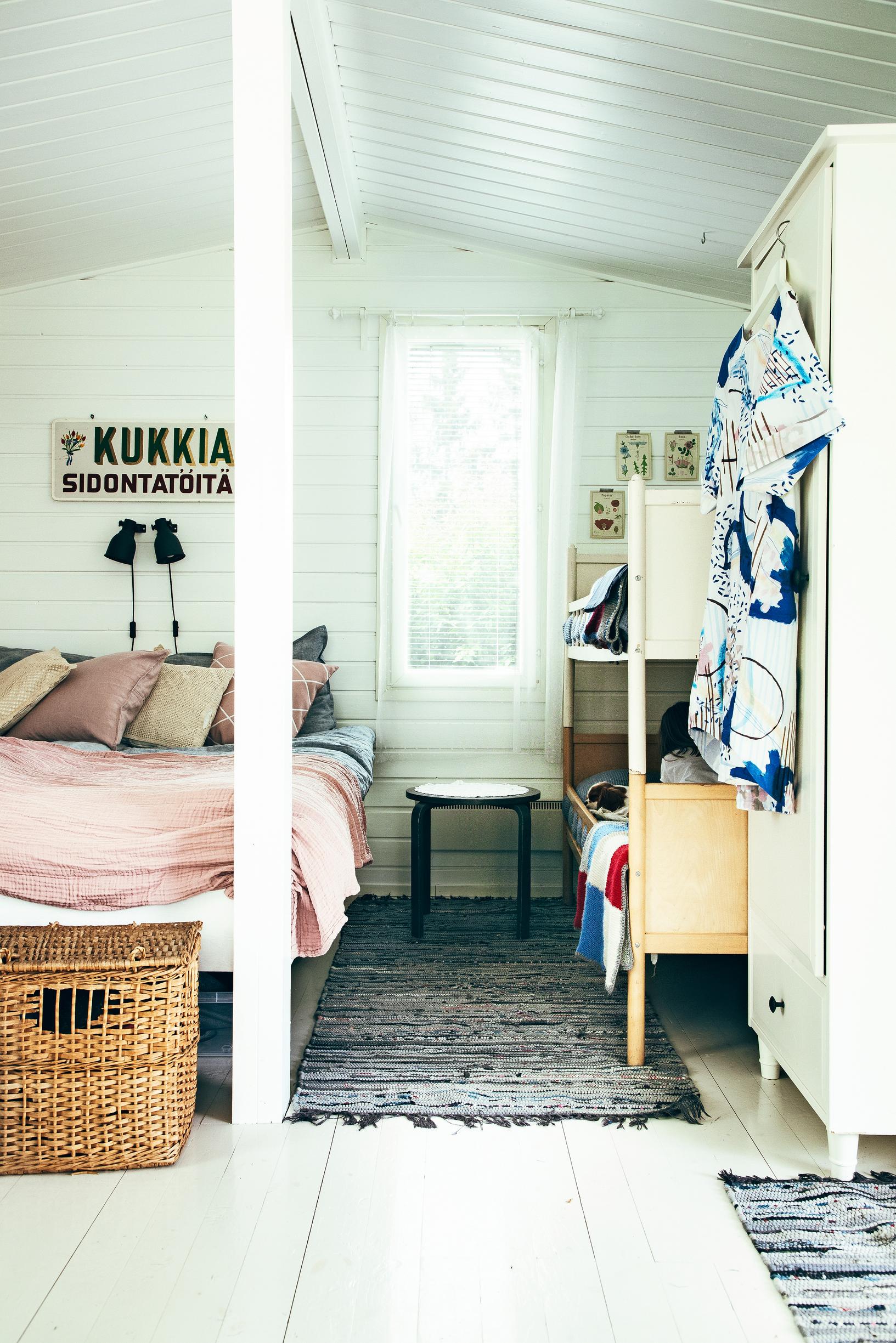 Suomenlinnan saarella asuvan Marin ja Santun perheen ihastuttava kesäkeidas sijaitsee mantereella Kumpulassa, joka on Helsingin toiseksi vanhin siirtolapuutarha-alue. Perhe hankki mökin seitsemän vuotta sitten. Silloin he asuivat kolmen raitiovaunupysäkin päässä Hermannissa. Nykyisin mökkimatka aloitetaan lautalla, ja loppumatka taittuu ratikalla.