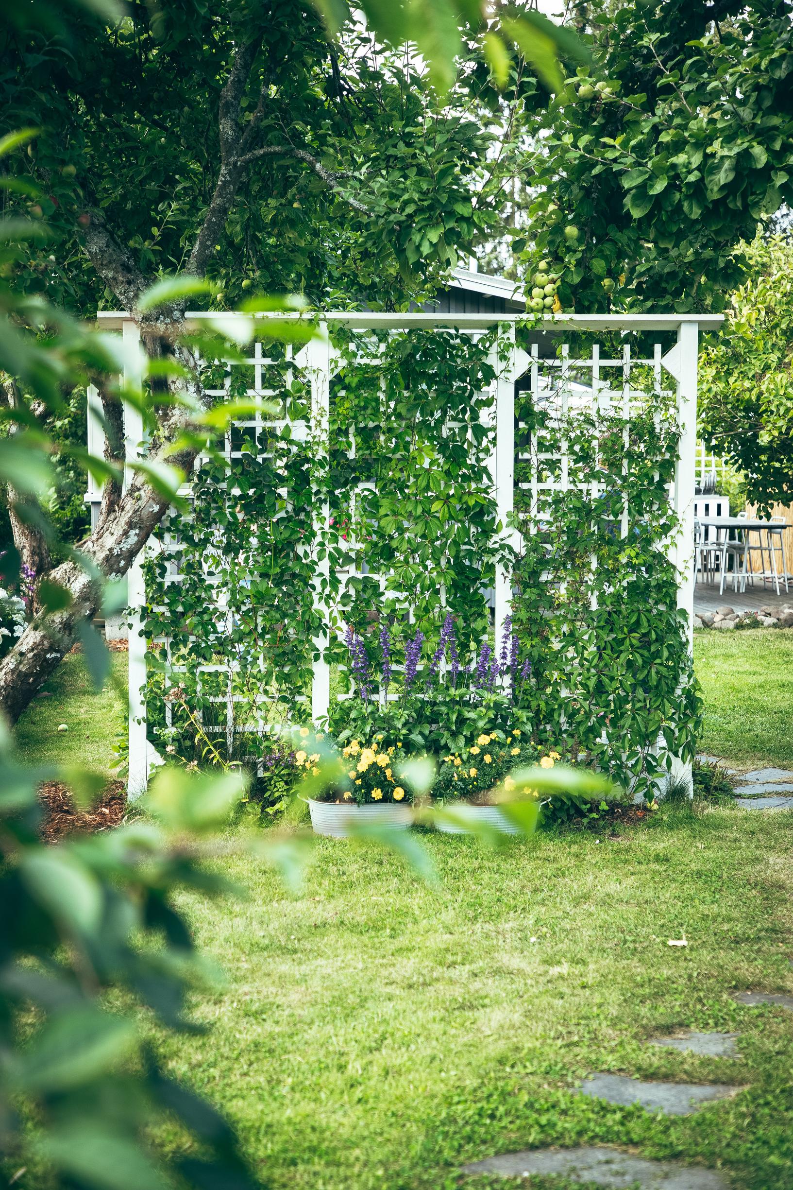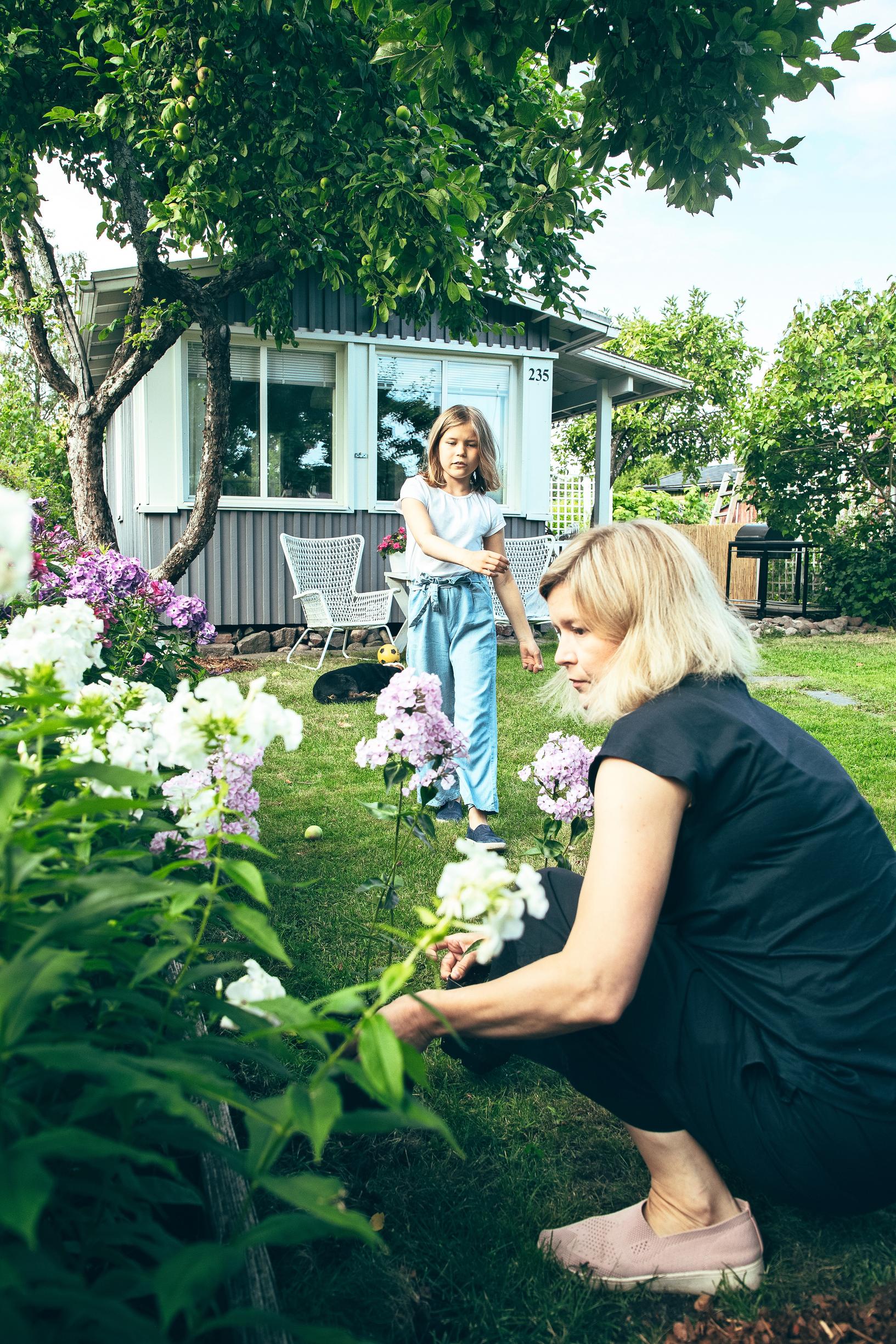 Hah, kun muutimme tänne, minun piti googlettaa, mikä on perenna. Siitä on tultu aikamoinen matka. Pihahommat ovat minulle tärkeä maadoituskeino hektisen työelämän vastapainoksi. Olen ihastunut romanttiseen cottage garden -tyyliin, johon kuuluvat runsaat ja rehevät kukkaistutukset. Suuri rakkauteni ovat liljat, mutta silmä lepää myös vanhoissa omenapuissa, jotka luovat ihania sateen- ja auringonvarjoja pihalle.