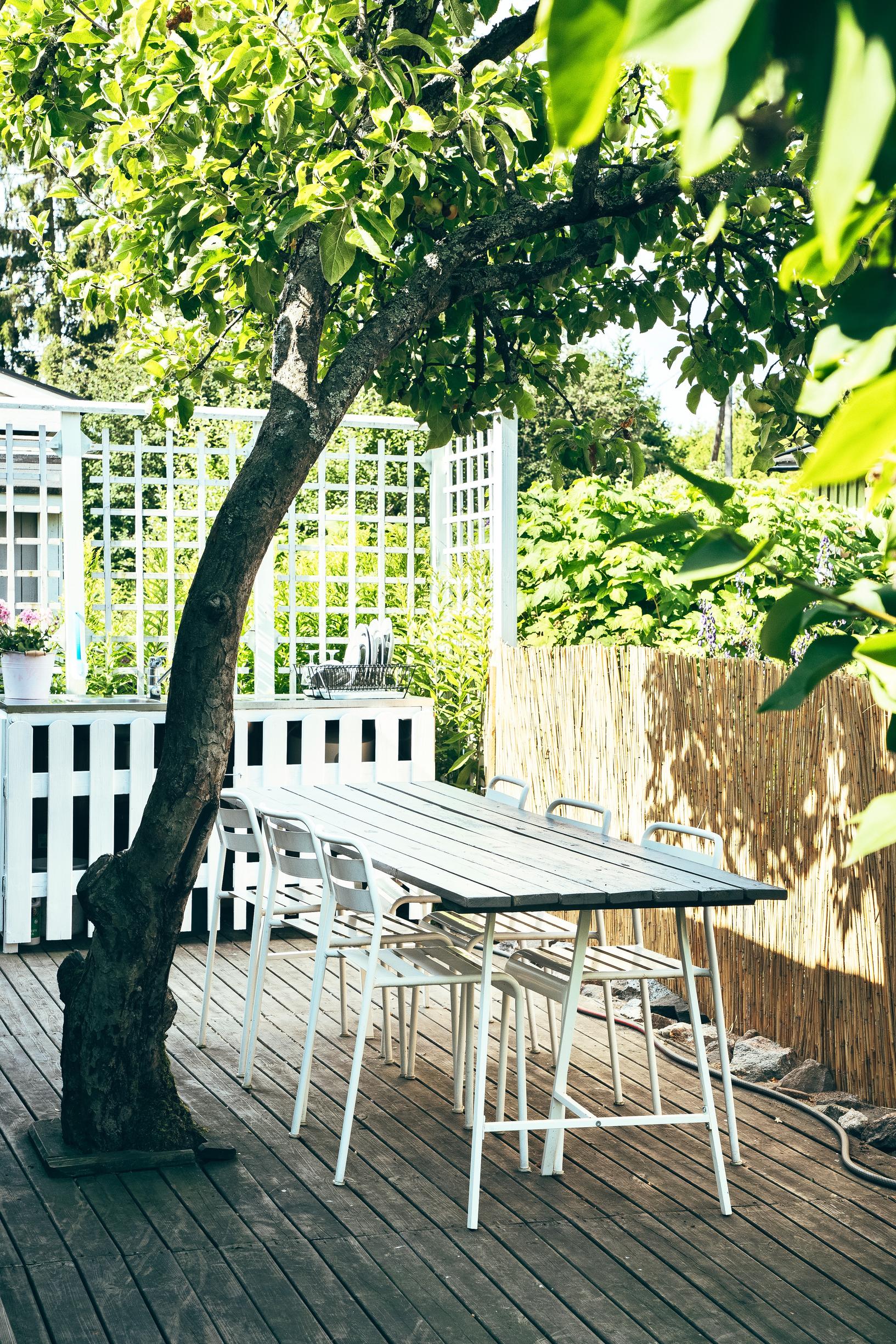 Maalasimme mökin sisältä ja ulkoa sekä rakensimme talon viereen ruokailutilan. Pihan myllersimme täysin. Ruusut ja vanhat perennat raivasimme pois, jotta saimme tilaa koirille ja lasten leikeille. Siirsimme perennat ja kukkaistutukset pihan reunoille ja perustimme hyötypuutarhan portin pieleen. Piha on täynnä toinen toistaan kauniimpia kukkaistutuksia.