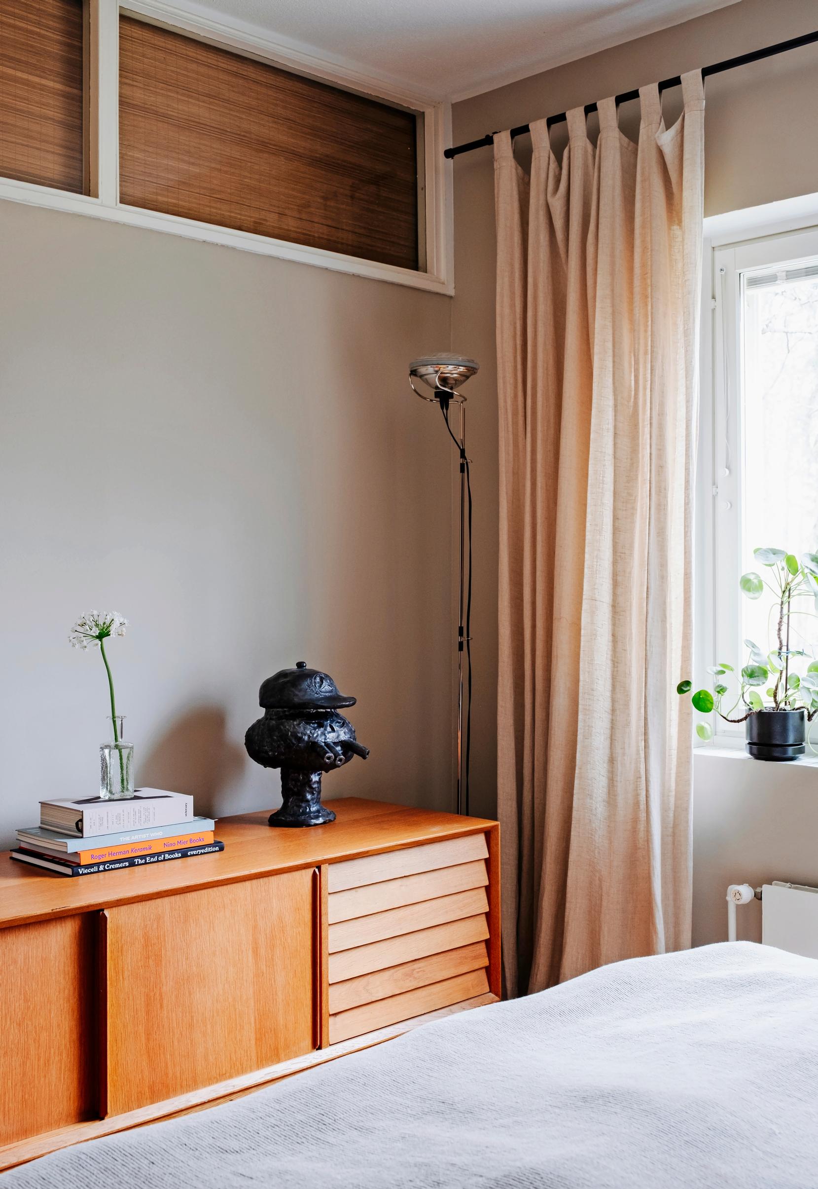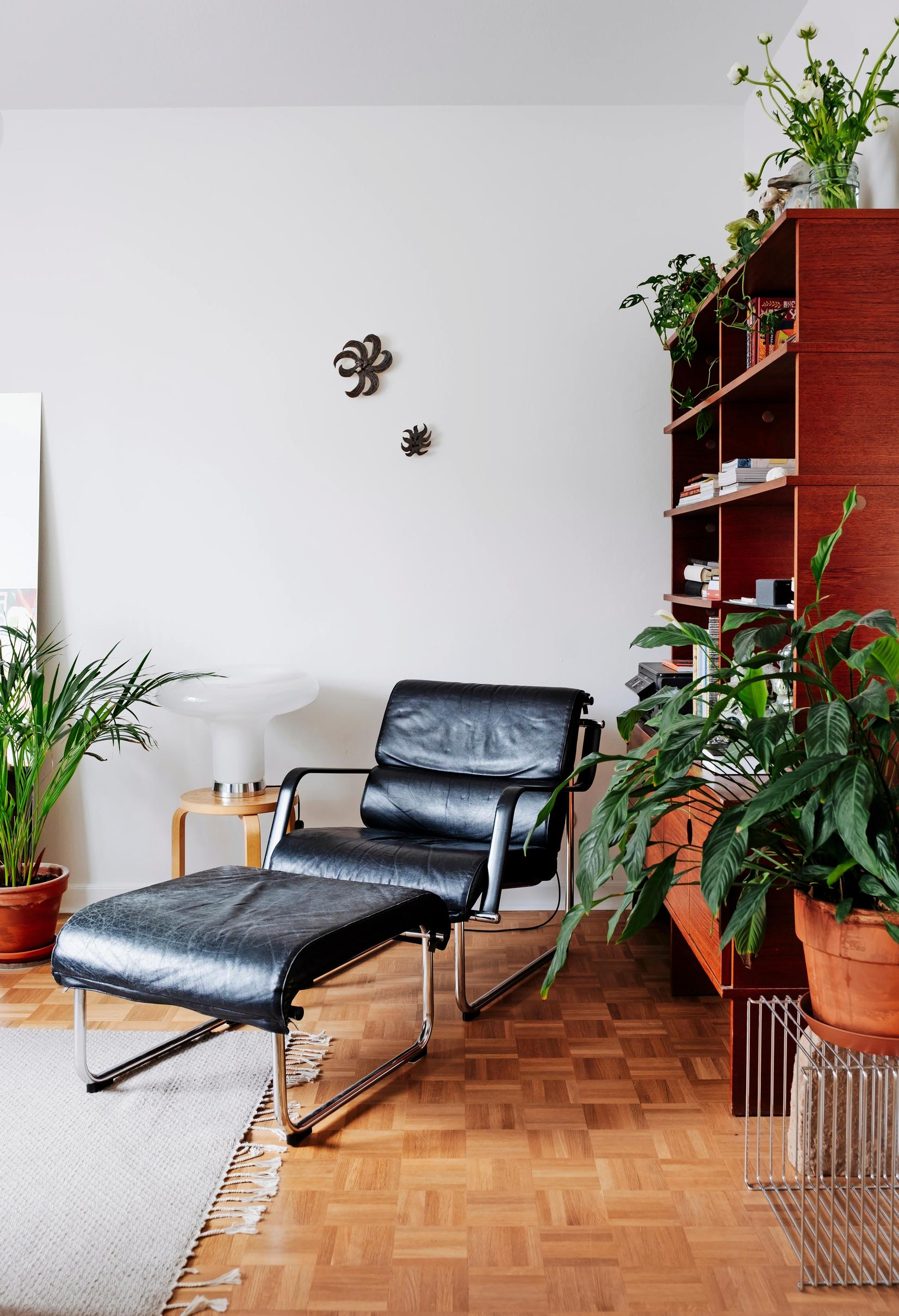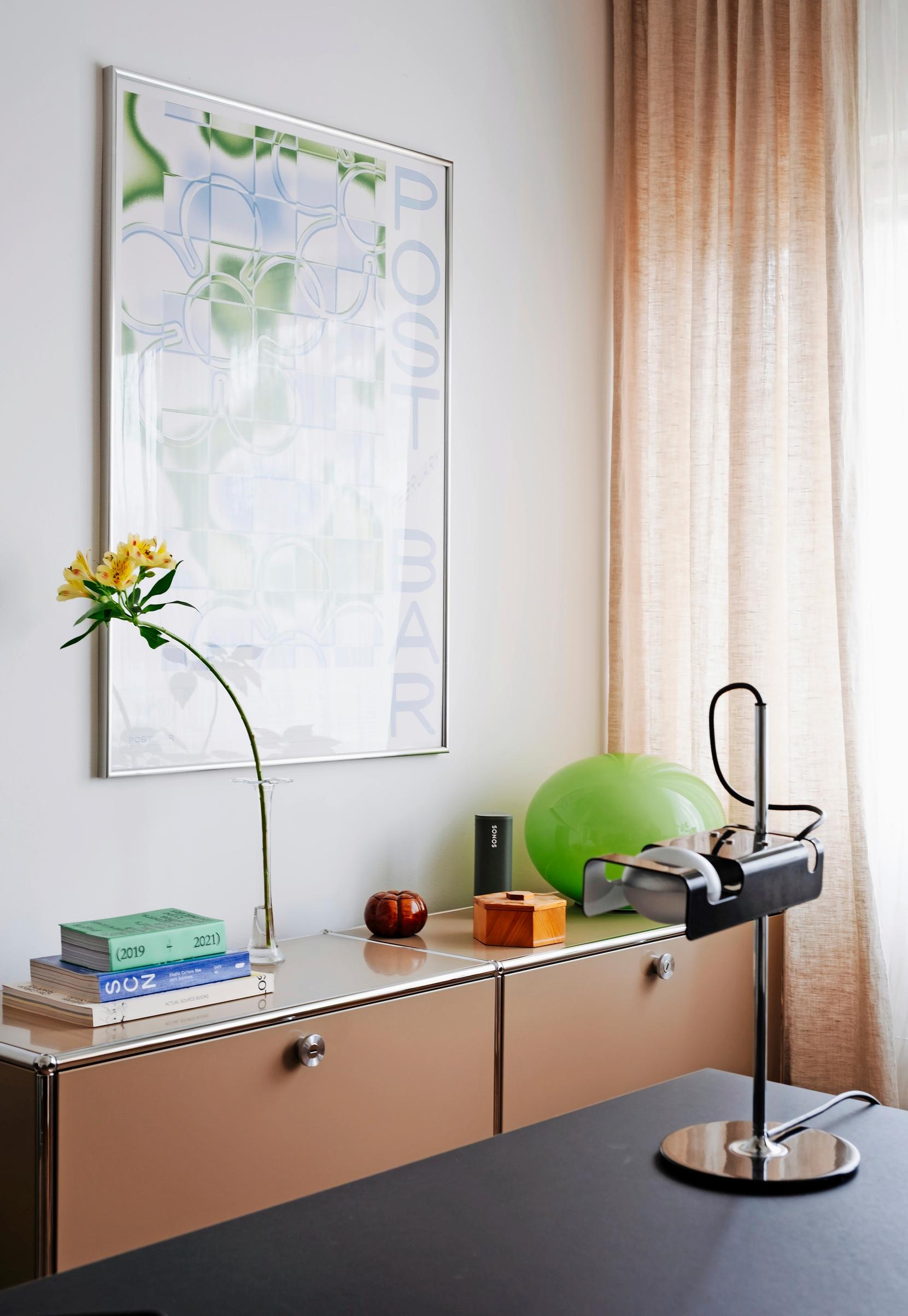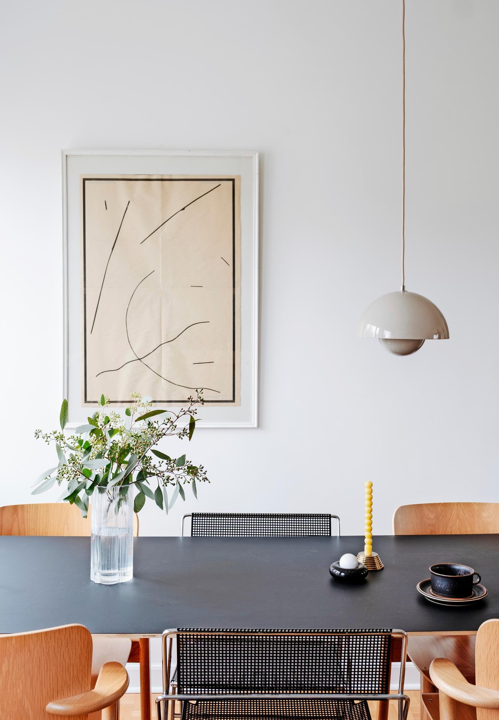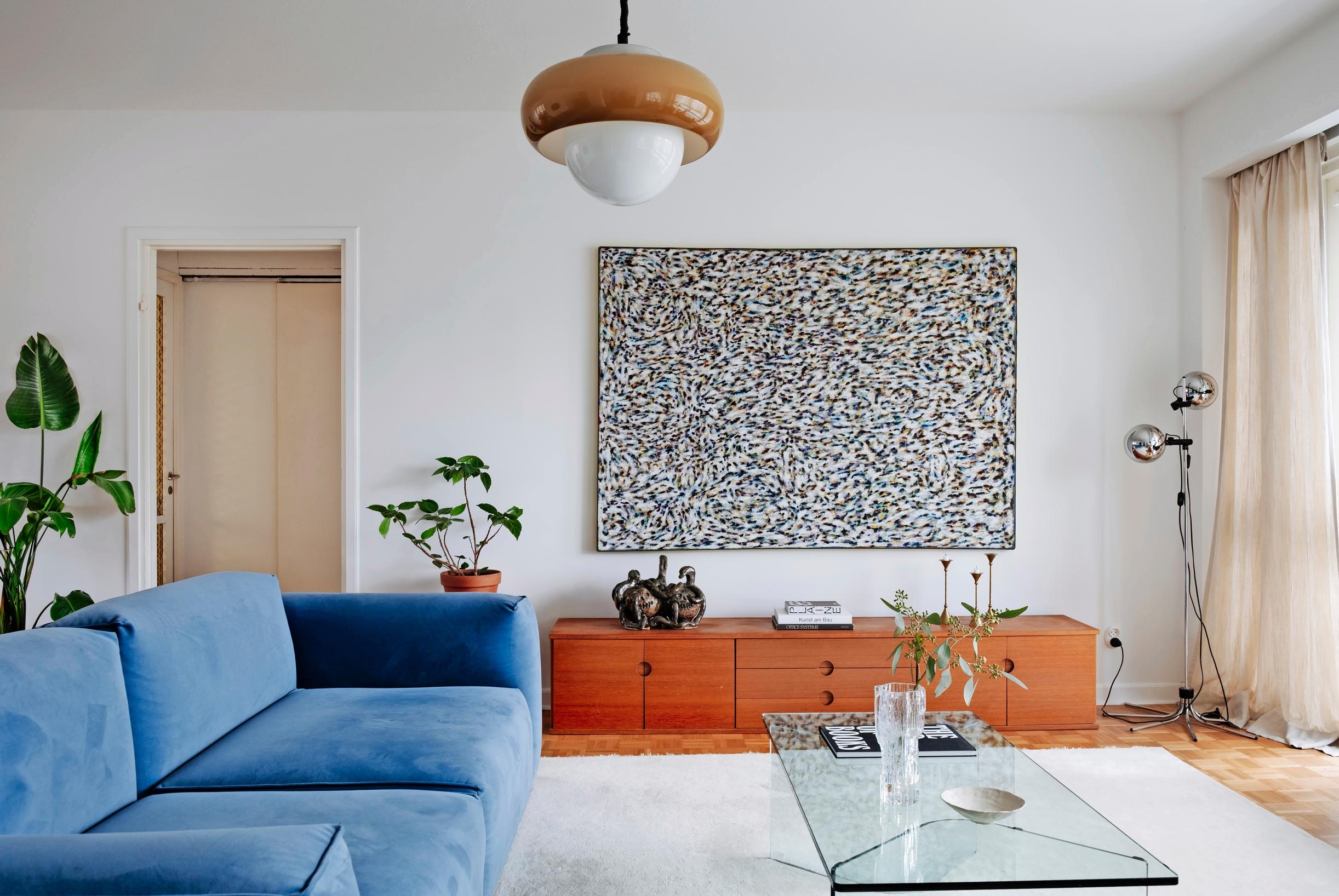 Marina ja Robert harkitsevat sisustushankintoja huolella. He malttavat odottaa jopa vuosia, kunnes vastaan tulee jotain, josta he todella pitävät. Yksi mieluisimmista löydöistä on olohuoneen Harvey Guzzinin kattovalaisin 1970-luvulta. Siinä on herkullisen pulleat, sisäkkäiset muodot.