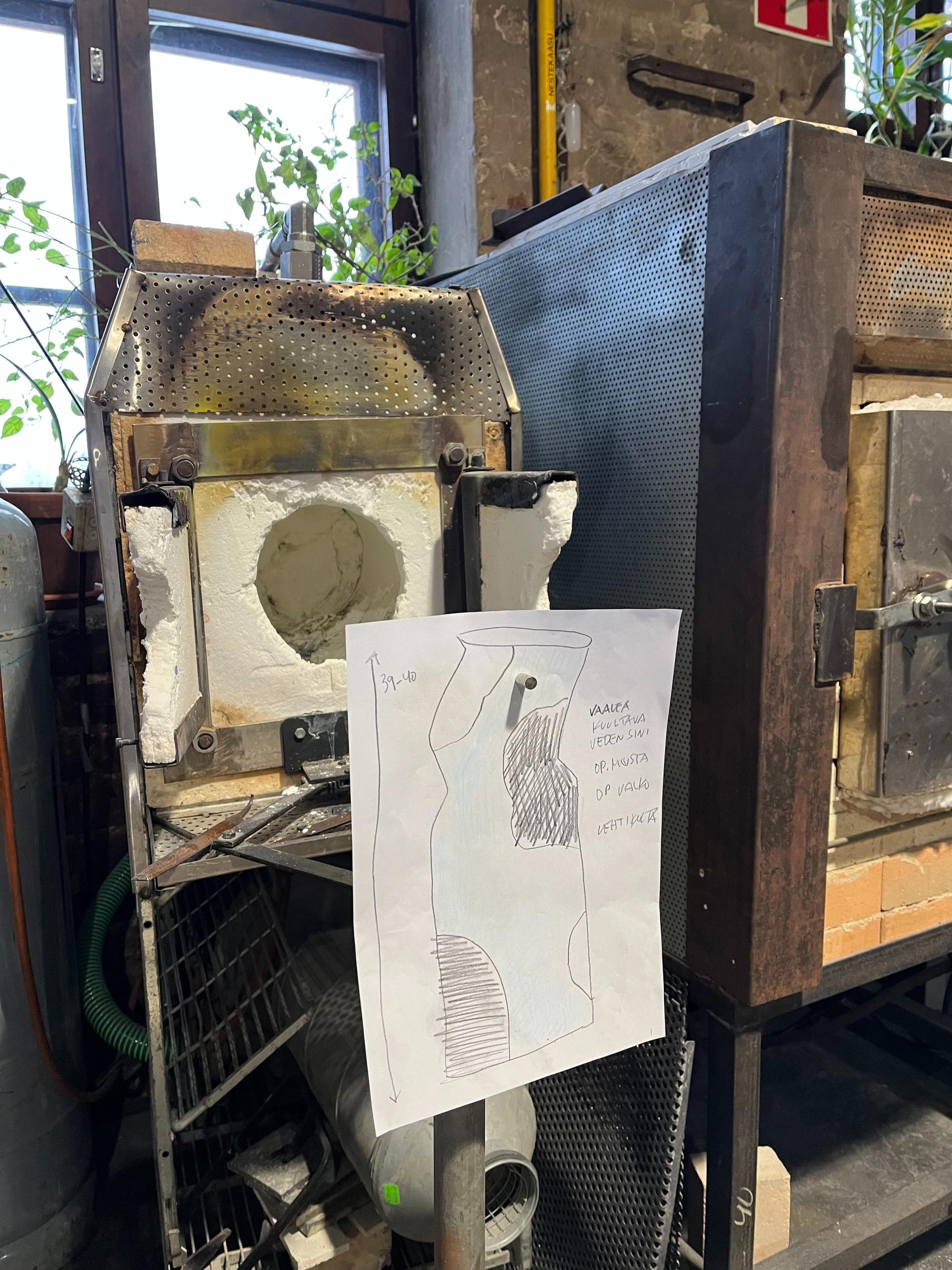 Teoksesta pitäisi lopulta tulla maljakkomainen, ainakin 40 sentin korkuinen veistos, ja sen nimi on Käänne. Mallinaan Lähdesmäki käyttää Pirin käsin piirtämää luonnosta, josta voi myös päätellä, että valmiissa teoksessa on paljon sinistä ja valkoista muttei lainkaan punaista, vaikka toisin luulisi, kun katsoo puhalluspillin päähän kerättyä polttavan kuumaa lasimassaa.