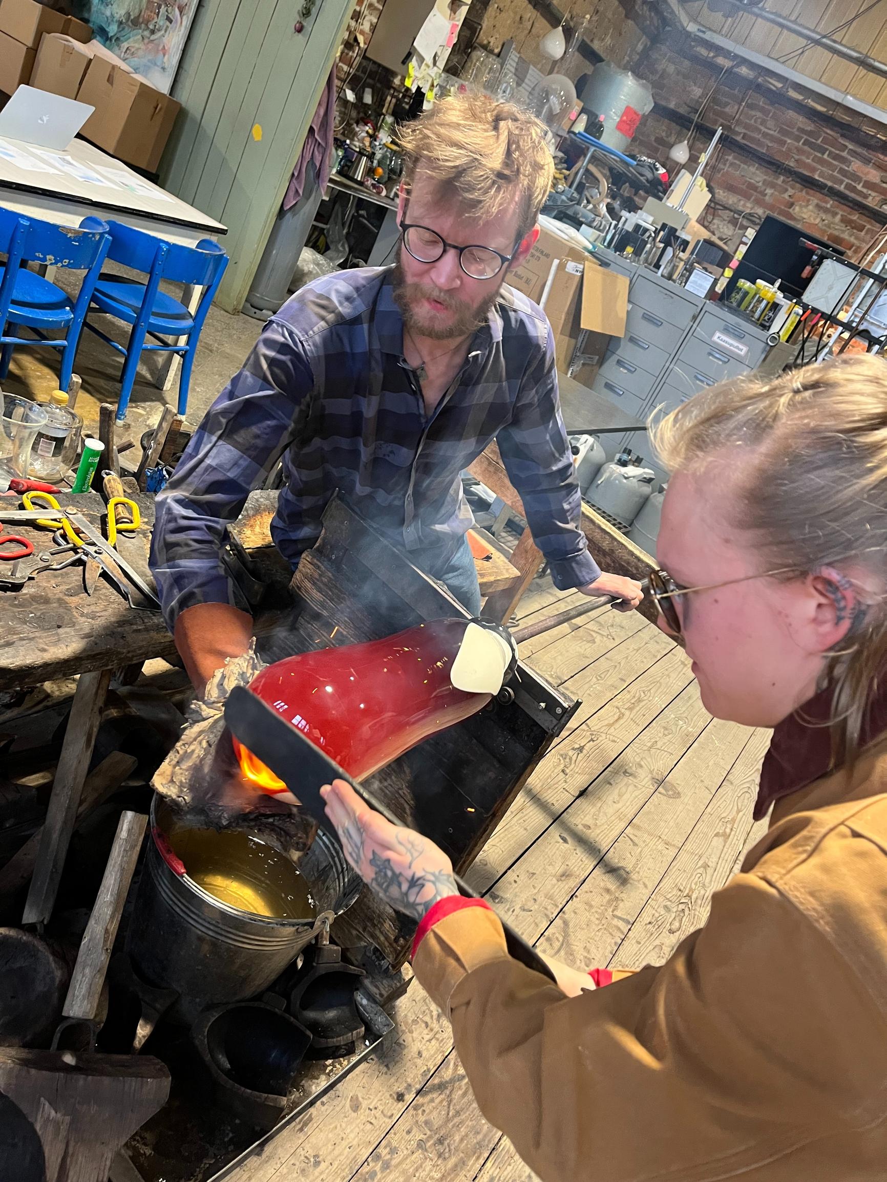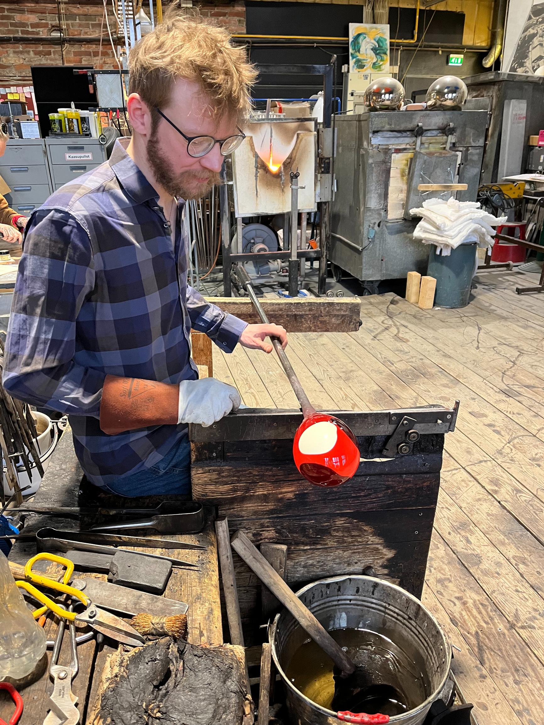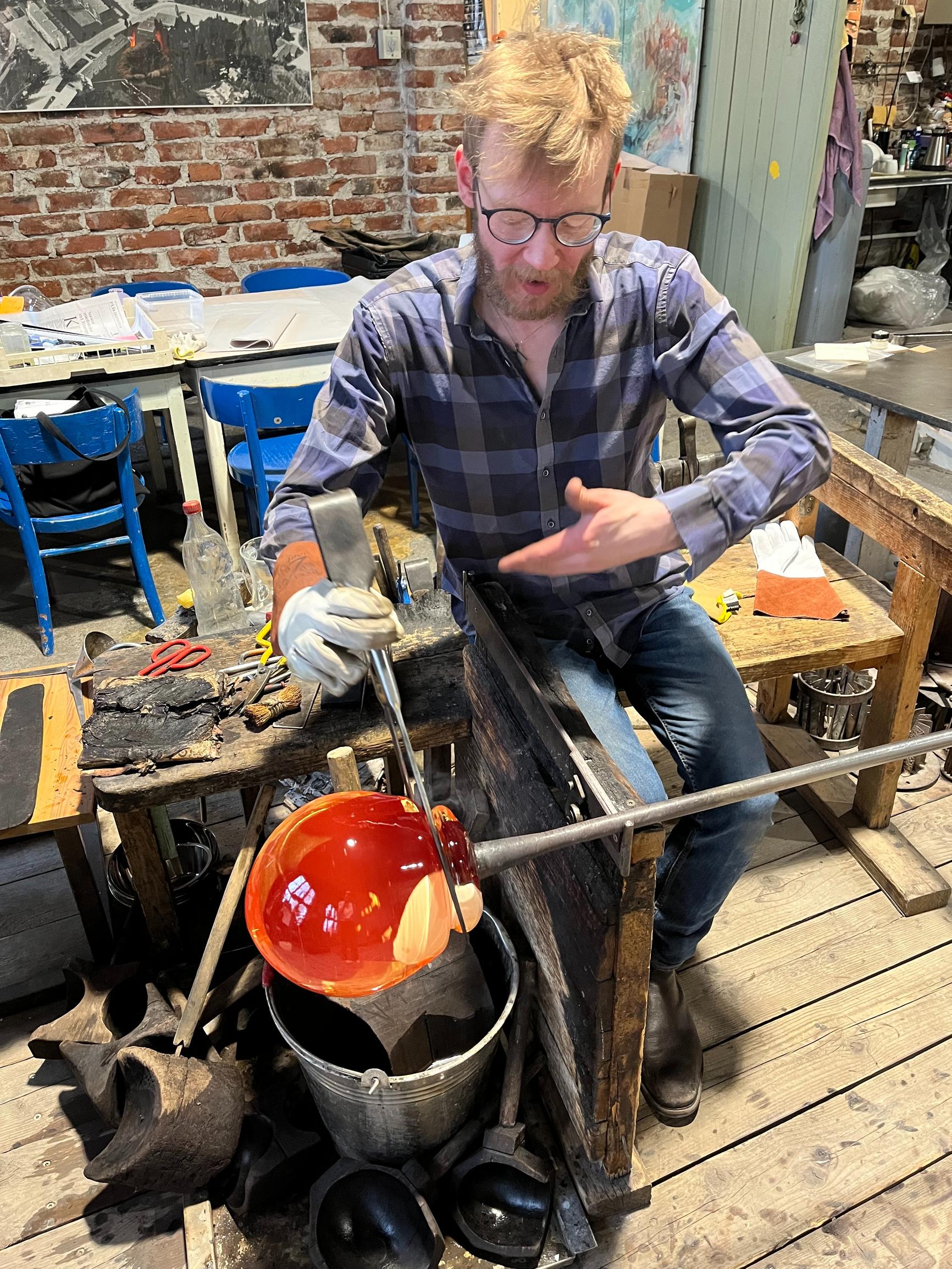 Nyt on kuumat paikat osuuskunta Lasismin hytissä Riihimäellä, entisen Riihimäen lasitehtaan perinteitä huokuvissa tiloissa. Lasinpuhaltaja Kaappo Lähdesmäki ja lasialan opiskelija Linda Tidenberg työstävät vapaasti suupuhallettavaa taidelasiteosta, joka tulee esille muotoilija Markku Pirin näyttelyyn Suomen lasimuseoon, vain 600 sadan metrin päähän sen syntypaikasta.