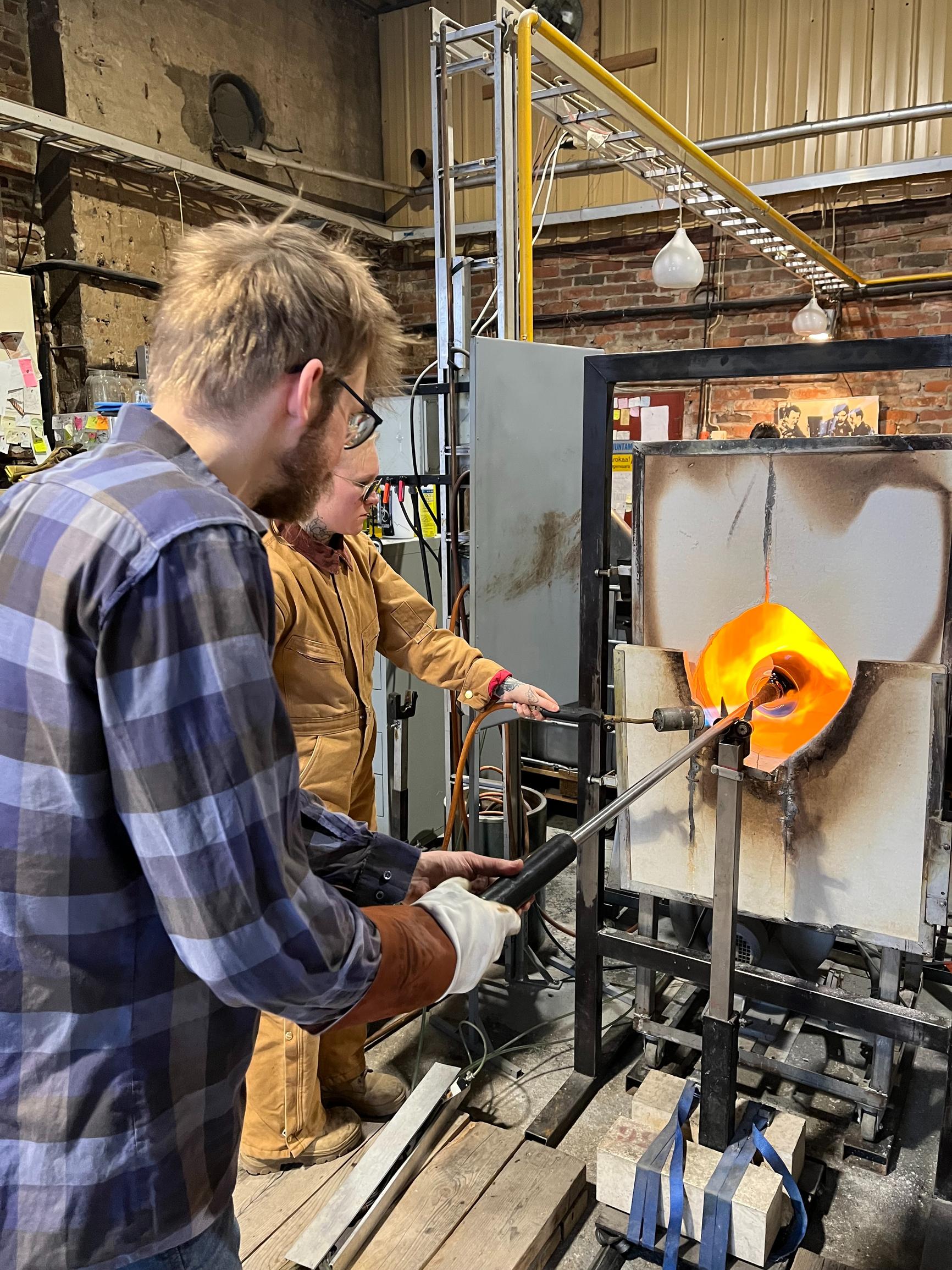 Alkuvaiheessa Kaappo Lähdesmäki ottaa vähän kerrassaan lisää lasia puhalluspillinsä päähän, pitää lasin koko ajan liikkeessä ja antaa esineelle muotoa. Piri seuraa tarkkaavaisena vieressä ja ohjaa tarvittaessa teoksen muotoutumista haluamaansa suuntaan.
