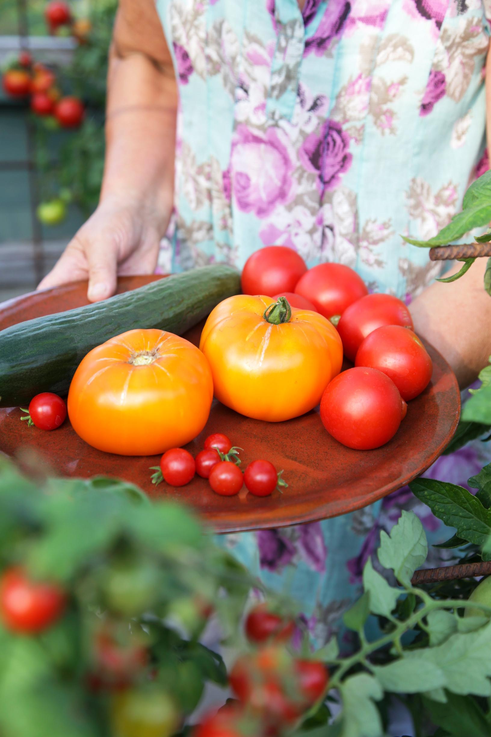 Kasvimaalla on hurjat määrät myös makeita sokeriherneitä, koska ne ovat puutarhassa päivittäin vierailevien lastenlasten suosikkeja. Pieniin suihin sopivaa naposteltavaa on muuallakin kasvamassa runsaasti. Pensasmustikoiden oksat notkuvat kypsyvistä pulleista marjoista, ja kasvihuoneen ananaskirsikkapensaan kirpeänmakeat hedelmät ovat pian valmiita herkuteltaviksi. Sen vieressä roikkunut ’Hundreds & Thousands’ -amppelitomaatti innostui tekemään niin hurjasti sokerisen makeita hedelmiä, että May-Len joutui siirtämään taimen vanhaan muovihuoneeseen, jotta kasvihuoneessa mahtui kulkemaan.