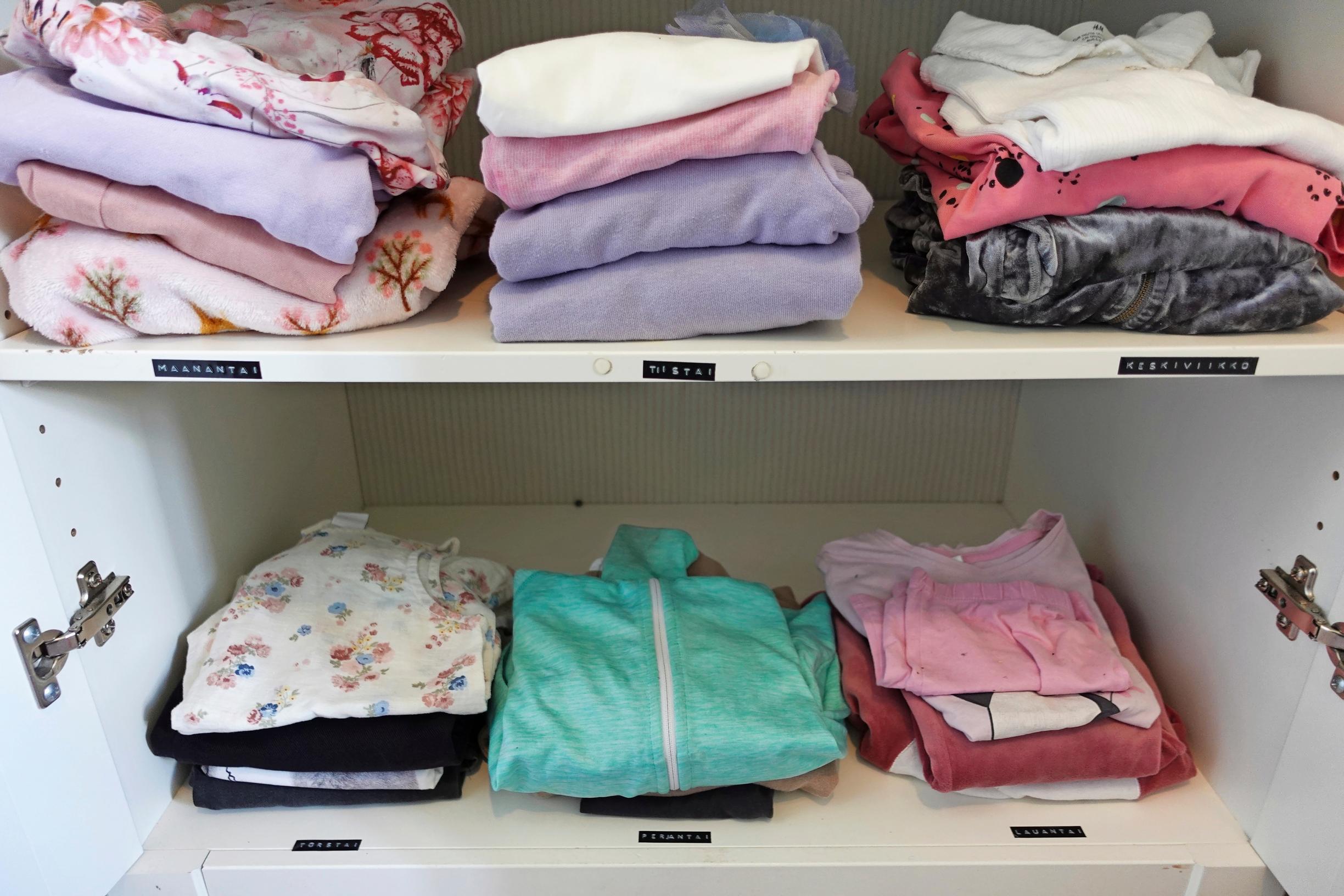 Olen karsinut vaatteita ja astioita, ja se on vähentänyt siivouksen määrää. Tiskikone pitää laittaa joka ilta pyörimään, jotta meille riittää aamuksi kuppeja. Pyykkikonekin pyörii meillä päivittäin. Puolisen vuotta sitten karsin lasten vaatteita, ja nykyään heillä on vain yksi asu jokaiselle viikonpäivälle. Etenkin viisi - ja kahdeksanvuotiaille kertyy yhä leluja, mutta sääntömme on, että jokaisella tavaralla pitää olla koti ja jos sellaista ei ole, se pitää keksiä. Käyttämättä jääneet tavarat laitetaan eteenpäin.
