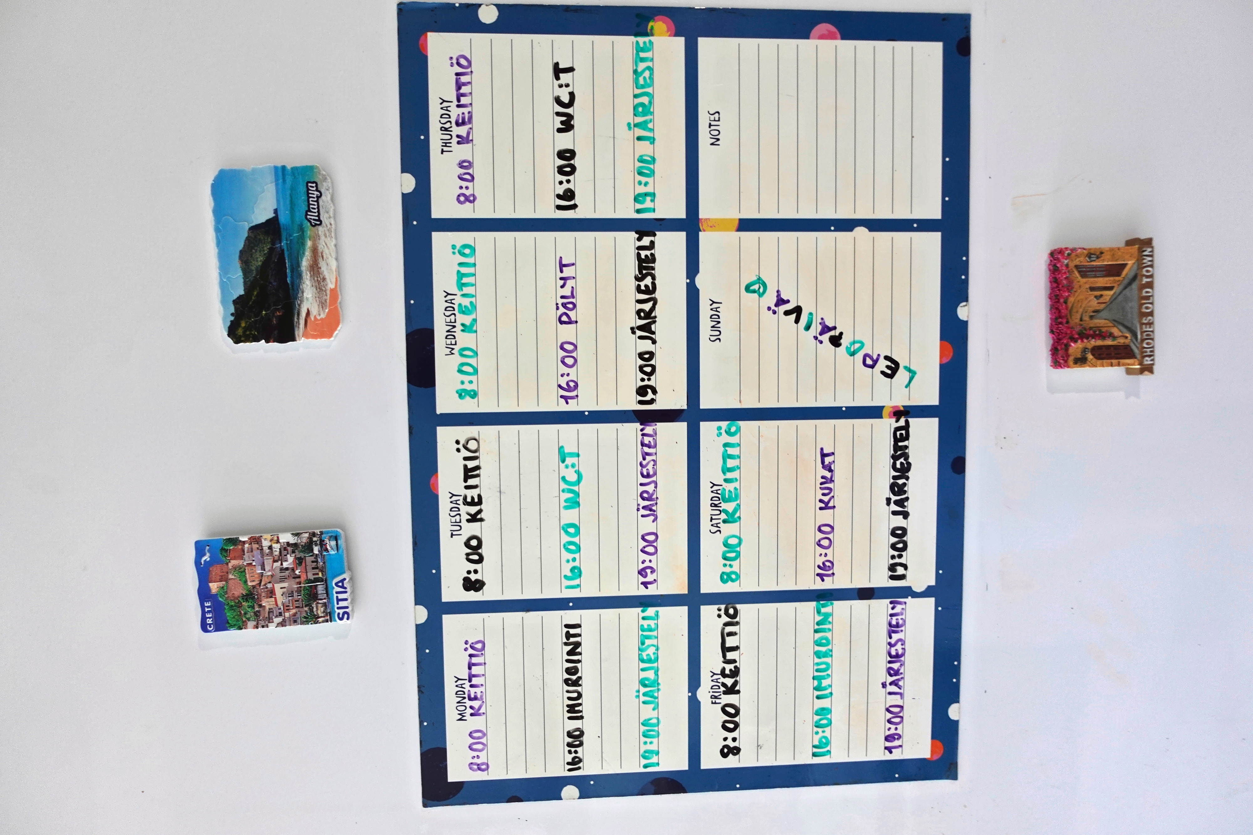 Parhaiten meillä toimii kiertävä kotityölista. Se tarkoittaa tällä hetkellä sitä, että eskari-iästä alkaen jokaisella lapsella on kerran päivässä siivoustehtävä. Aamuisin yhden vastuulla on keittiön siistiminen, iltapäivällä toisella imurointi-, lattianpesu- tai pölyjenpyyhkimisvuoro. Illalla kaikki vievät tavaransa paikoilleen ennen nukkumaanmenoa. Merkitsen hoidetut kotityöt tauluun, josta jokainen voi itse katsoa tulevat tehtävänsä.