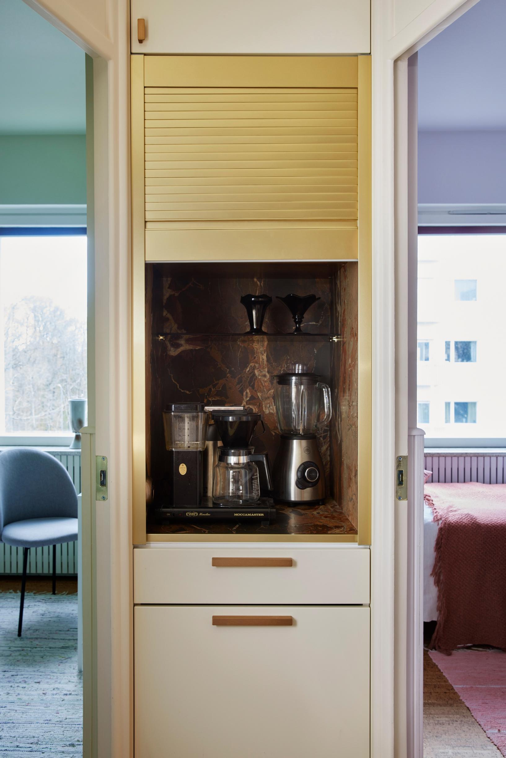 Meja suunnitteli keittiön ensin nykyisen ruokailutilan paikalle, mutta taloyhtiö ei hyväksynyt suunnitelmaa haastavien putkivientien vuoksi. Uuden suunnitelman myötä keittiö sijoittui käytävämäiseen eteiseen. Näin hän sai huoneistoon yhden huoneen lisää.