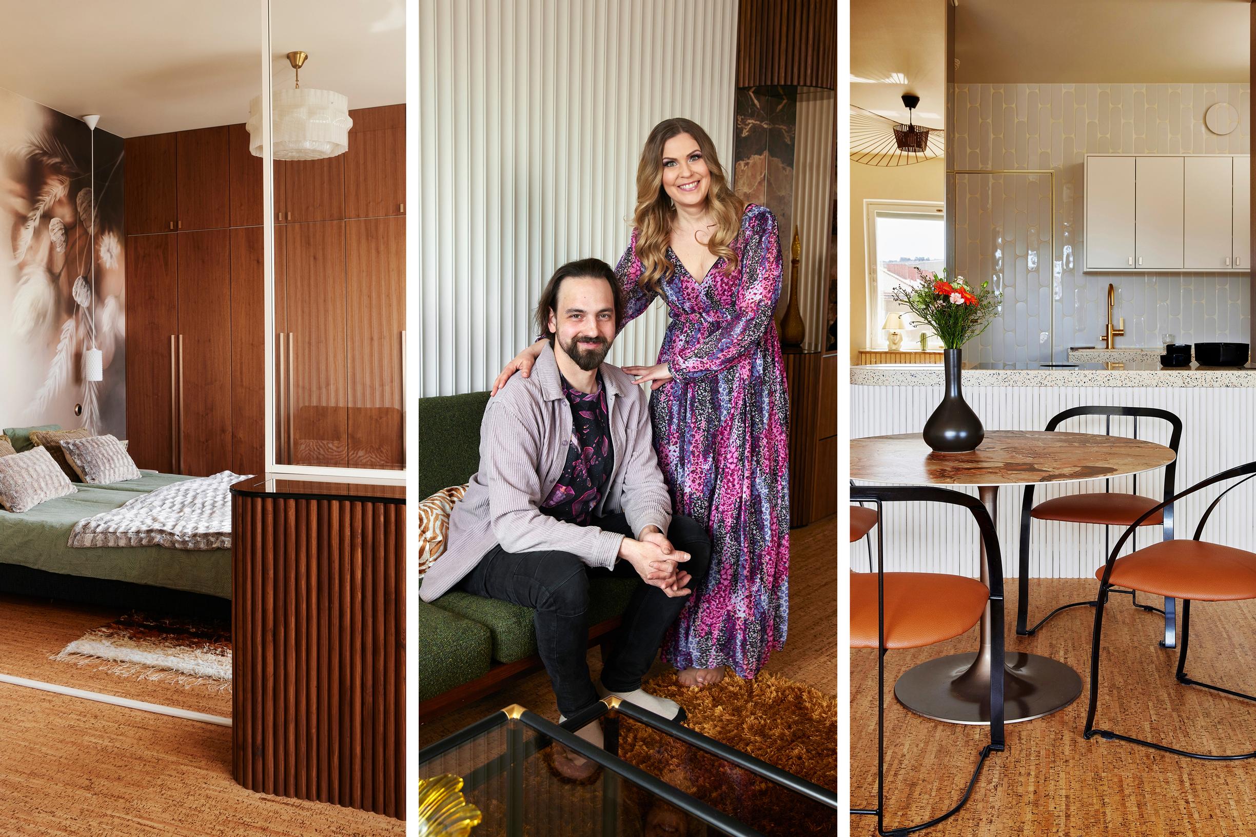 Asuntoflippaaja Meja Hynynen suunnitteli ja puoliso Matias Juvanen toteutti 50-luvun kerrostaloasunnon perusteellisen remontin. Hulppeassa neliössä ei ole säästelty pintamateriaaleissa eikä peileissä. Kalustuksen Meja metsästi käytettynä.