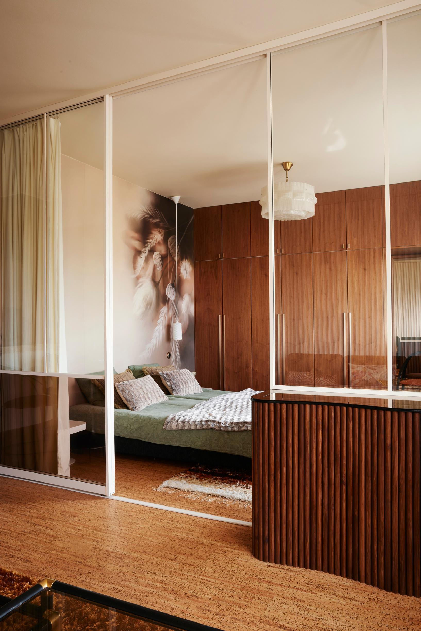 Olohuoneen ja makuutilan välissä ollut seinä ja raskas haitariovi korvattiin asunnon tilallisuutta ja valoisuutta lisäävällä lasiseinällä liukuovineen. Lasiseinä kiinnittyy veistokselliseen tasoon, johon on piilotettu kaukosäätimellä nouseva televisio.
