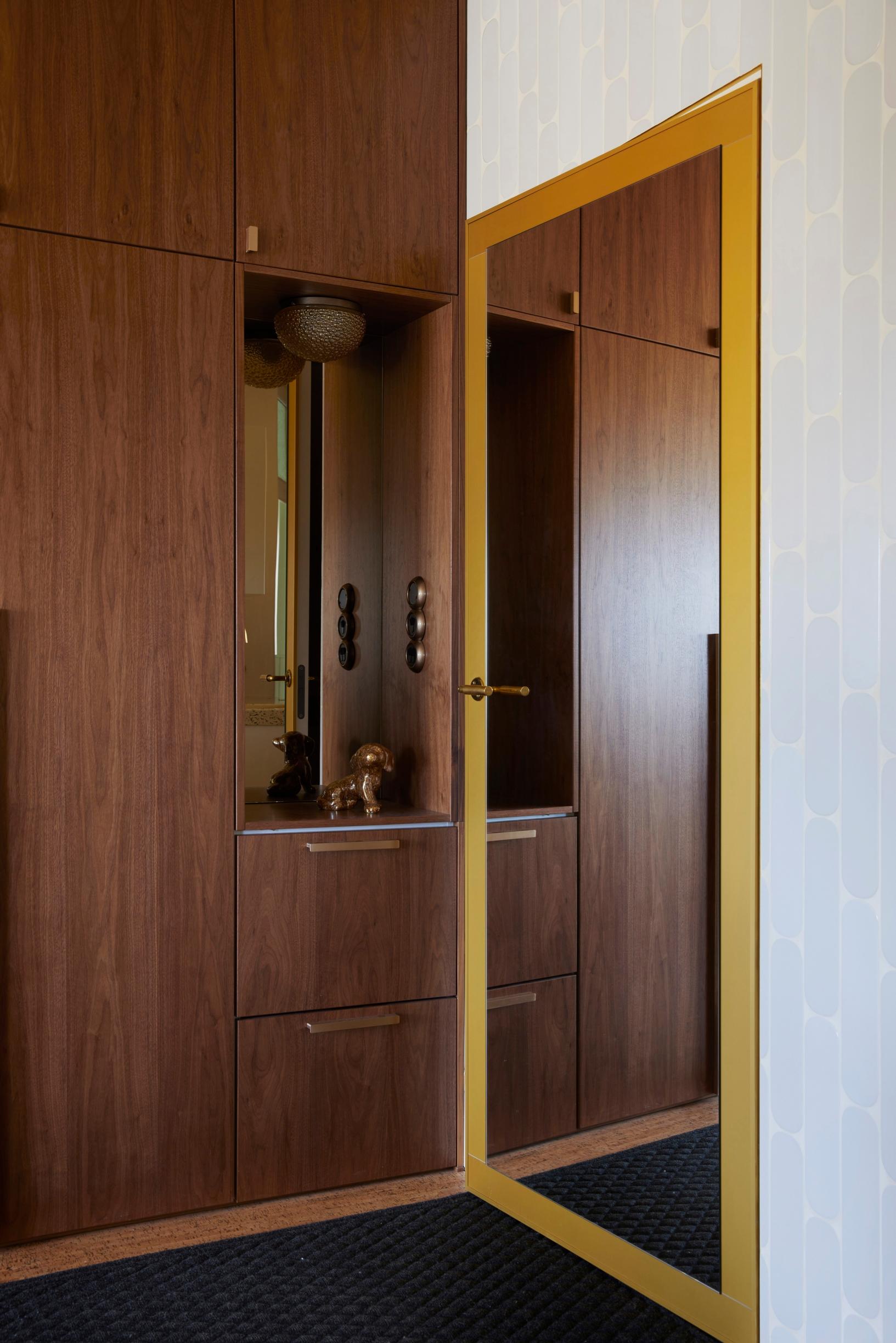 Eteisen vaatesäilytys on korkeassa pähkinäviilukaapistossa, joka ulottuu olohuoneeseen. Makuutilan peilisyvennyksen lisäksi eteisessä on mahdollisuus luoda viimeinen silmäys omaan ilmiasuun ennen lähtöä ulos.