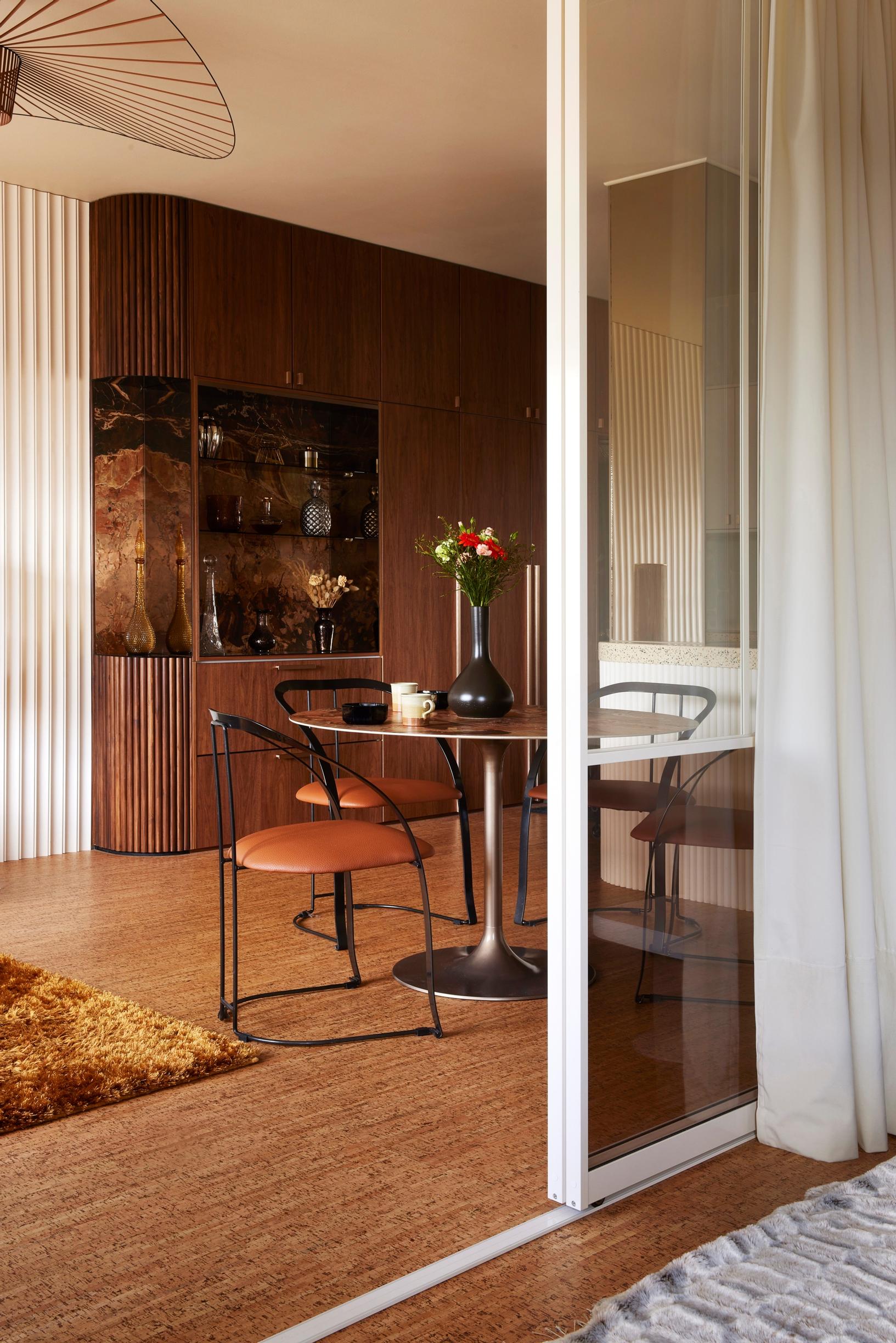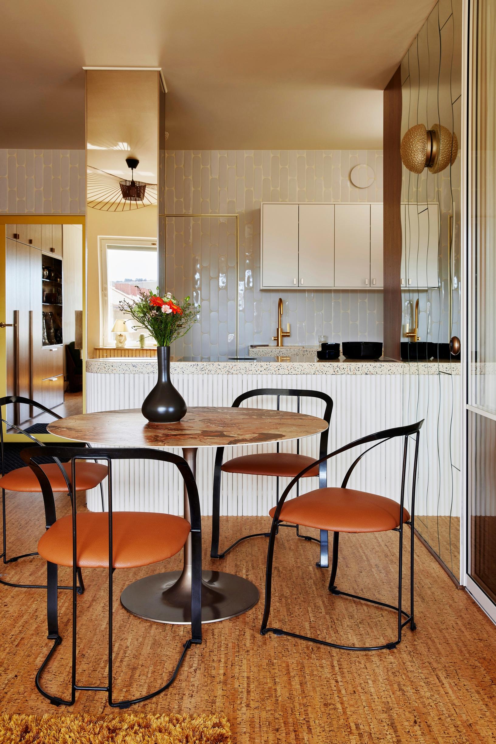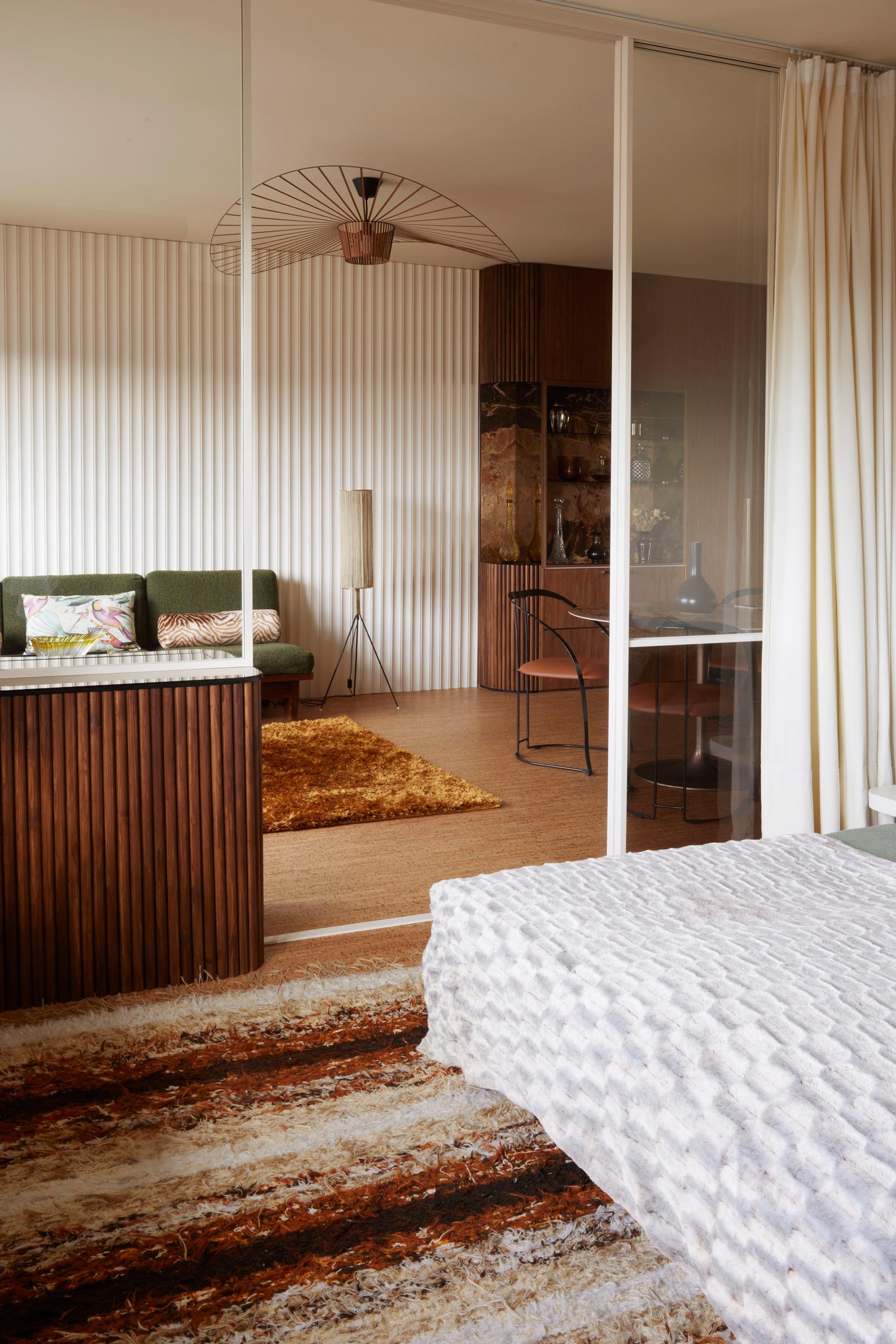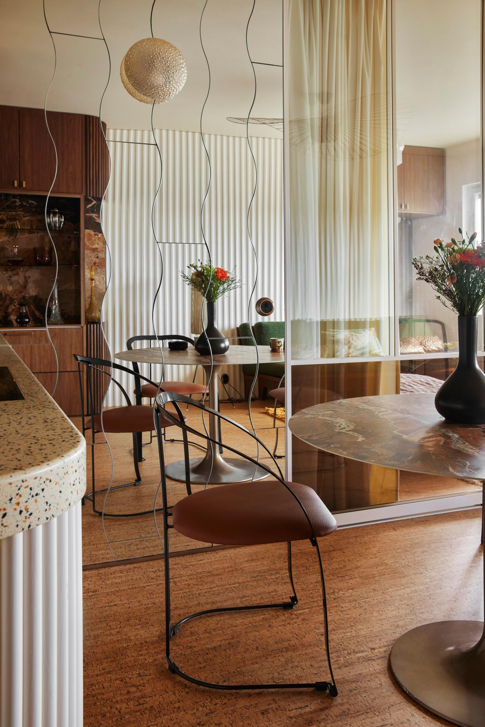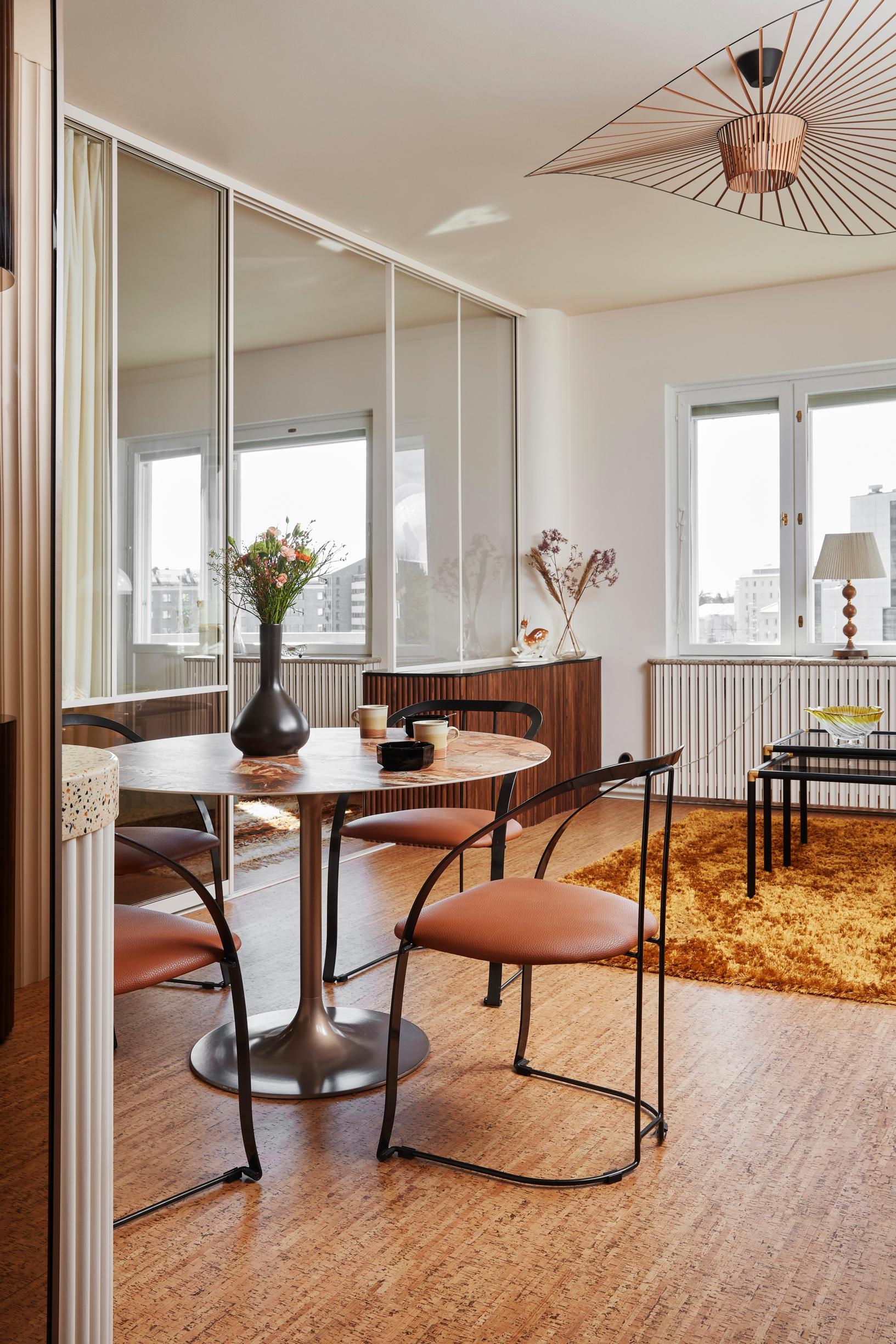 Eteisestä avautuvassa olohuoneessa silmät häikäistyvät aaltoilevilla peileillä päällystetystä seinästä ja pronssinsävyisestä peilipylväästä. Hulppea asunto Helsingin Töölössä on kalustettu 1970–80-lukujen huonekaluilla. Luovasti tuunatut kalusteet ja eri pintamateriaalien rohkea yhdistely on idearikkaan sisustussuunnittelijan Meja Hynysen tavaramerkki.